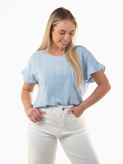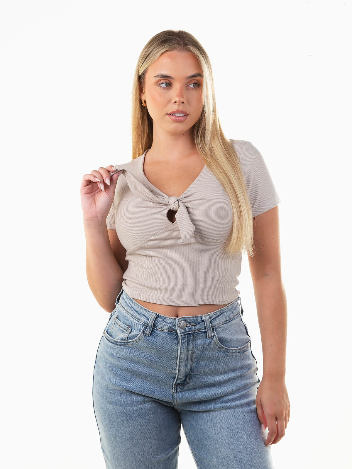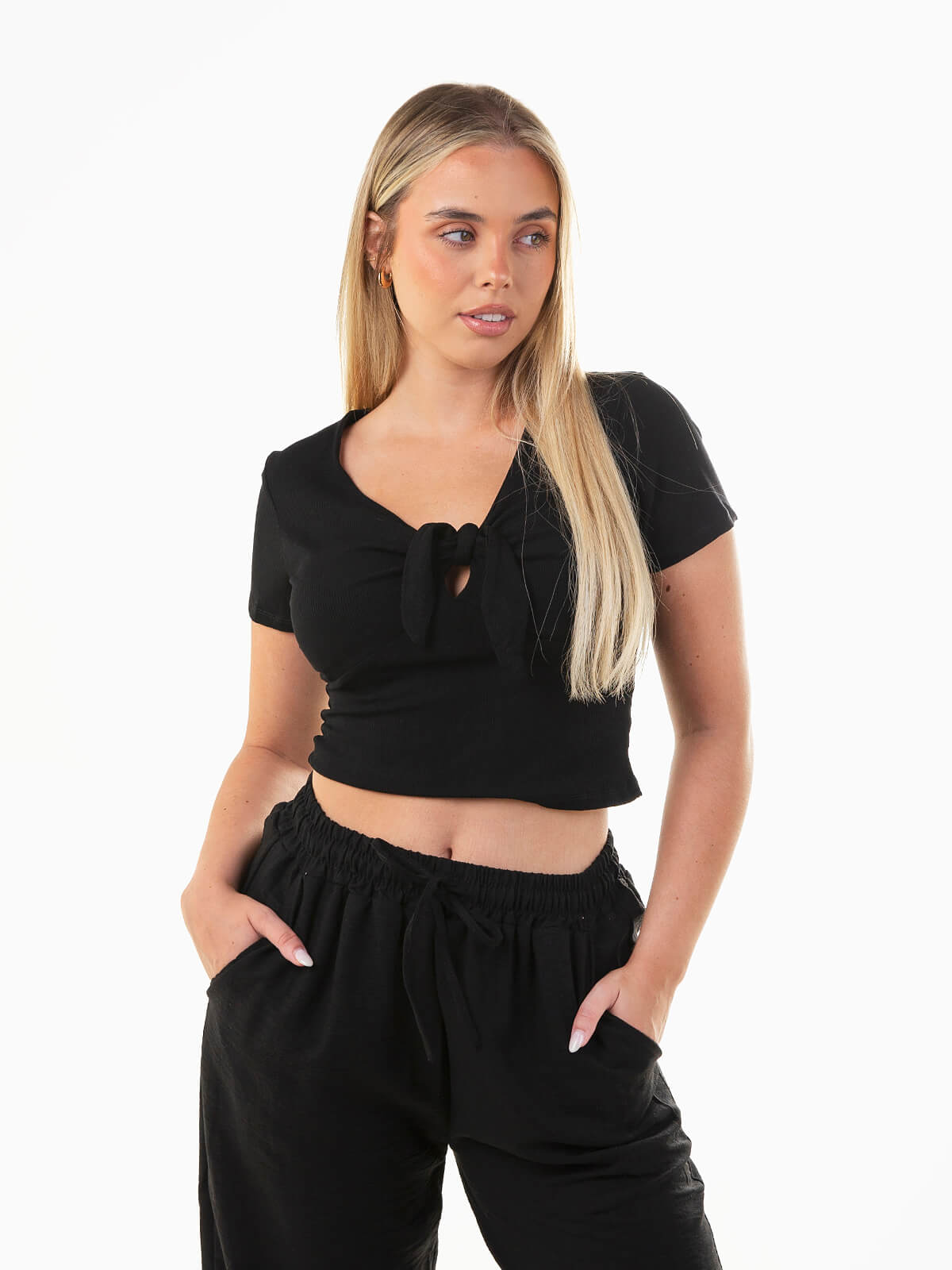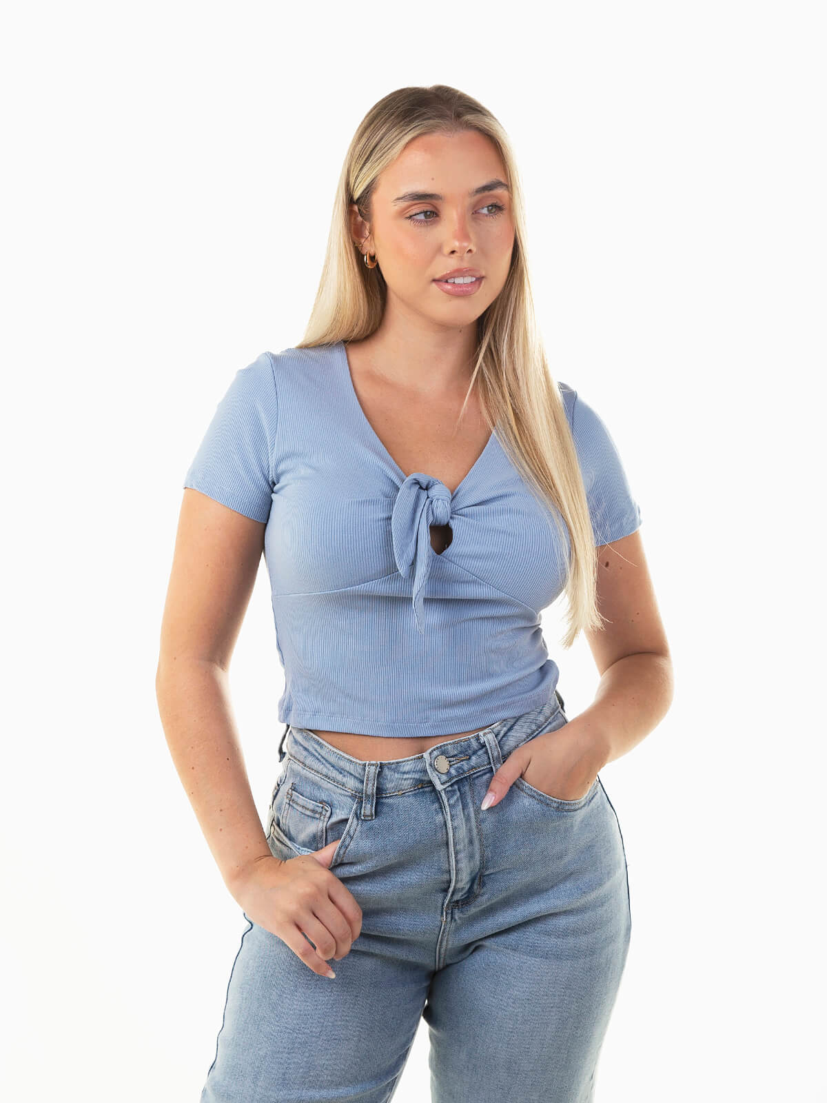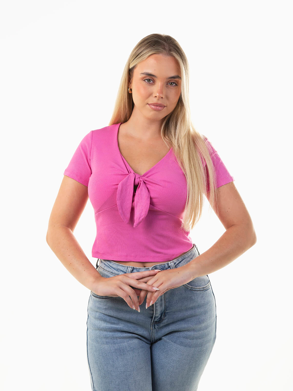 T-shirt malha canelada com manga curta e laço no peito com abertura. Modelo justo e elástico com decote em V, perfeito para combinar com calças fluídas ou jeans.