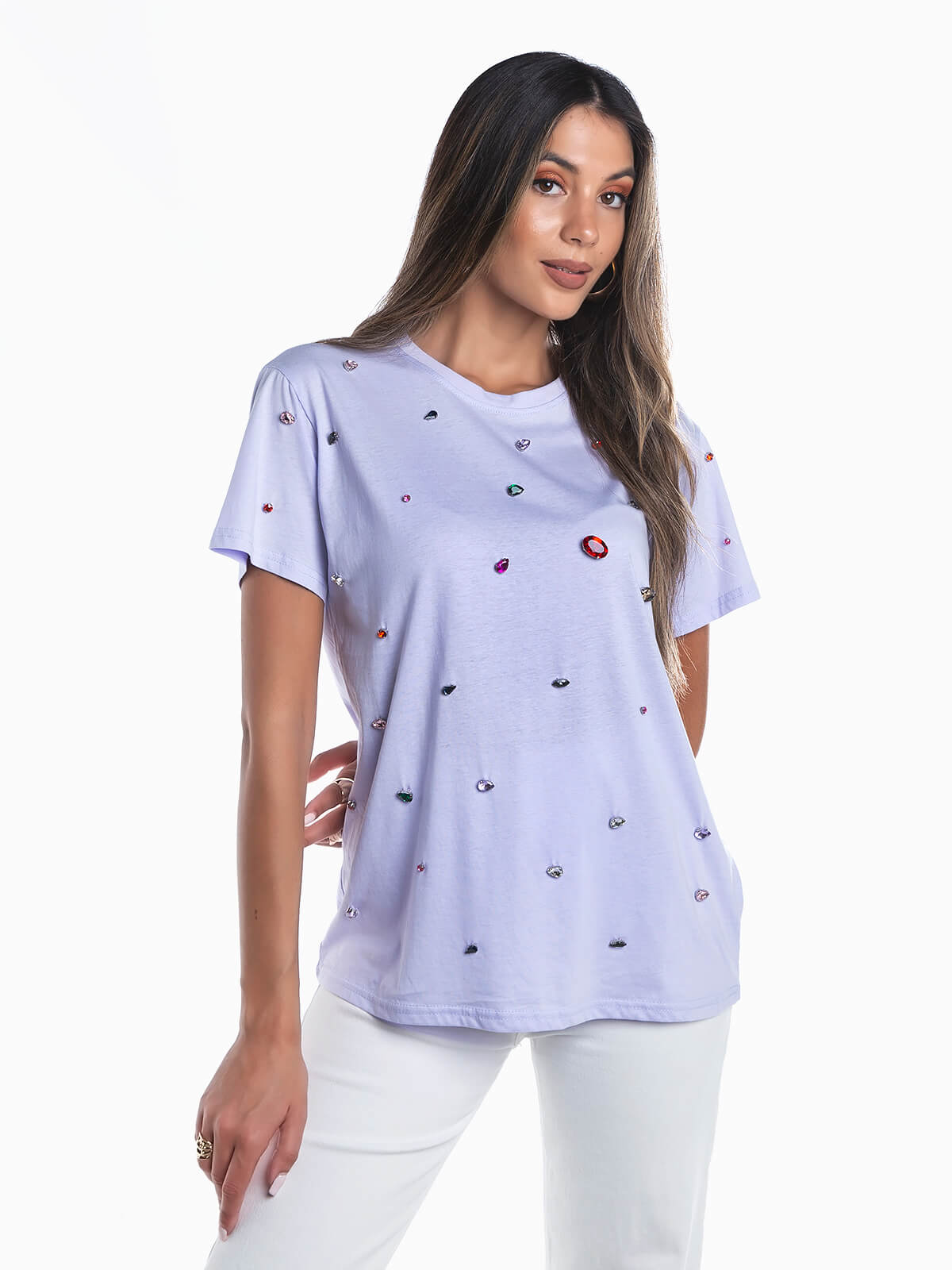 T-shirt de manga curta com jóias brilhantes aplicadas. T-shirt em tecido 100% algodão com decote redondo.