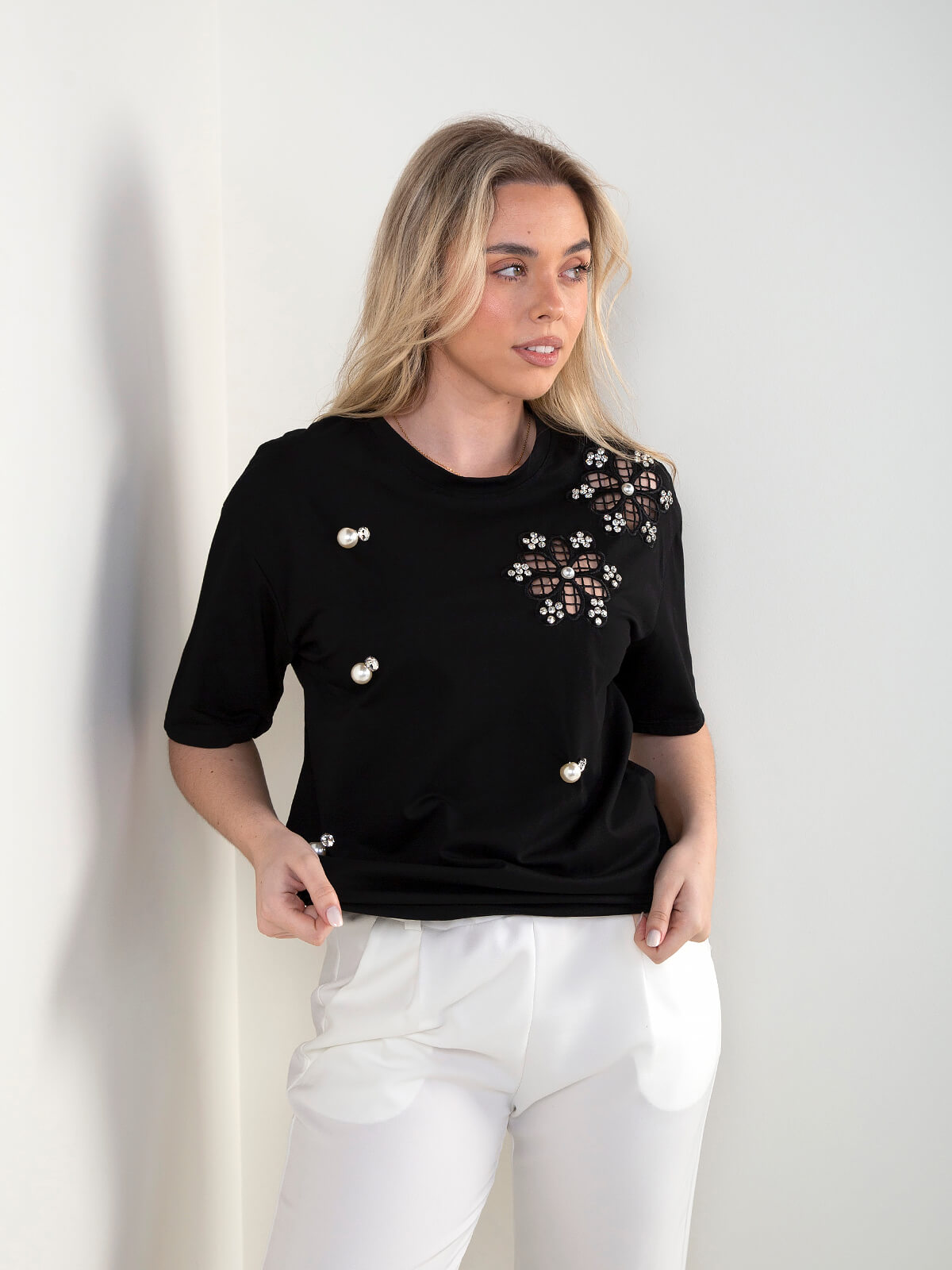 T-shirt oversized em algodão leve, com aplicações delicadas. Manga curta e decote redondo, ideal para looks casuais com um toque especial.