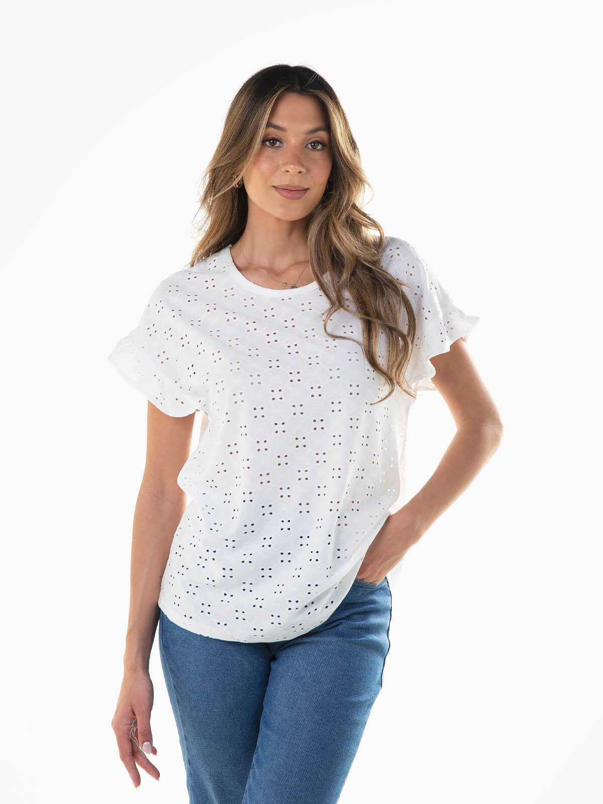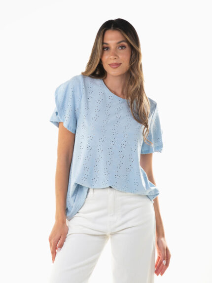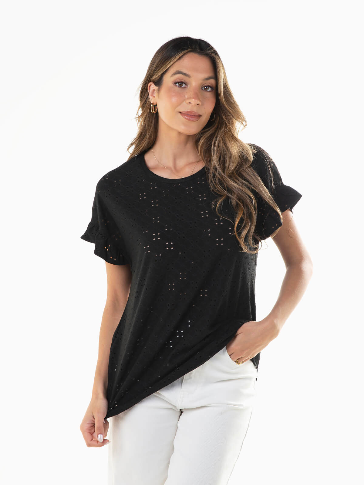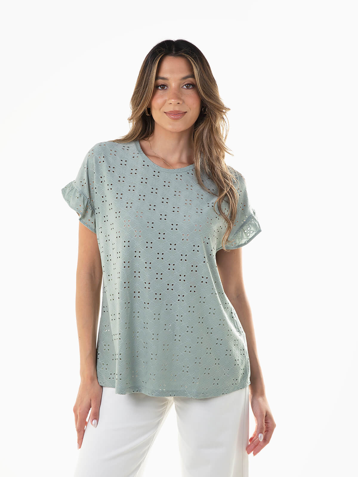 T-shirt de manga curta com encaixe de folho para senhora. Camisola larga com bordado inglês e decote redondo.