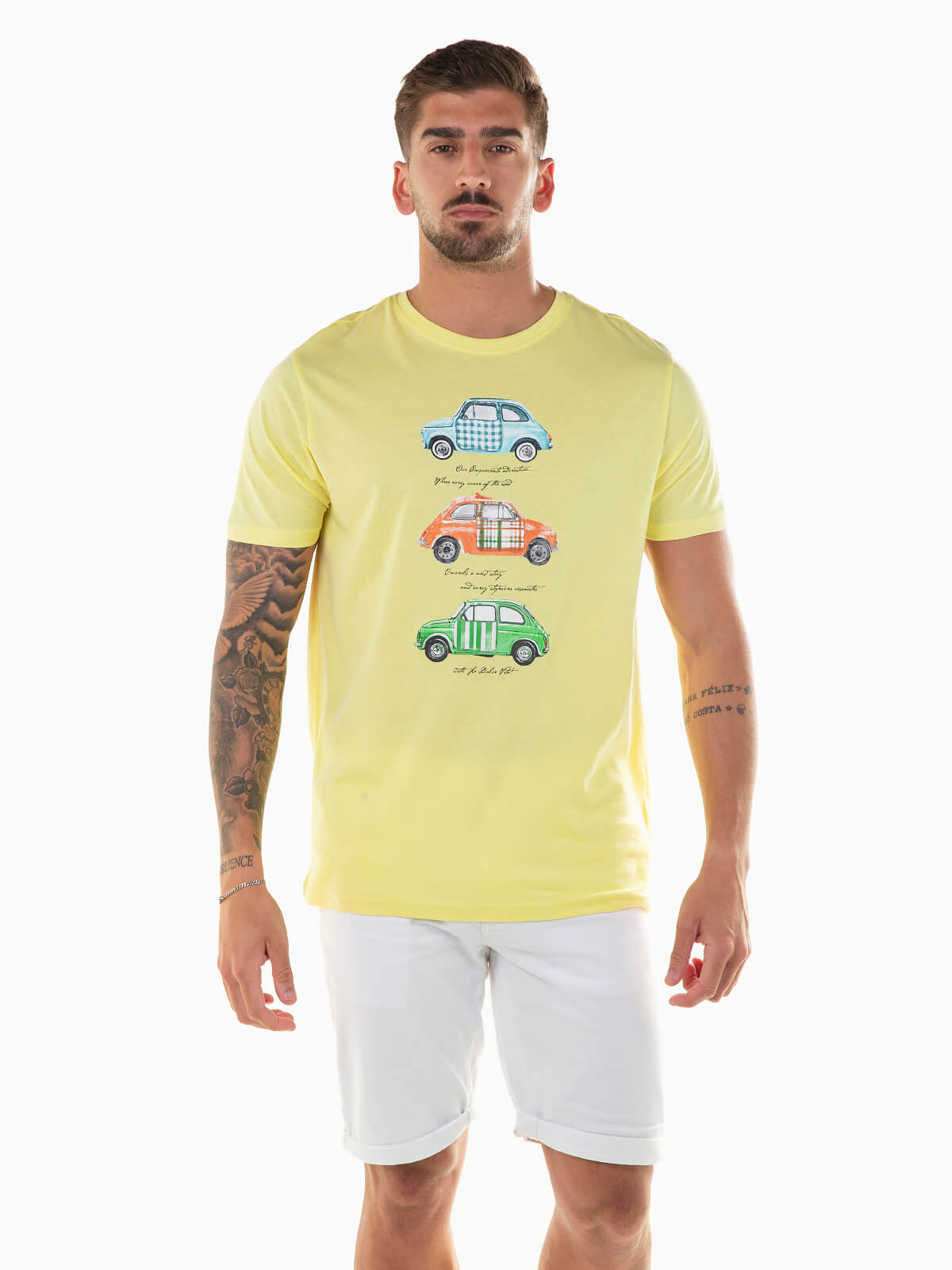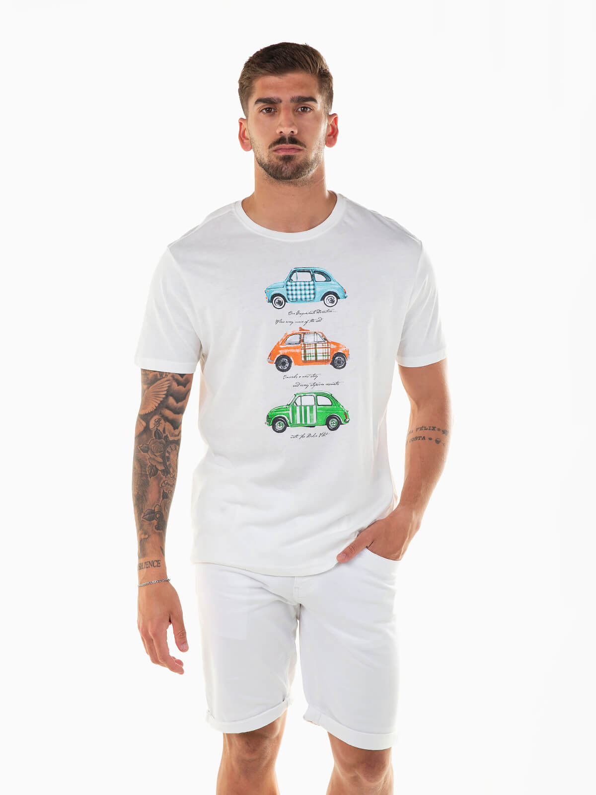 T-shirt de manga curta com carros coloridos estampados. T-shirt 100% algodão para homem com gola redonda.