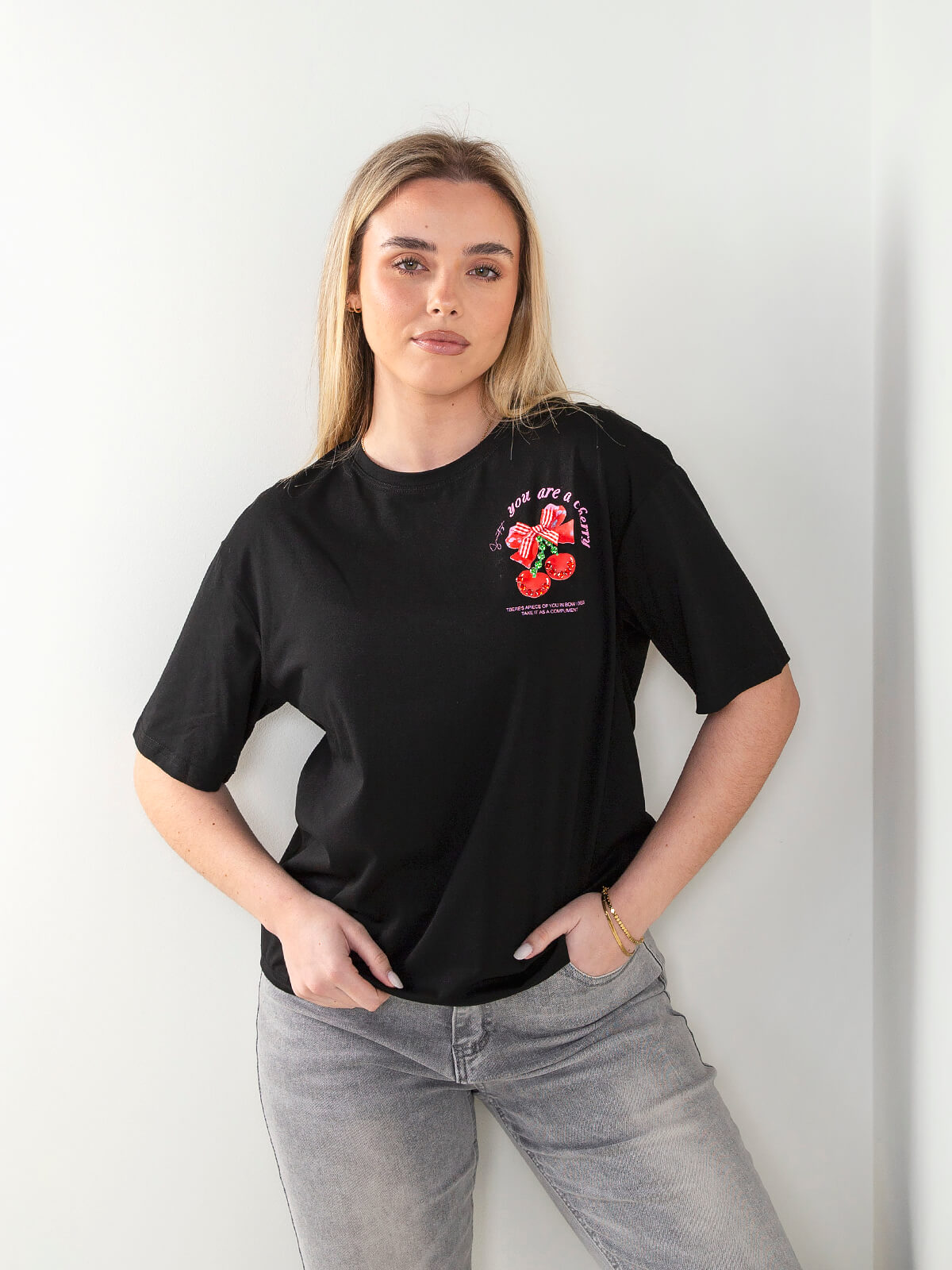 T-shirt de manga curta com estampado frontal de cerejas e detalhe em relevo com aplicação de brilhantes. Modelo descontraído, ideal para looks casuais com um toque divertido e tendência. Perfeita para conjugar com jeans, saias ou calças de cintura alta.