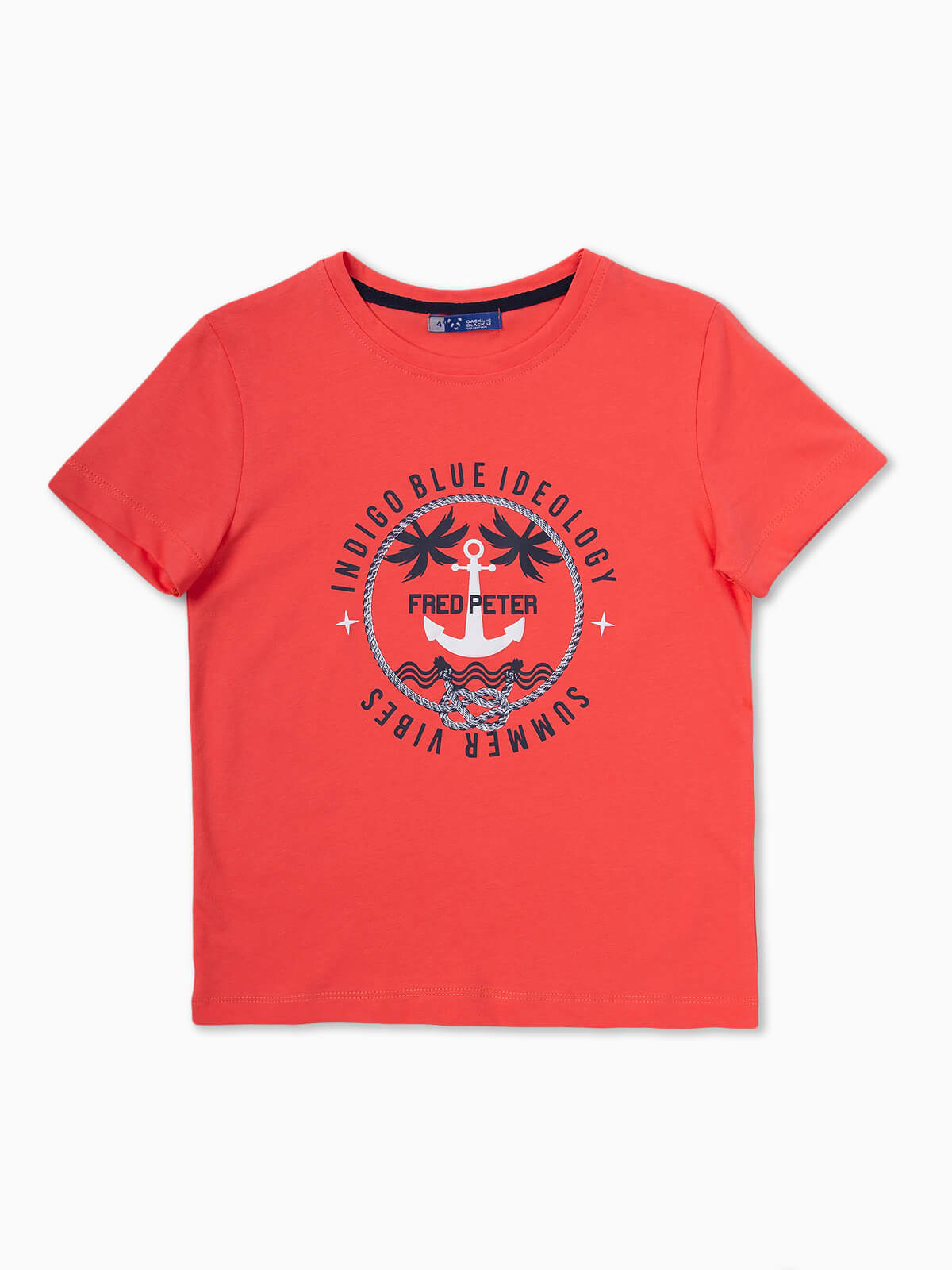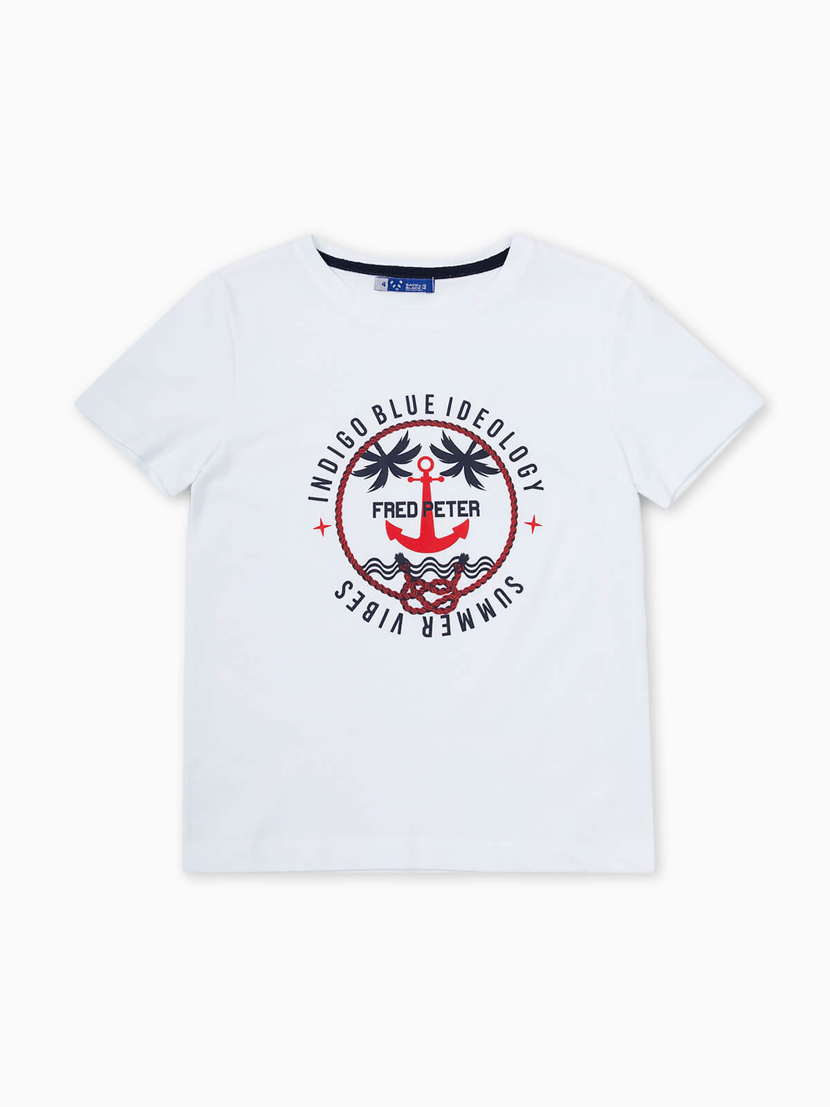 T-shirt de manga curta com círculo estampado e âncora no peito para menino. T-shirt em tecido 100% algodão com gola redonda.