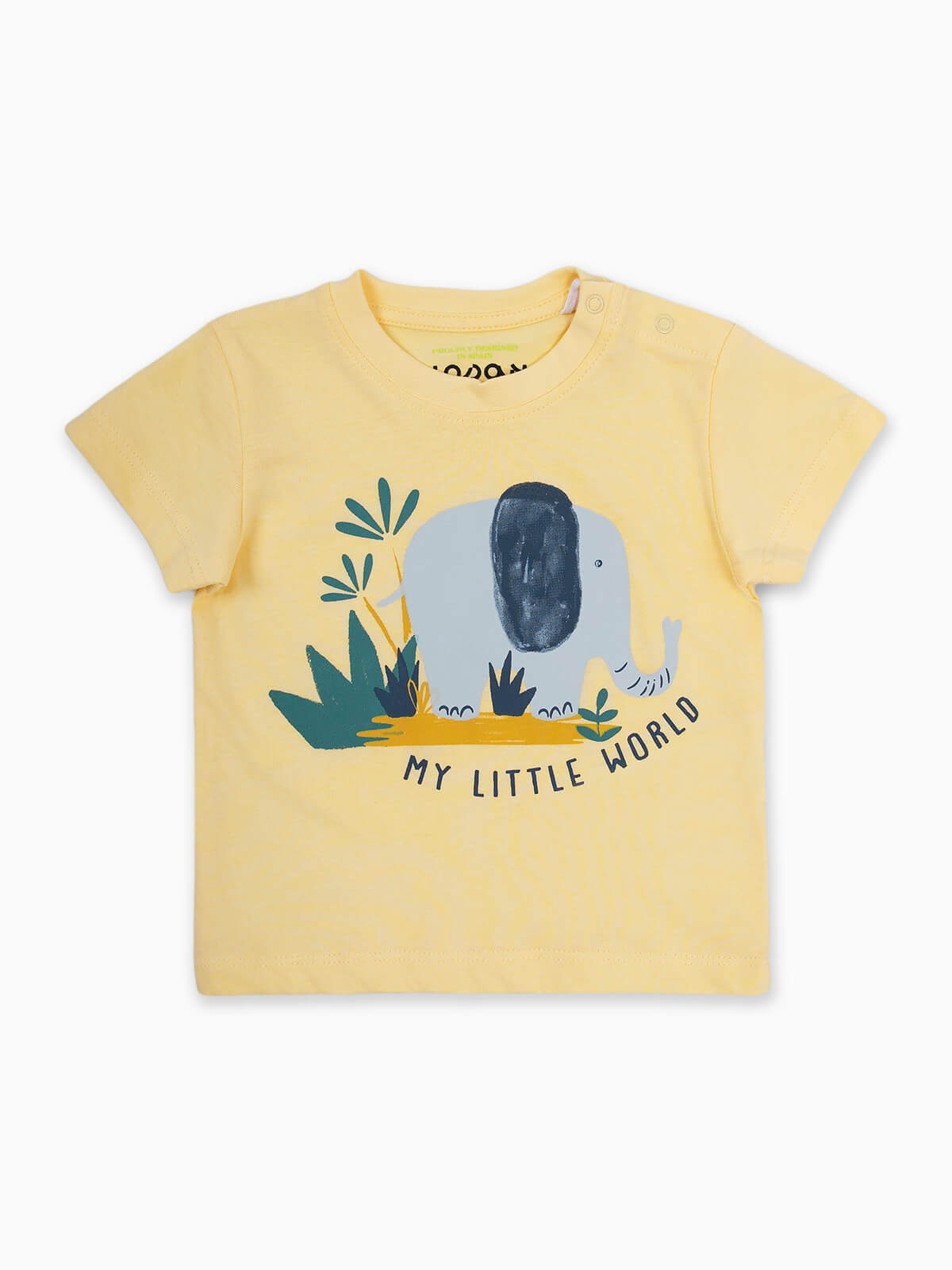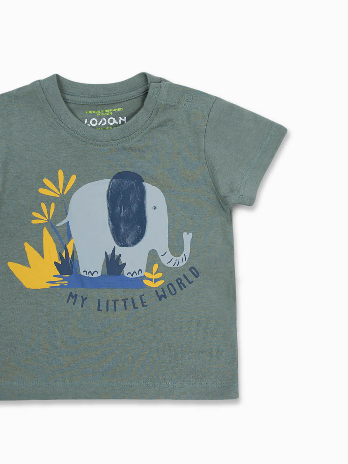 T-shirt de manga curta com elefante estampado. T-shirt para bebé menino com gola redonda e aperto de botoes de pressão.