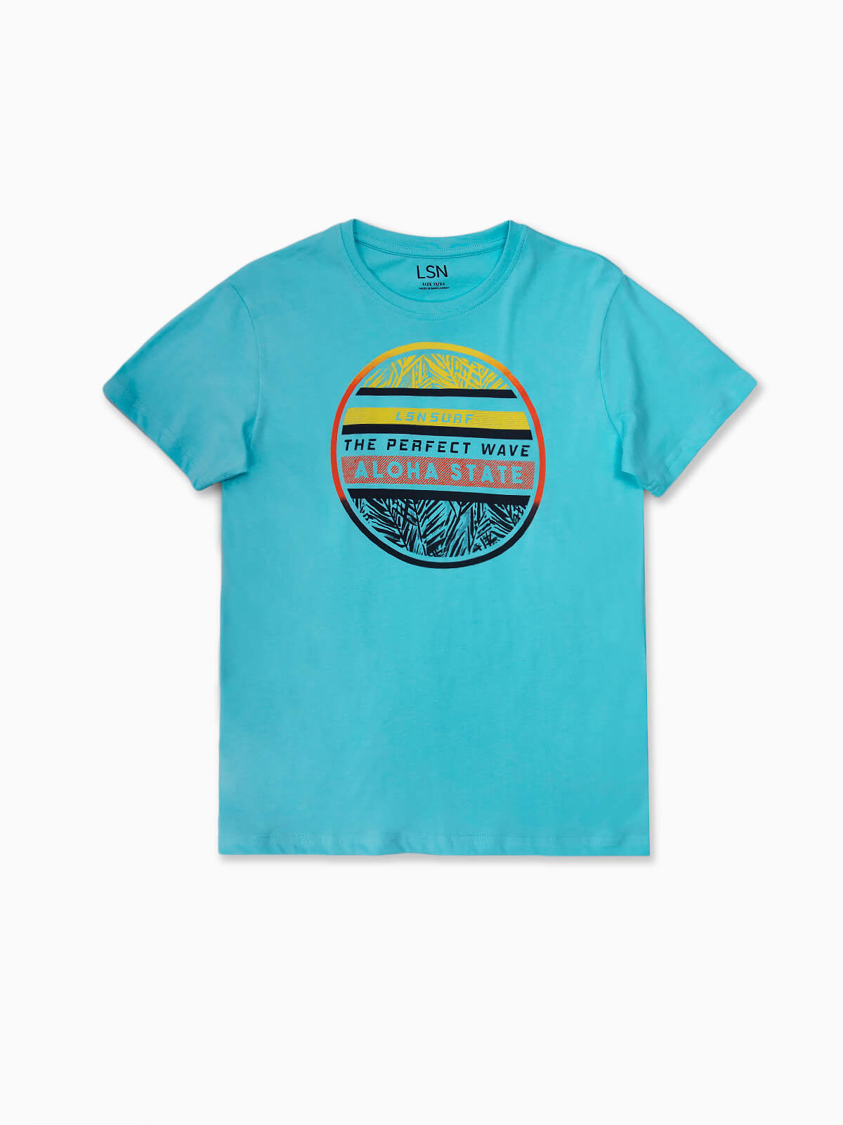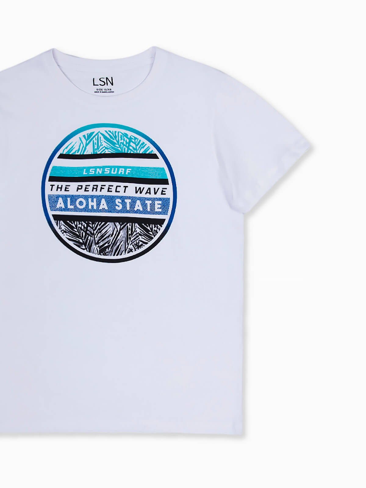 T-shirt de manga curta em 100% algodão para menino. T-shirt com estampado de círculo e letras. Gola redonda.