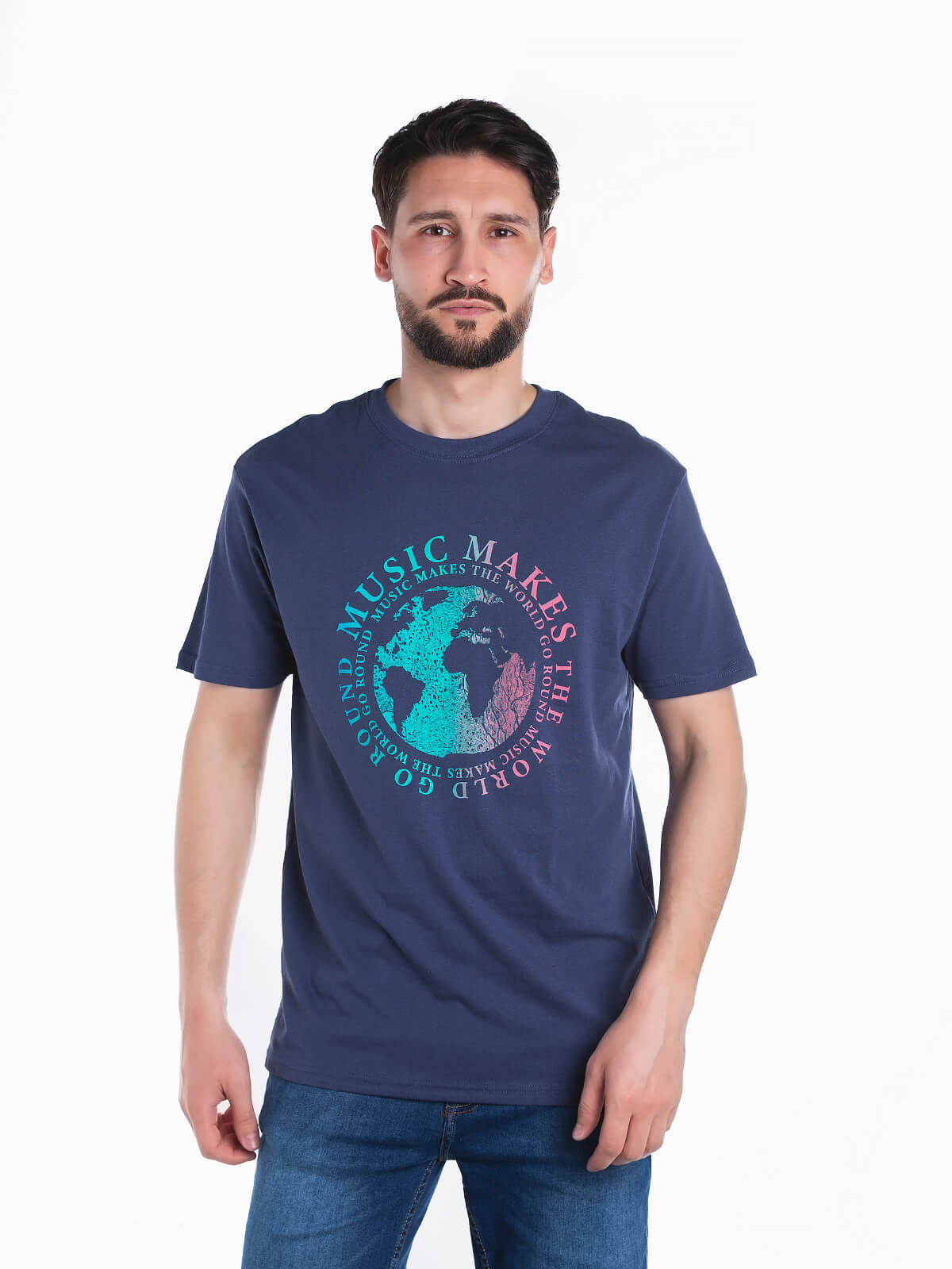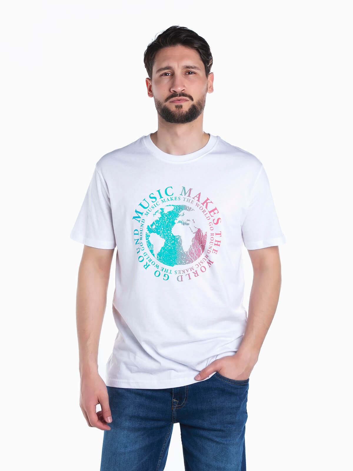 T-shirt de manga curta com estampado colorido para homem. T-shirt com tecido 100% algodão com gola redonda.