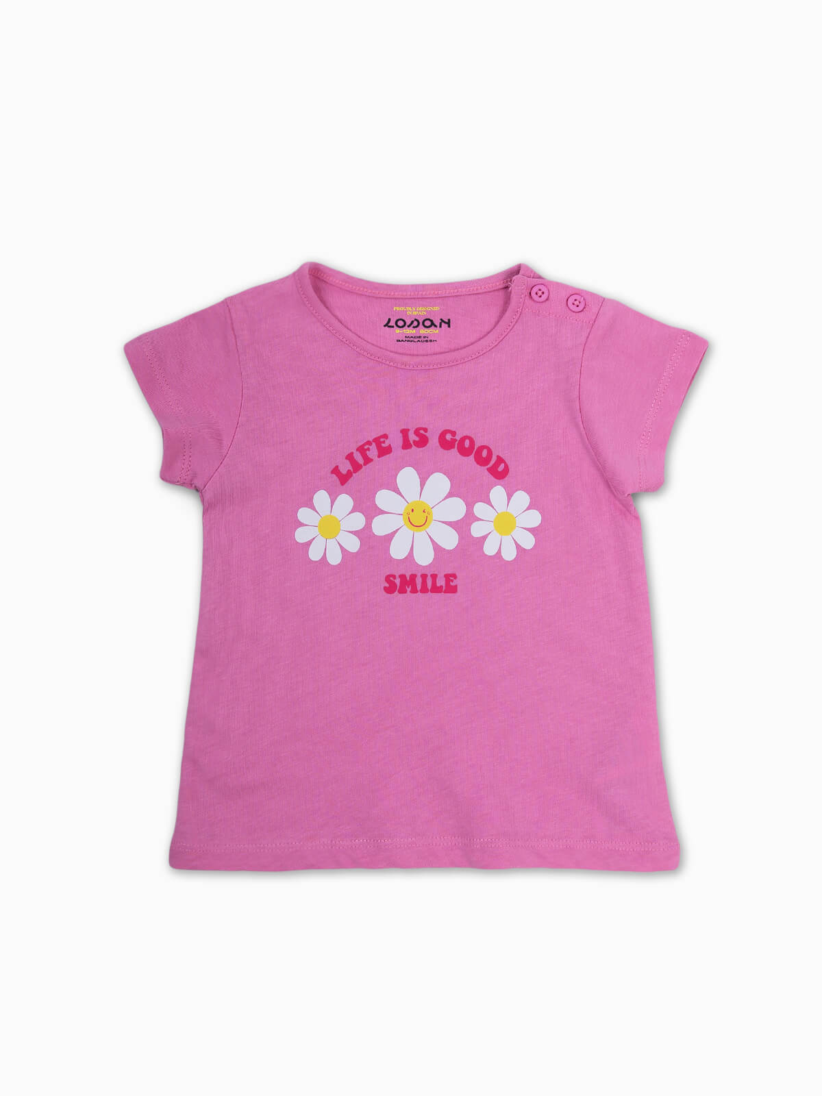 T-shirt de manga curta com estampado de flores e letras. T-shirt para bebé menina com decote redondo e aperto de dois botões.