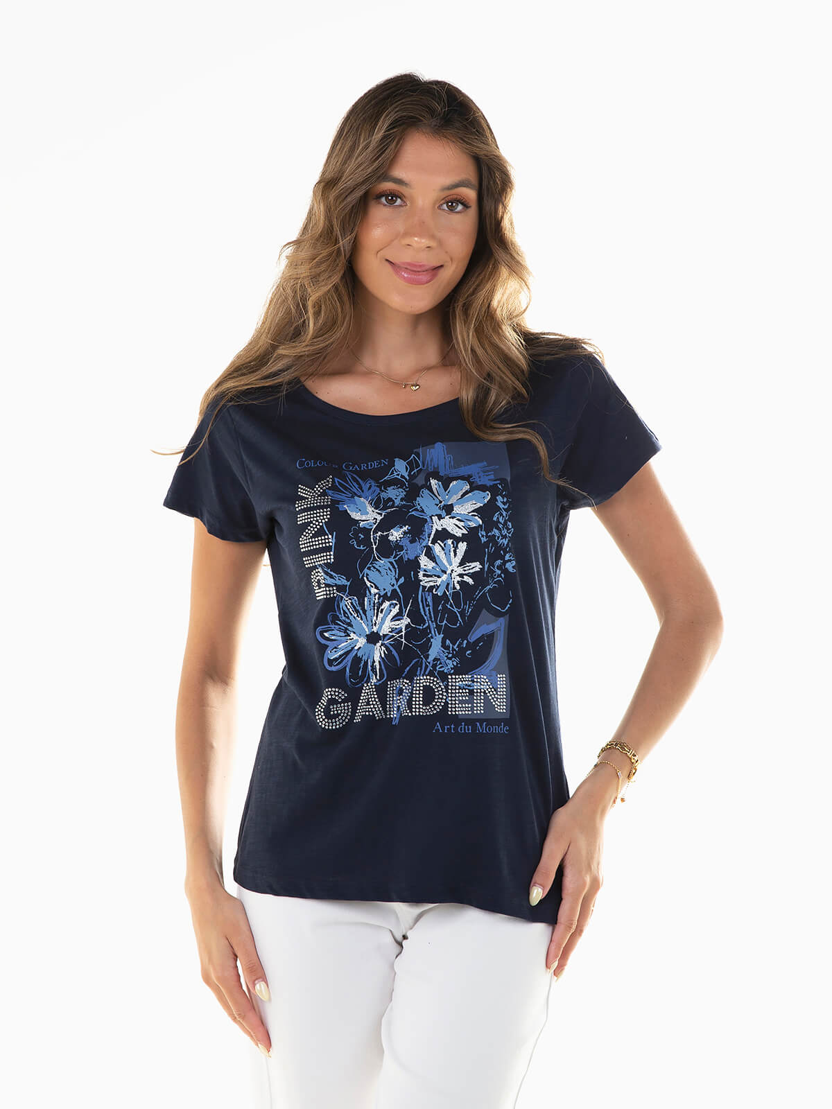 T-shirt de manga curta com flores estampadas e strass aplicado. T-shirt para senhora com decote redondo.