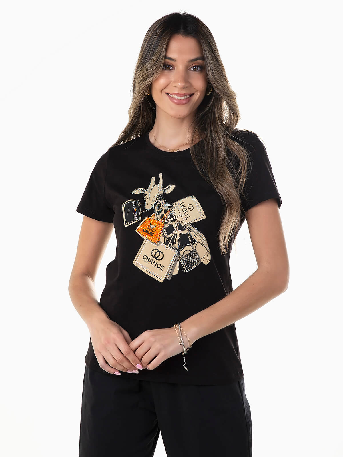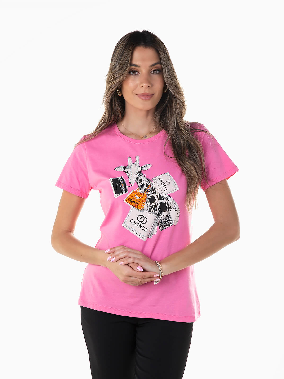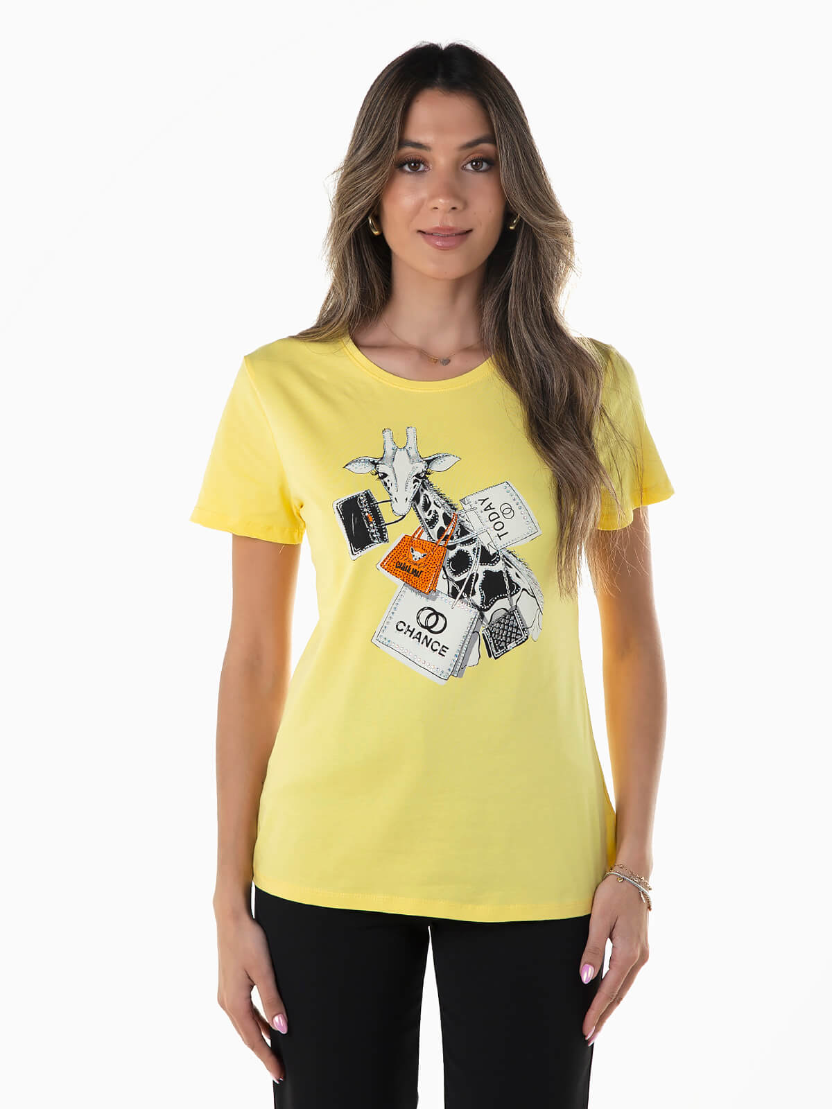 T-shirt de manga curta com girafa estampada e pormenores brilhantes. T-shirt para senhora com decote redondo.