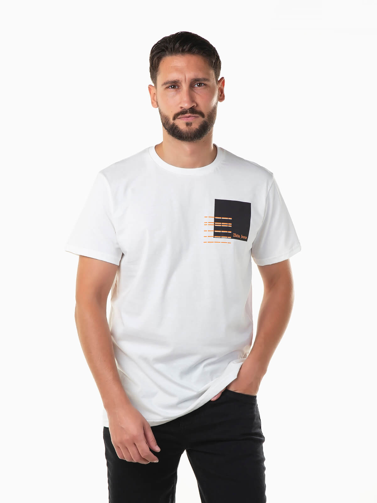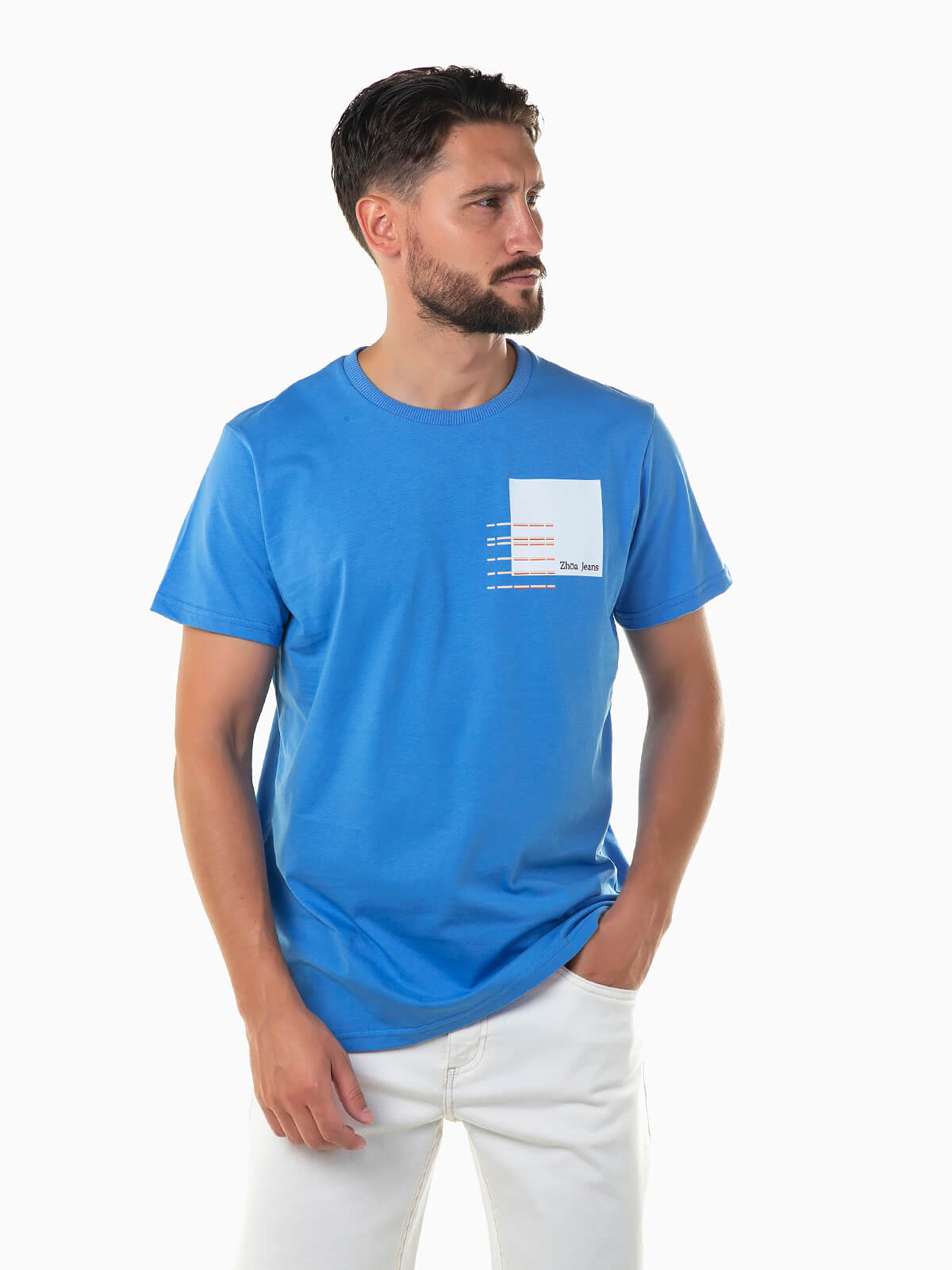 T-shirt de manga curta com gráfico estampado no peito. T-shirt para homem com gola redonda.