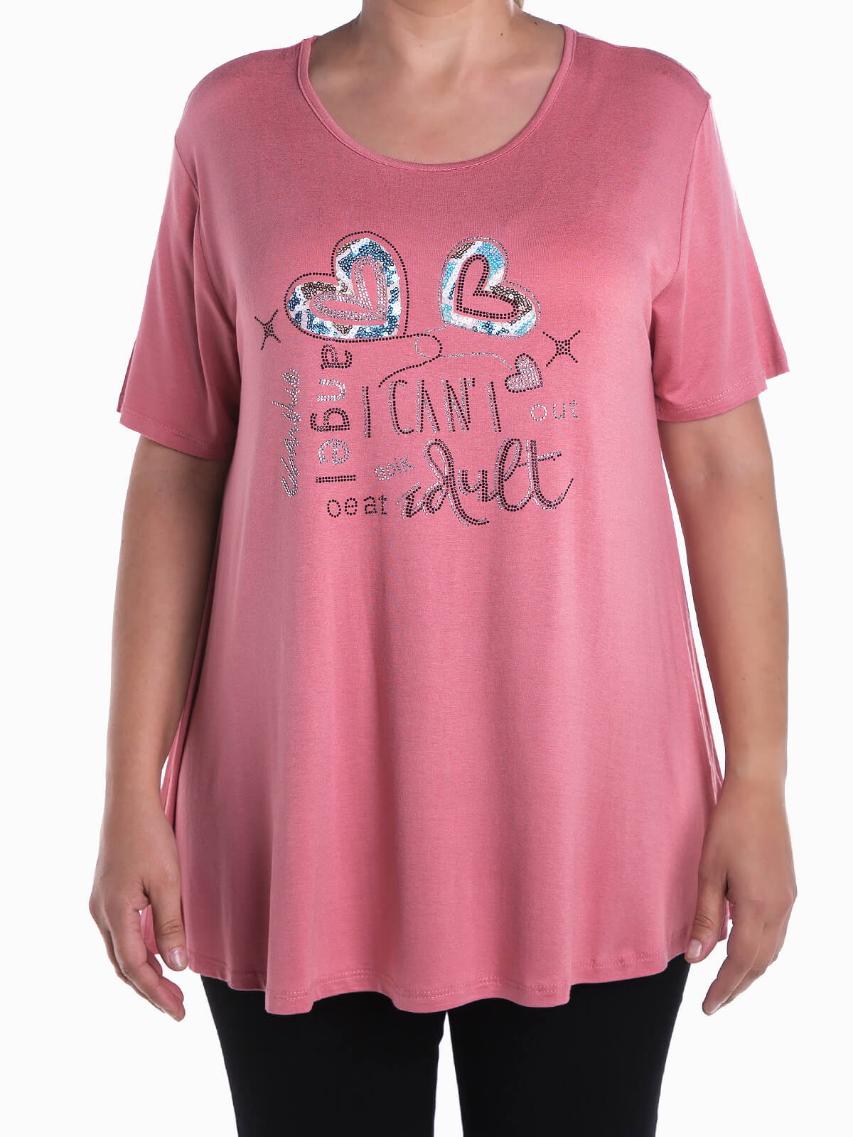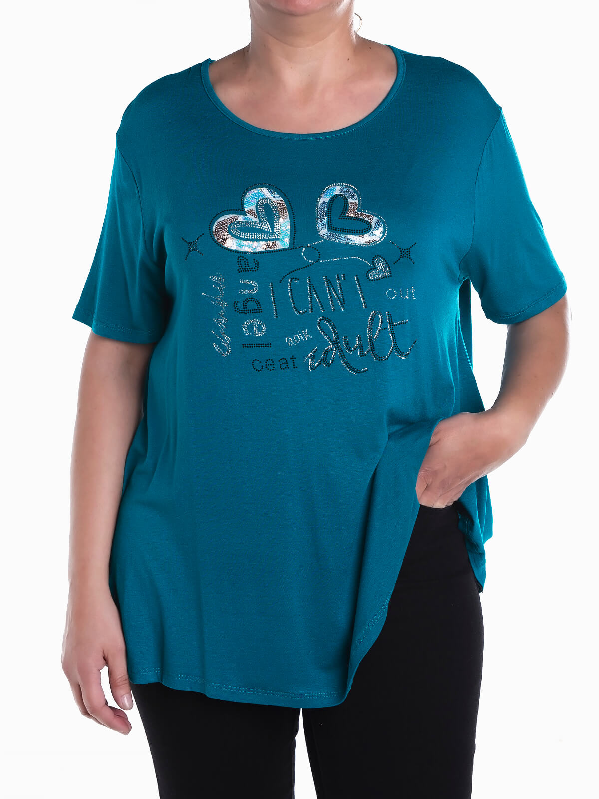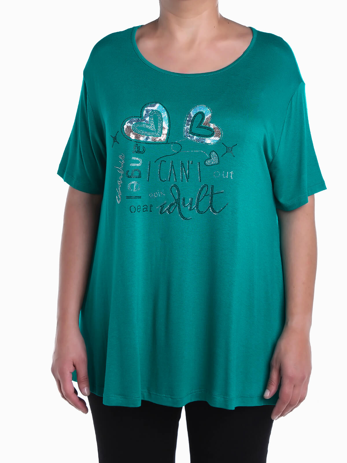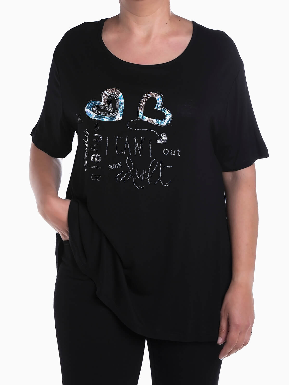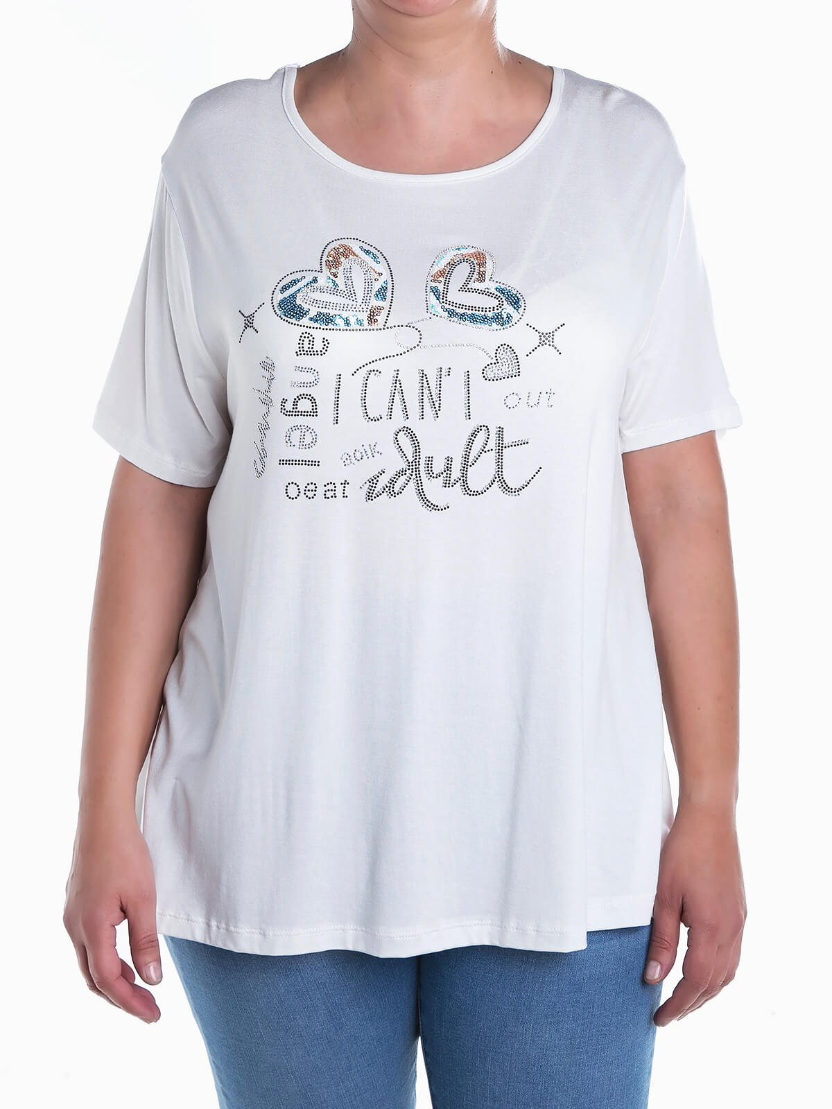 T-shirt de manga curta com lantejoulas e brilhos aplicados no estampado. T-shirt com decote redondo.