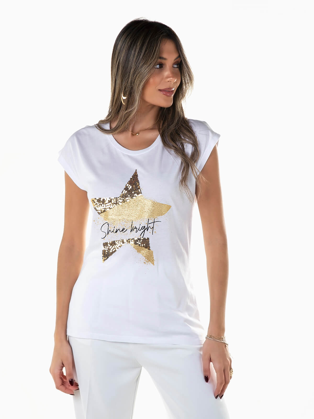 T-shirt manga curta com estampado brilhante e lantejoulas aplicadas. T-shirt para senhora com decote redondo.