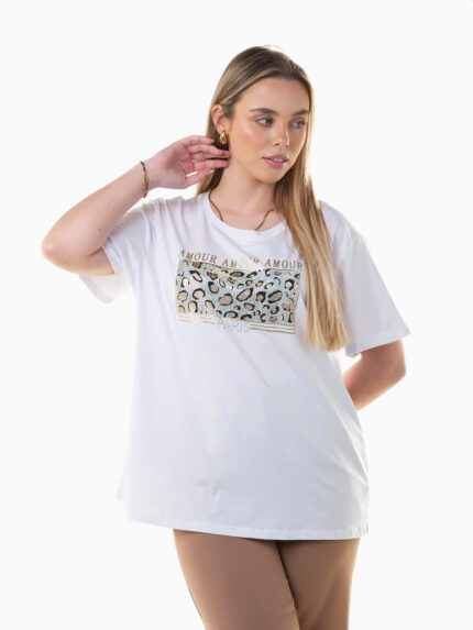 T-shirt de manga curta com estampado no peito e lantejoulas prateadas aplicadas. T-shirt para mulher com decote redondo.