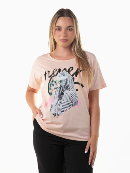 T-shirt de manga curta para mulher com decote redondo. Motivos bordados no peito com lantejoulas. Dobra na manga.