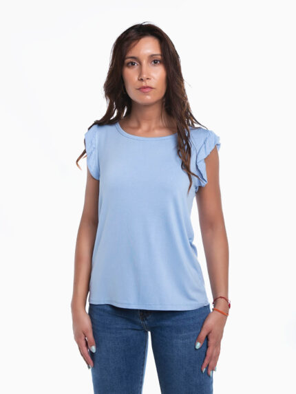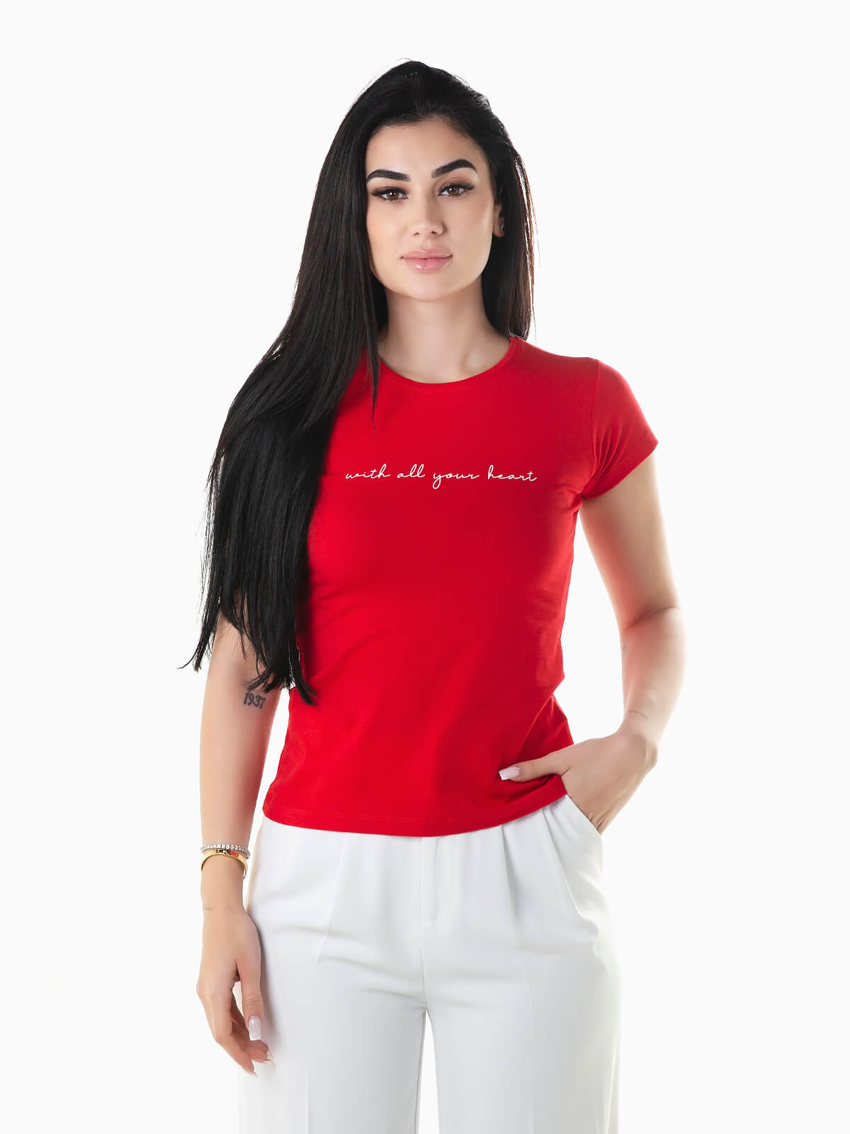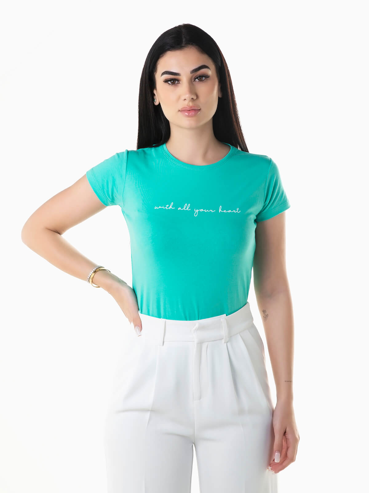 T-shirt de manga curta com mensagem estampada no peito. T-shirt para senhora com decote redondo.