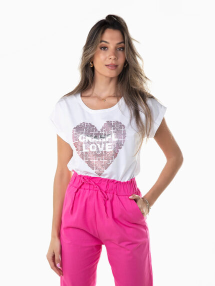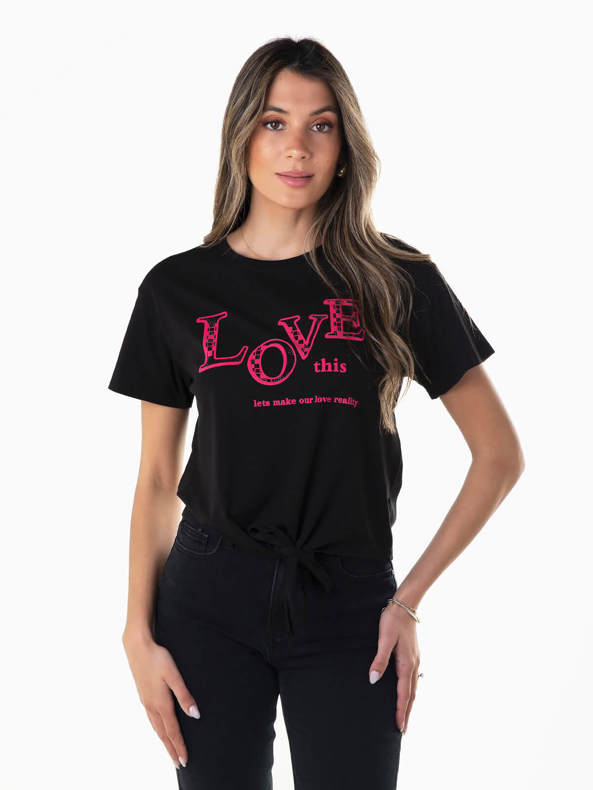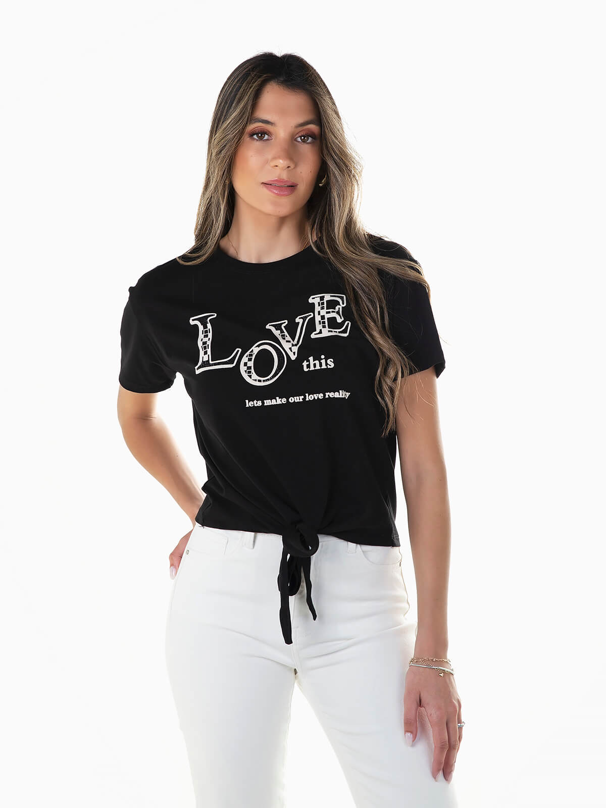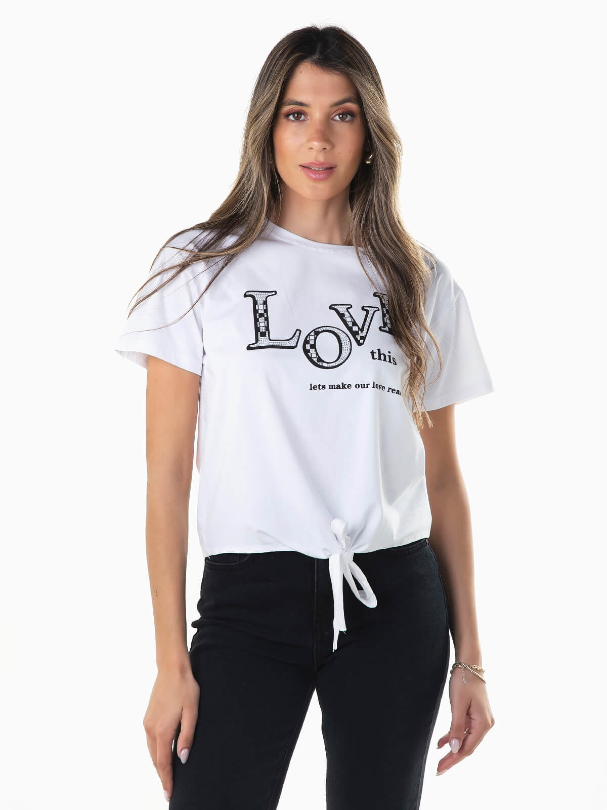 T-shirt de manga curta com nó na base para ajustar. T-shirt com estampado de letras no peito e decote redondo.