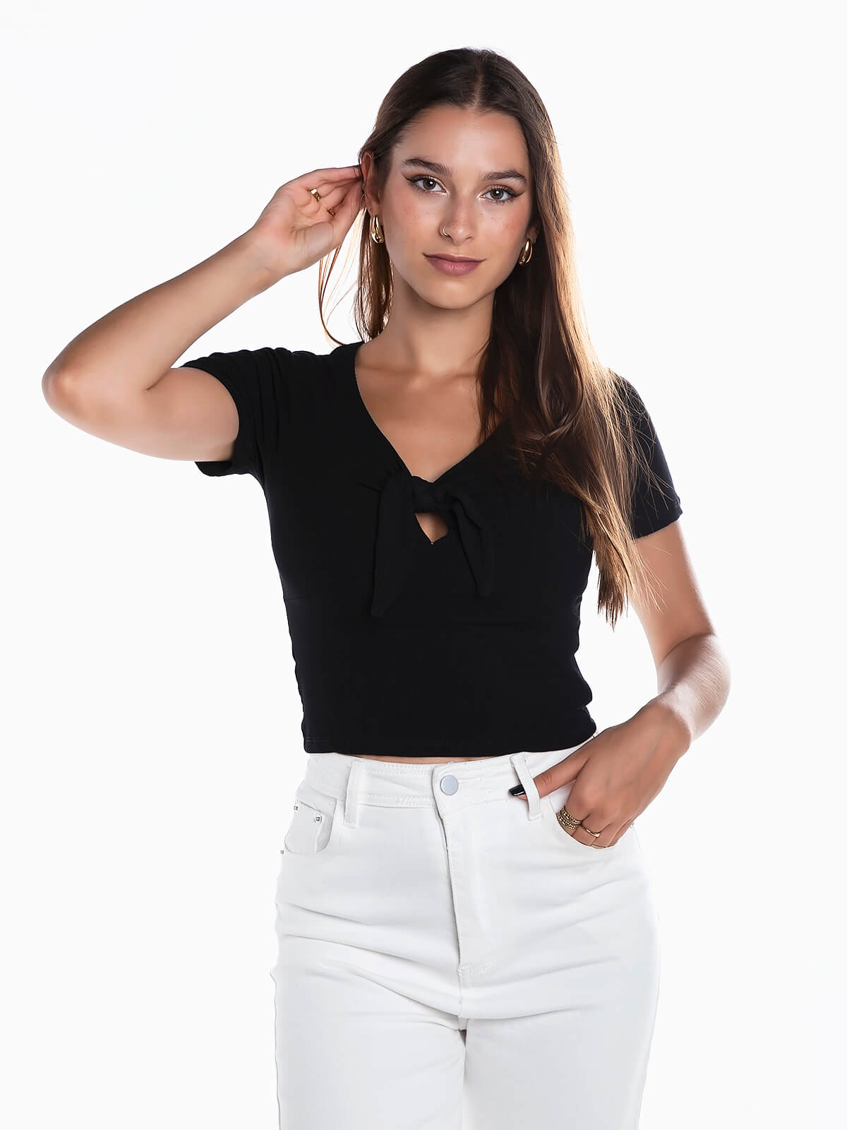 T-shirt de manga curta com detalhe aberto e nó. T-shirt malha canelada com decote em bico.
