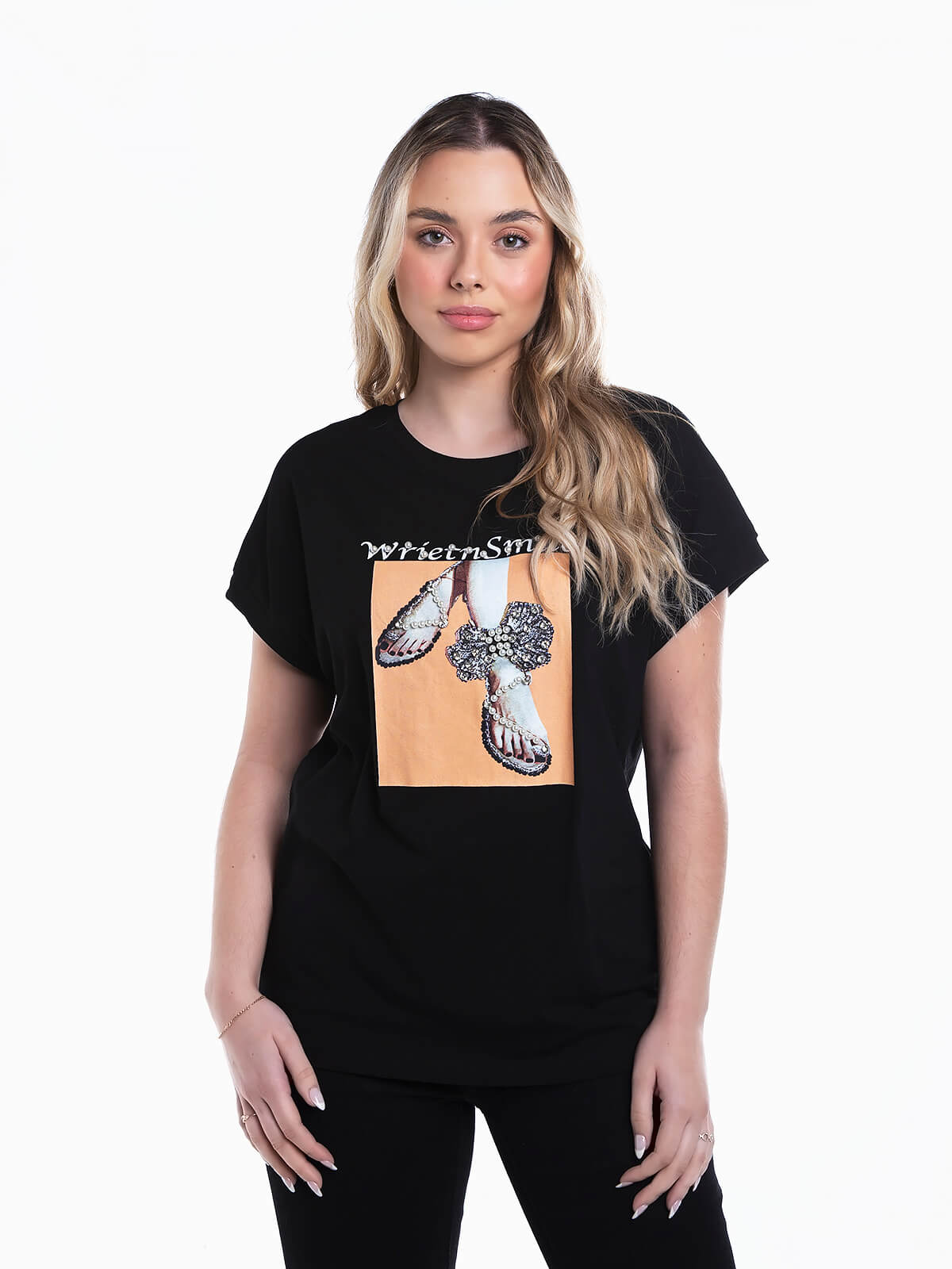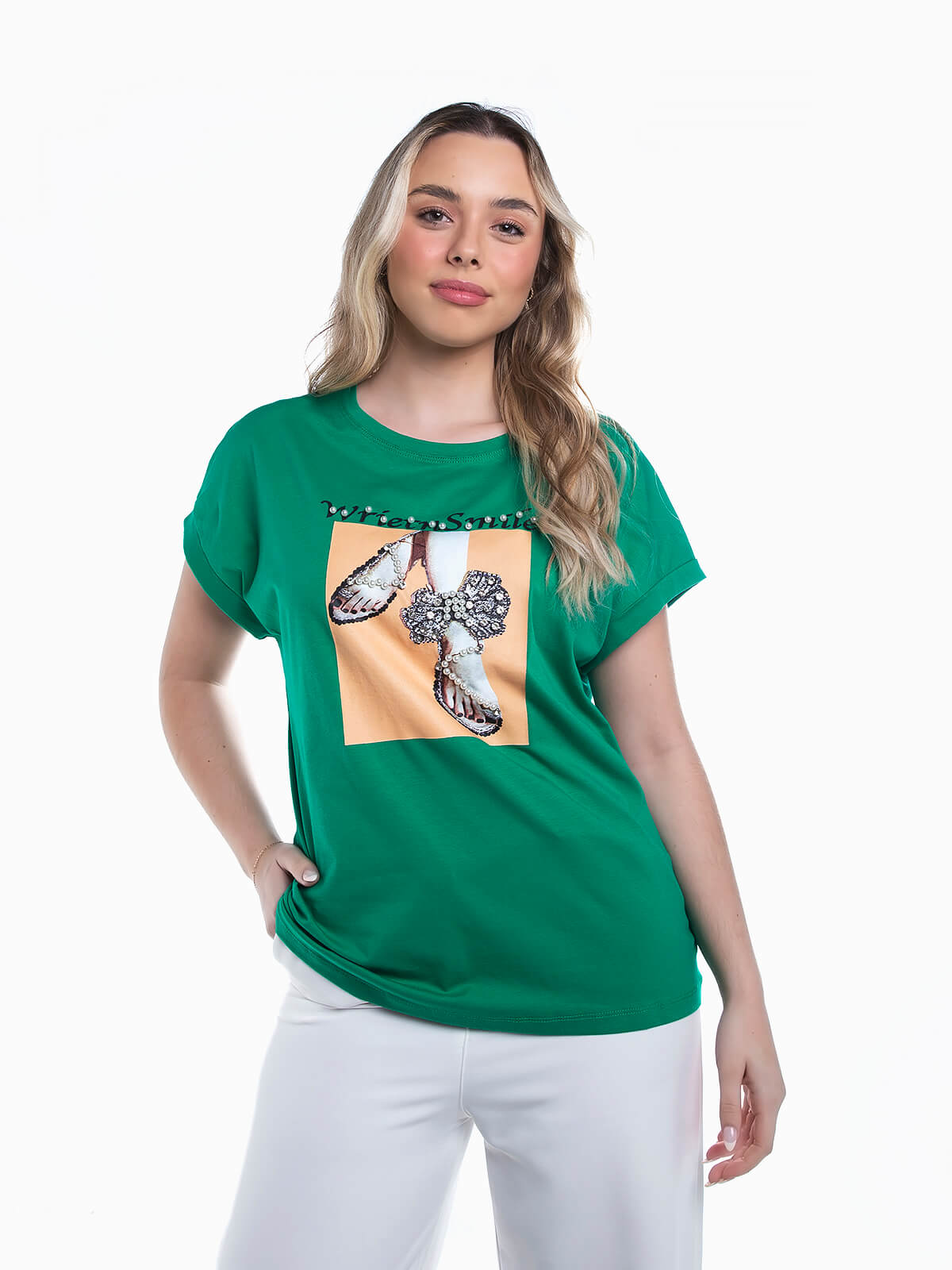 T-shirt de manga curta com pérolas aplicadas no estampado. T-shirt com decote redondo.