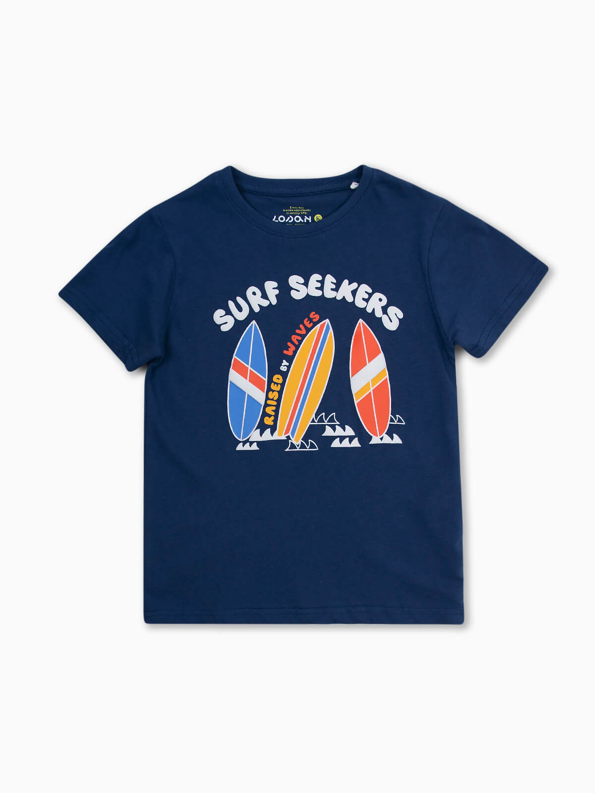 T-shirt de manga curta com estampado de pranchas de surf. T-shirt para menino com gola redonda.