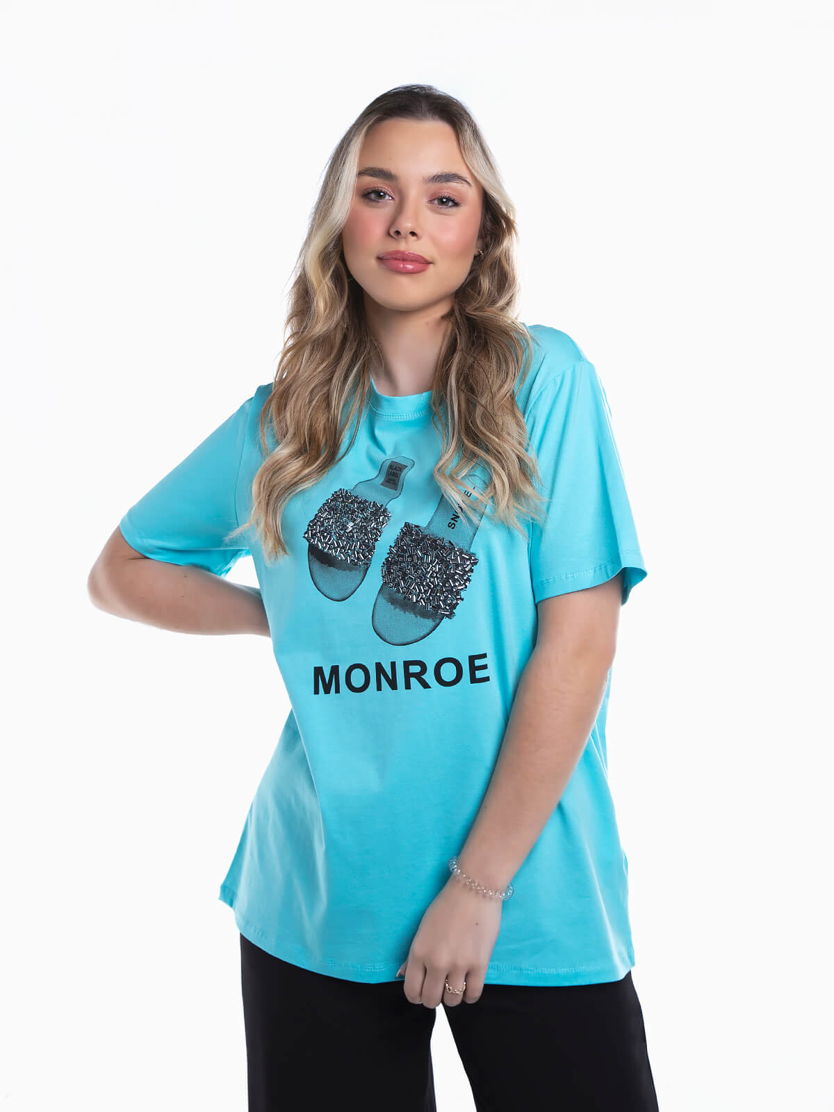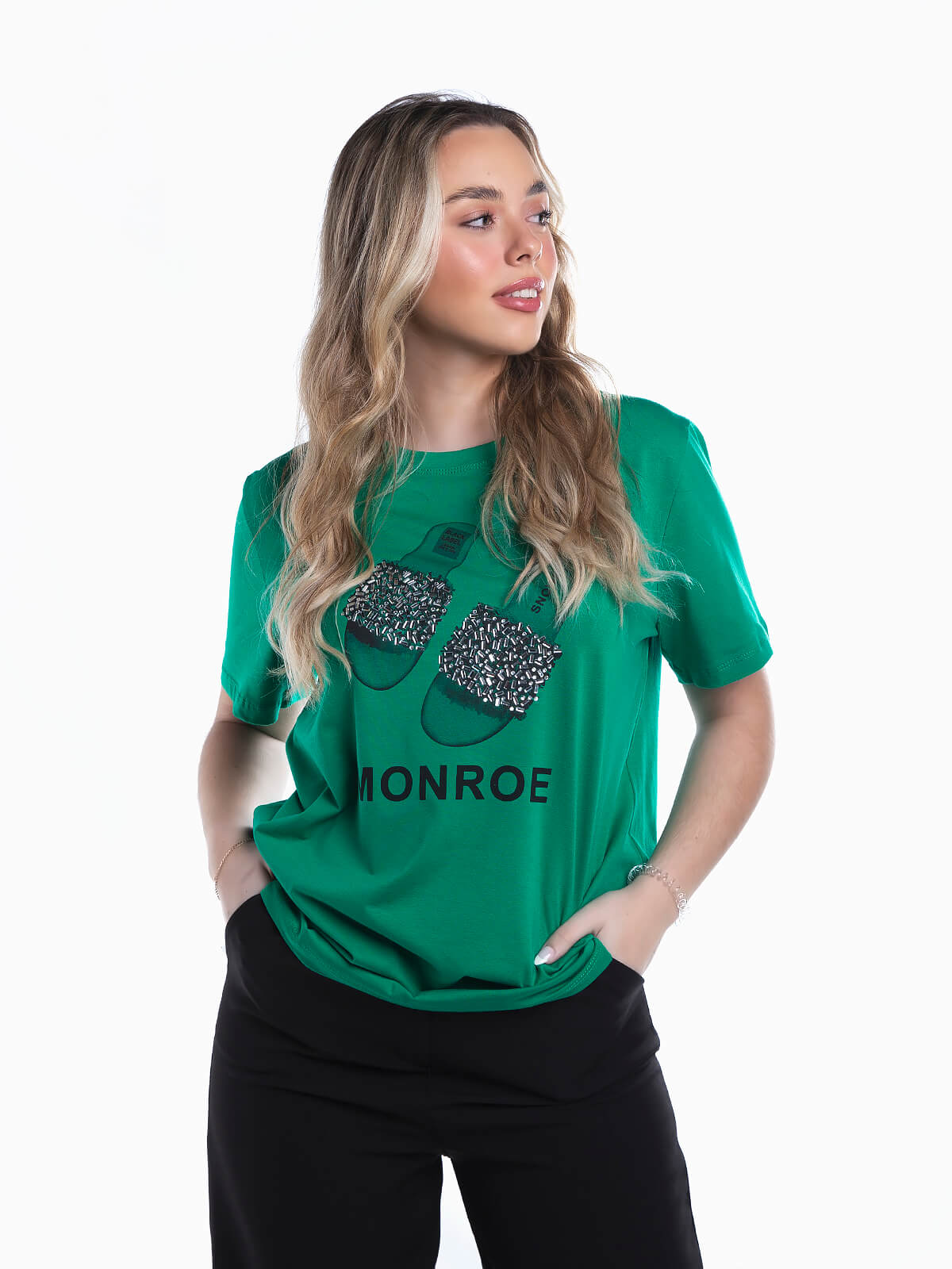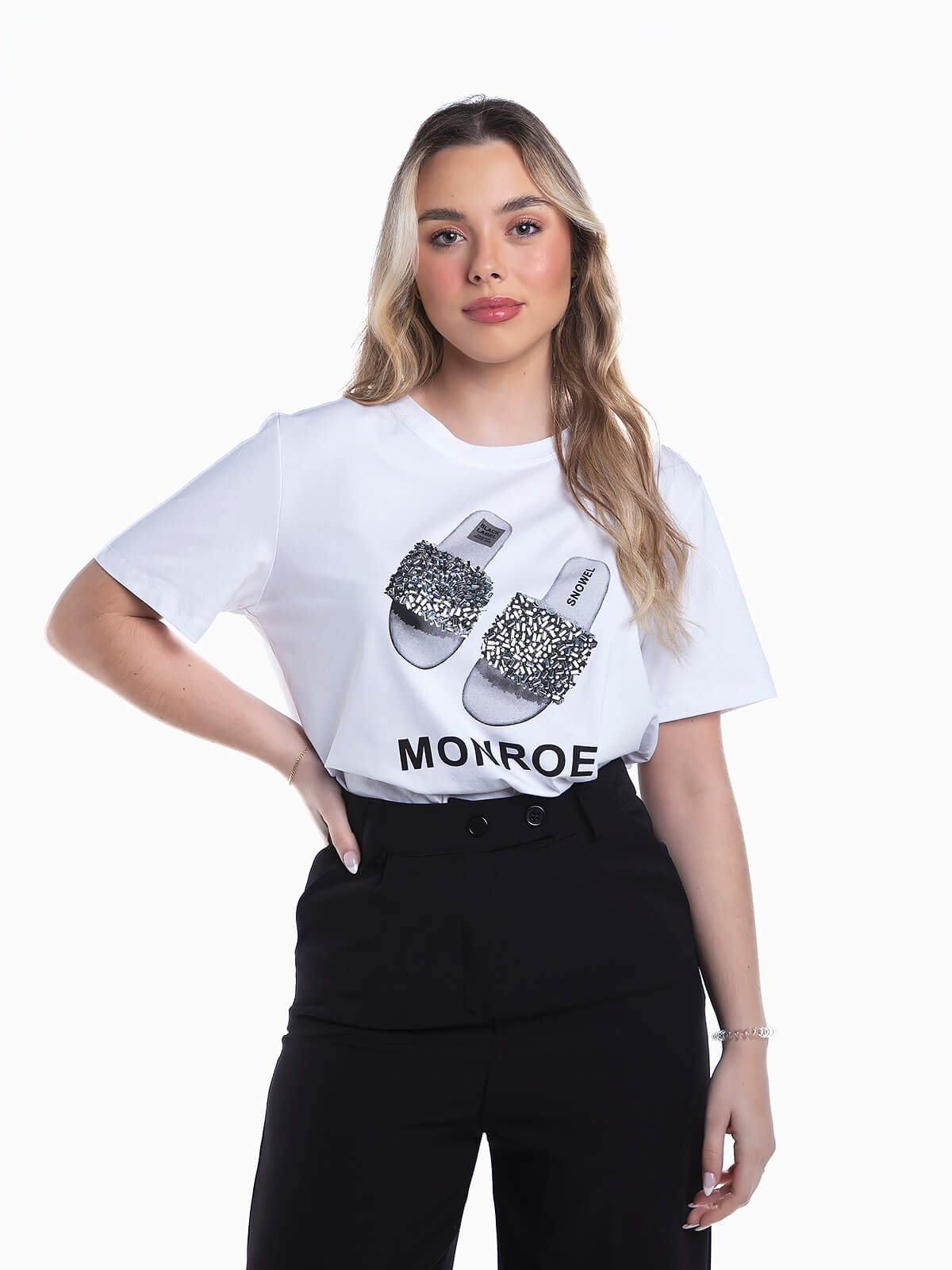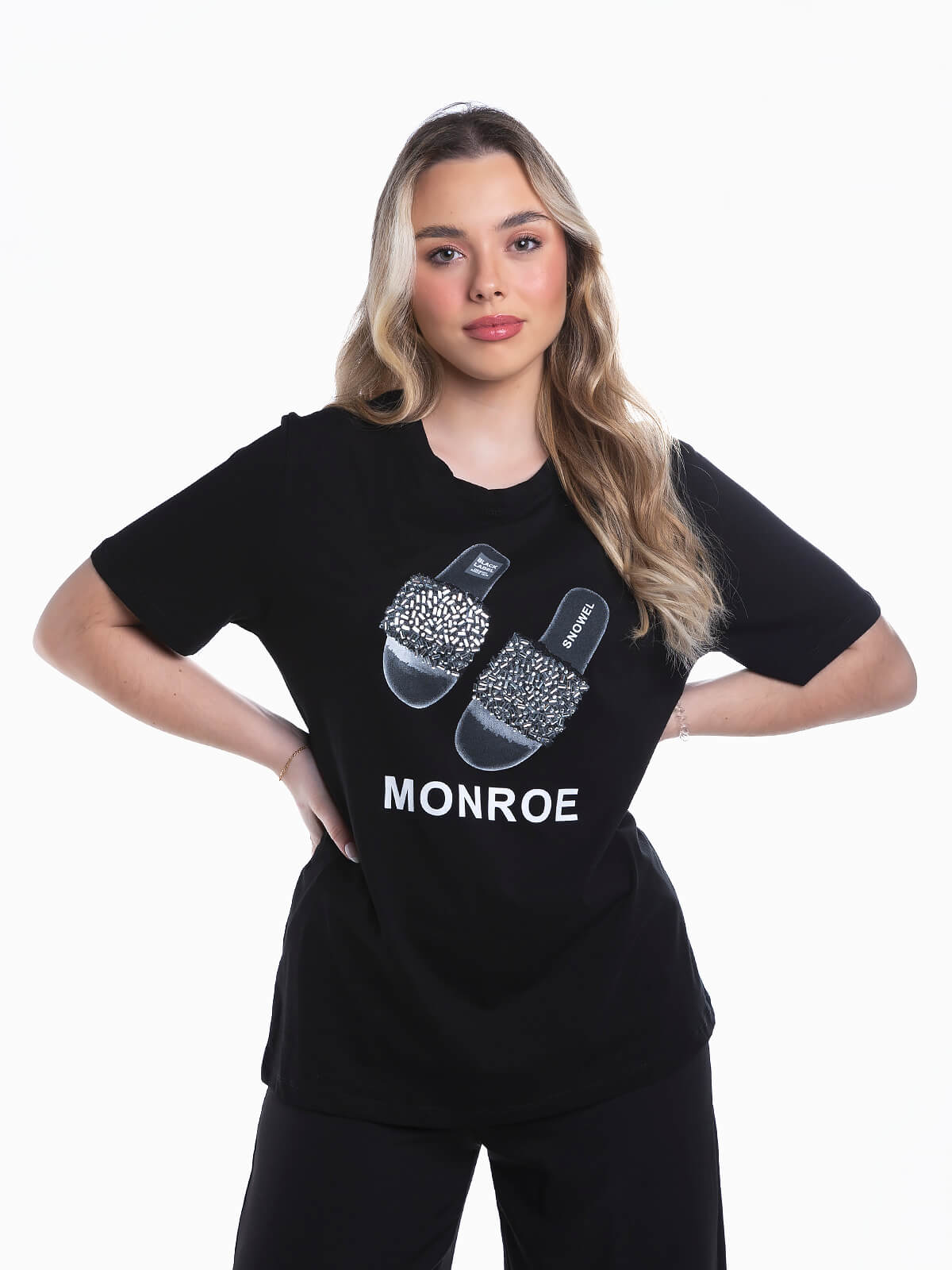 T-shirt de manga curta com encaixe renda na parte posterior. T-shirt com estampado e brilhos aplicados. Decote redondo.