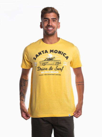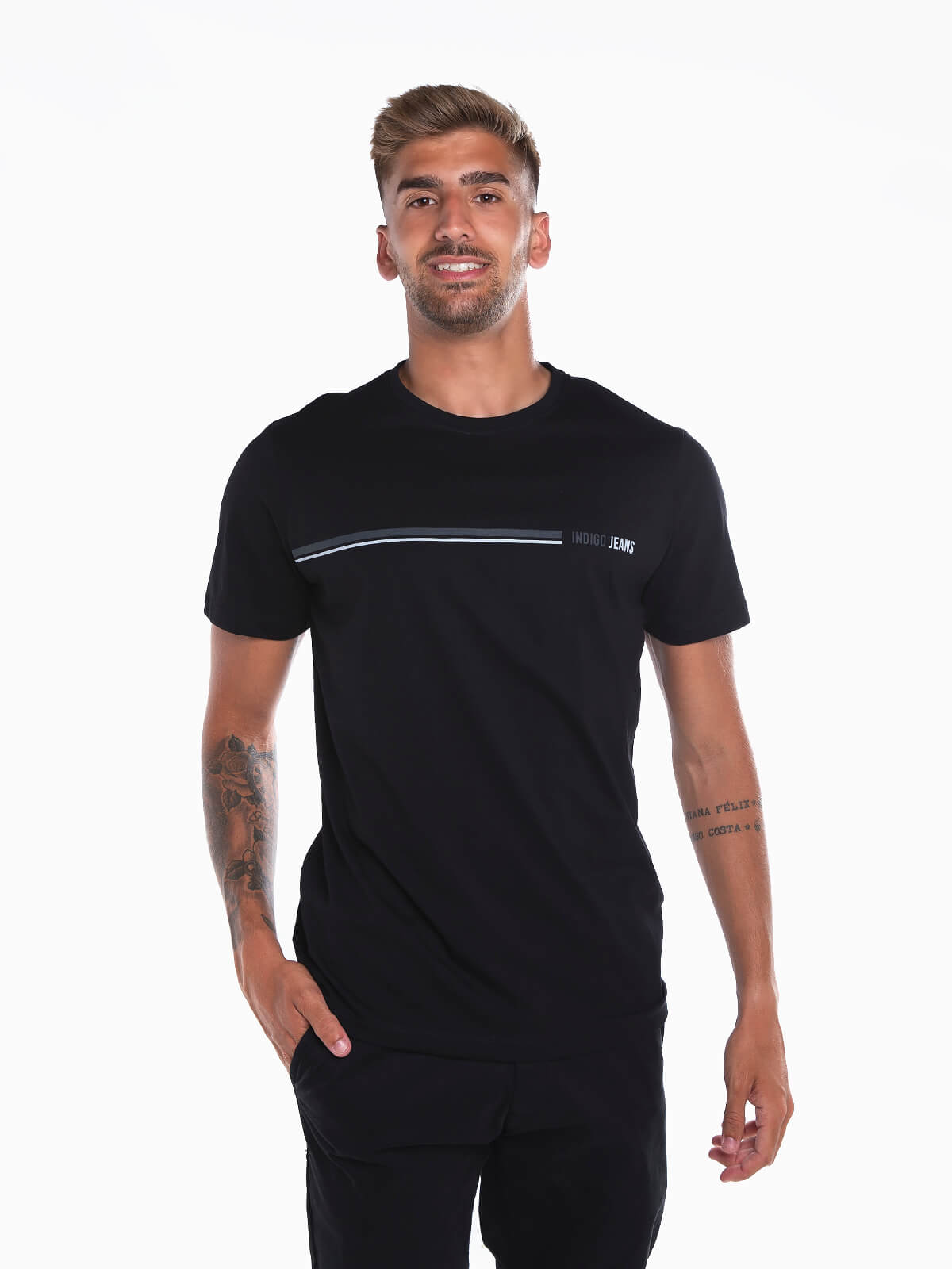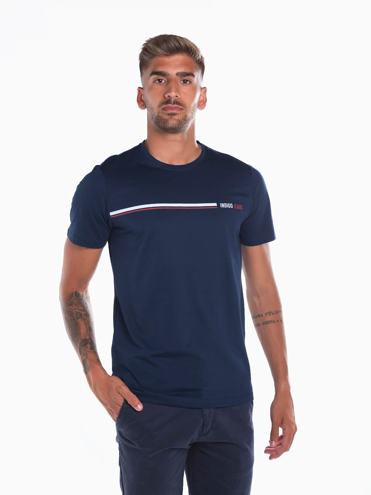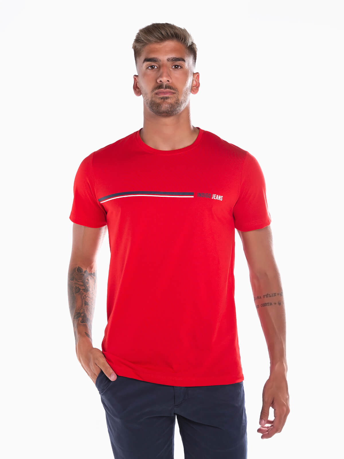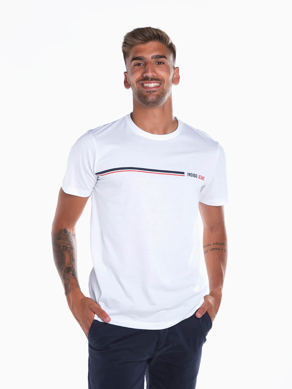 T-shirt de manga curta com risca estampada em contraste. T-shirt para homem 100% algodão com gola redonda.