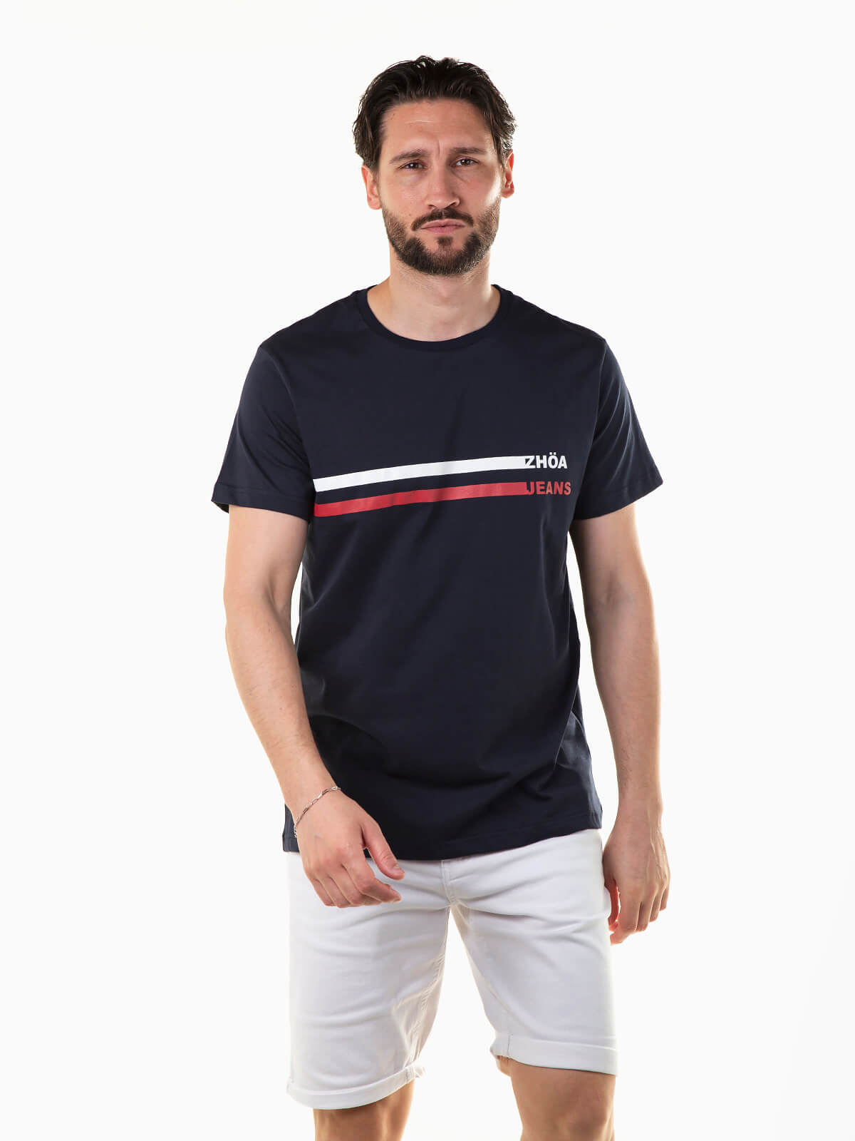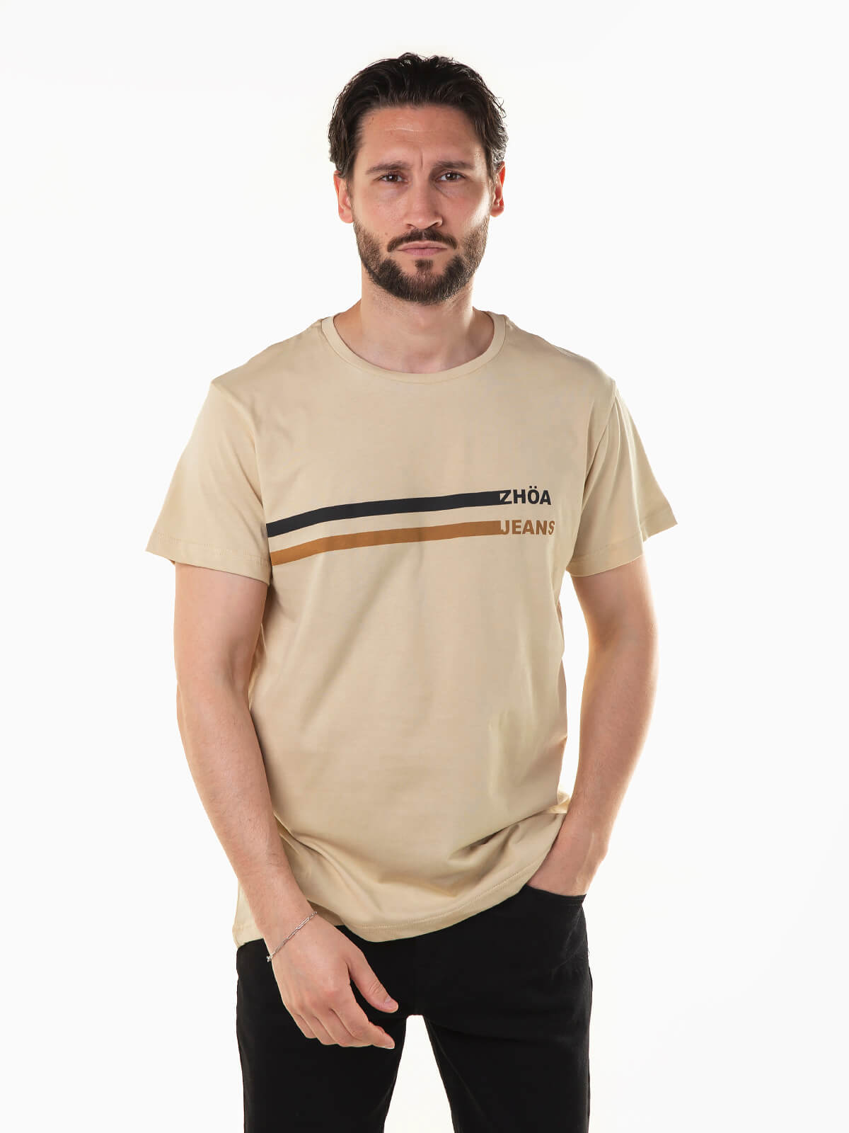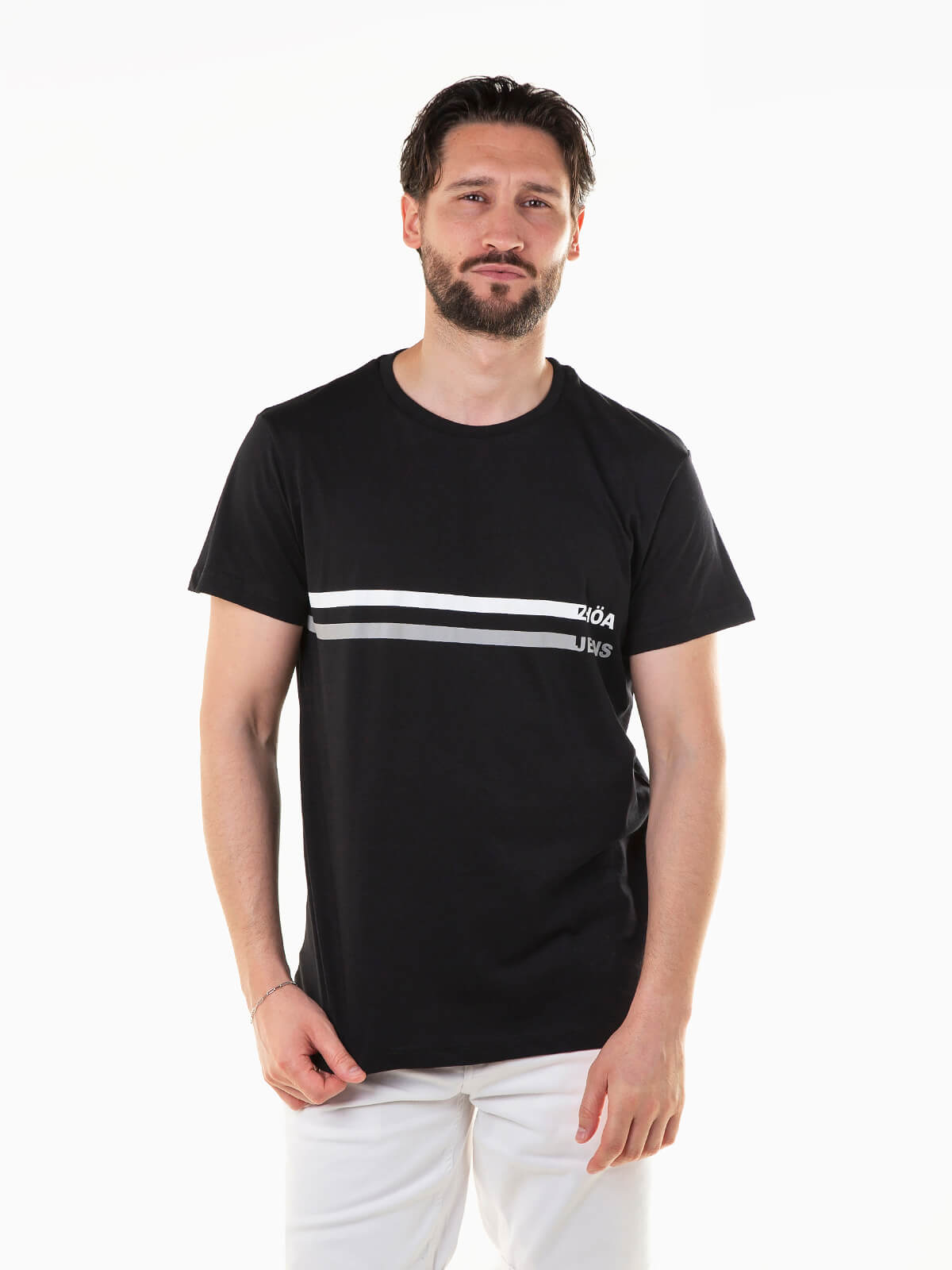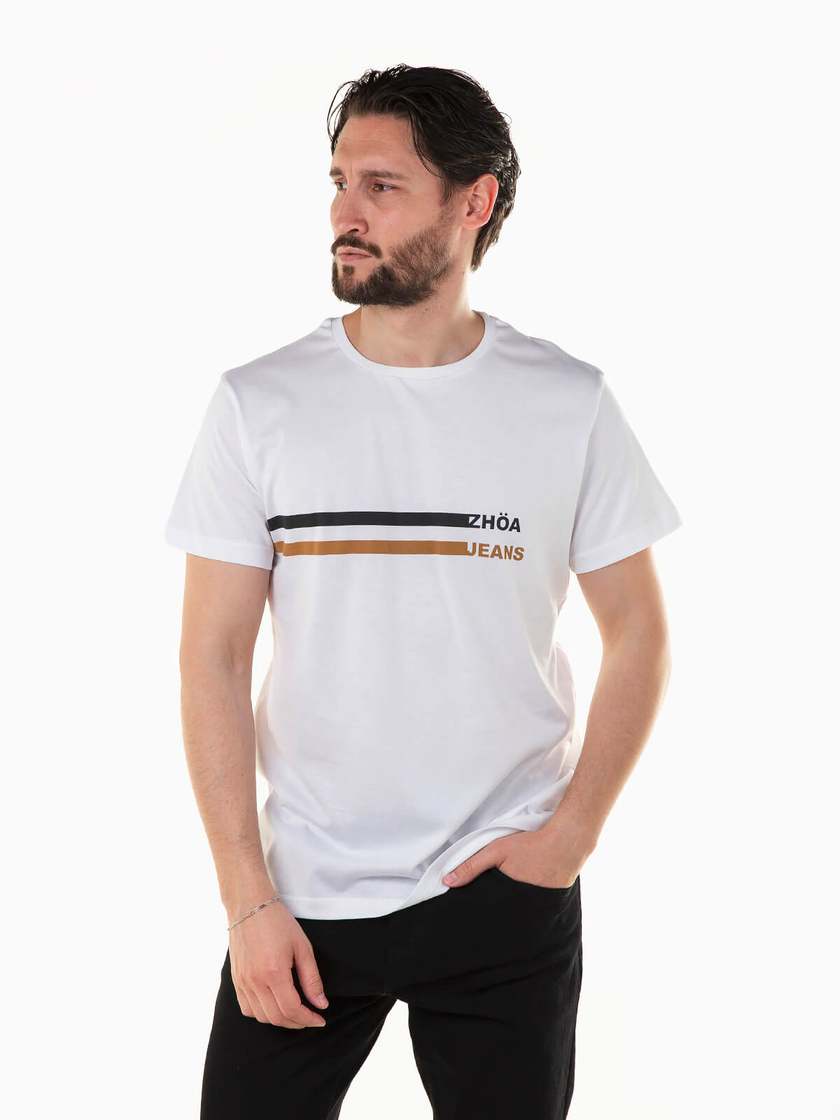 T-shirt de manga curta com 2 riscas estampadas à frente. T-shirt 100% algodão para homem com gola redonda.