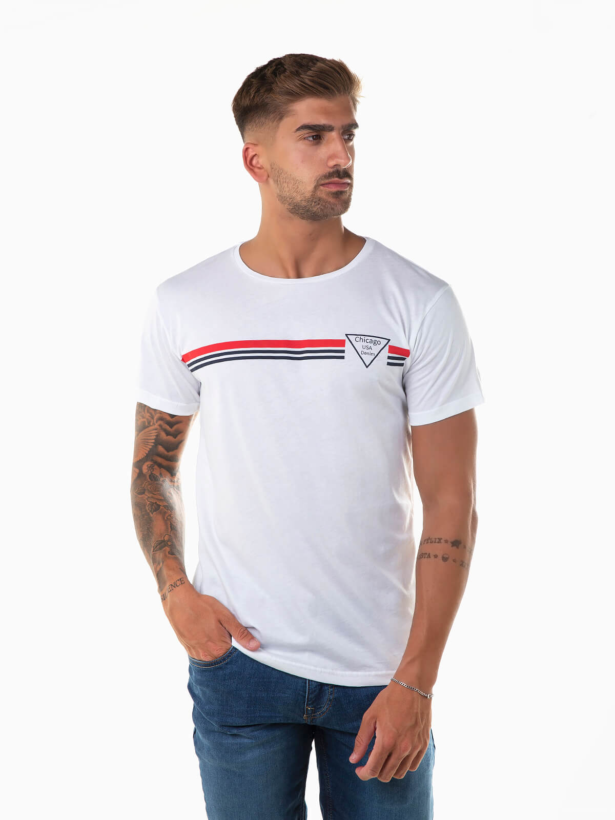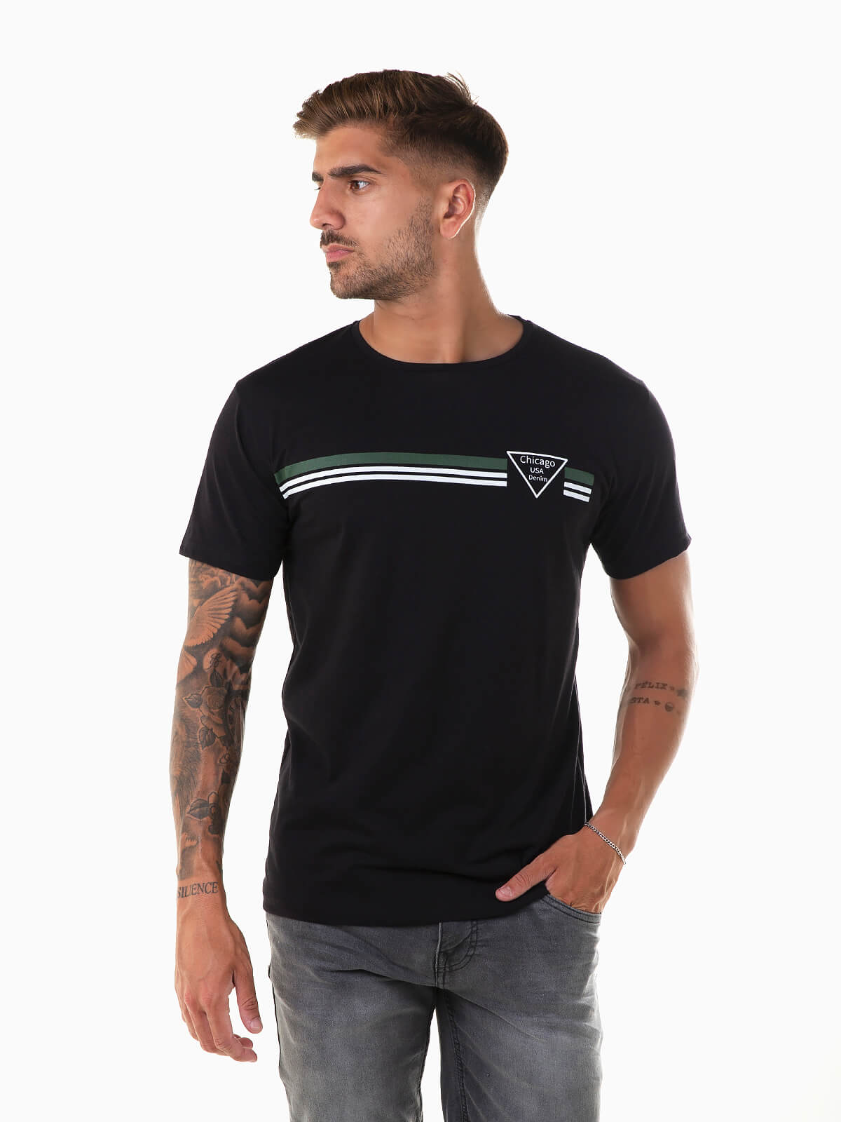 T-shirt de manga curta com símbolo e riscas estampados à frente. T-shirt para homem confecionada em tecido 100% algodão para maior conforto. Gola redonda.