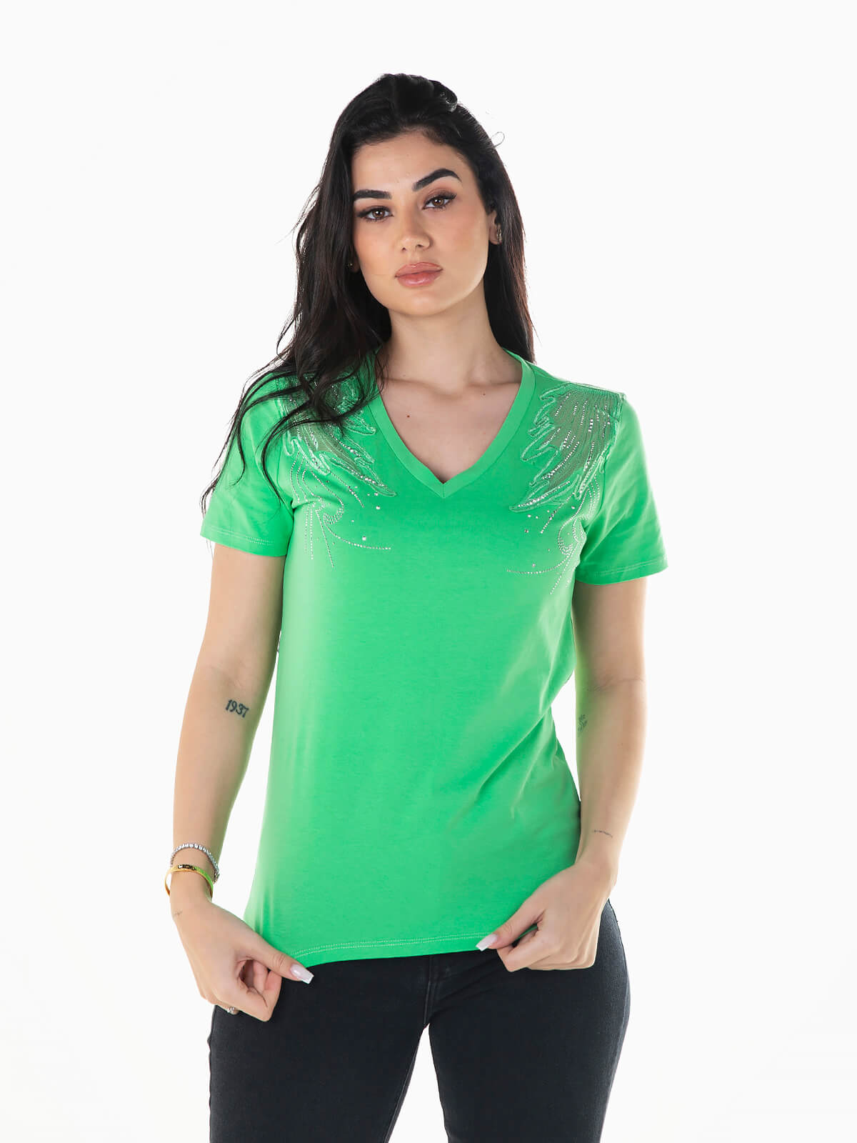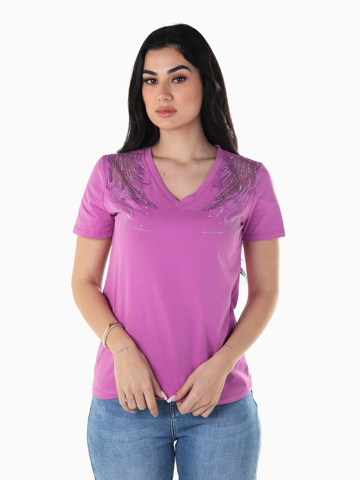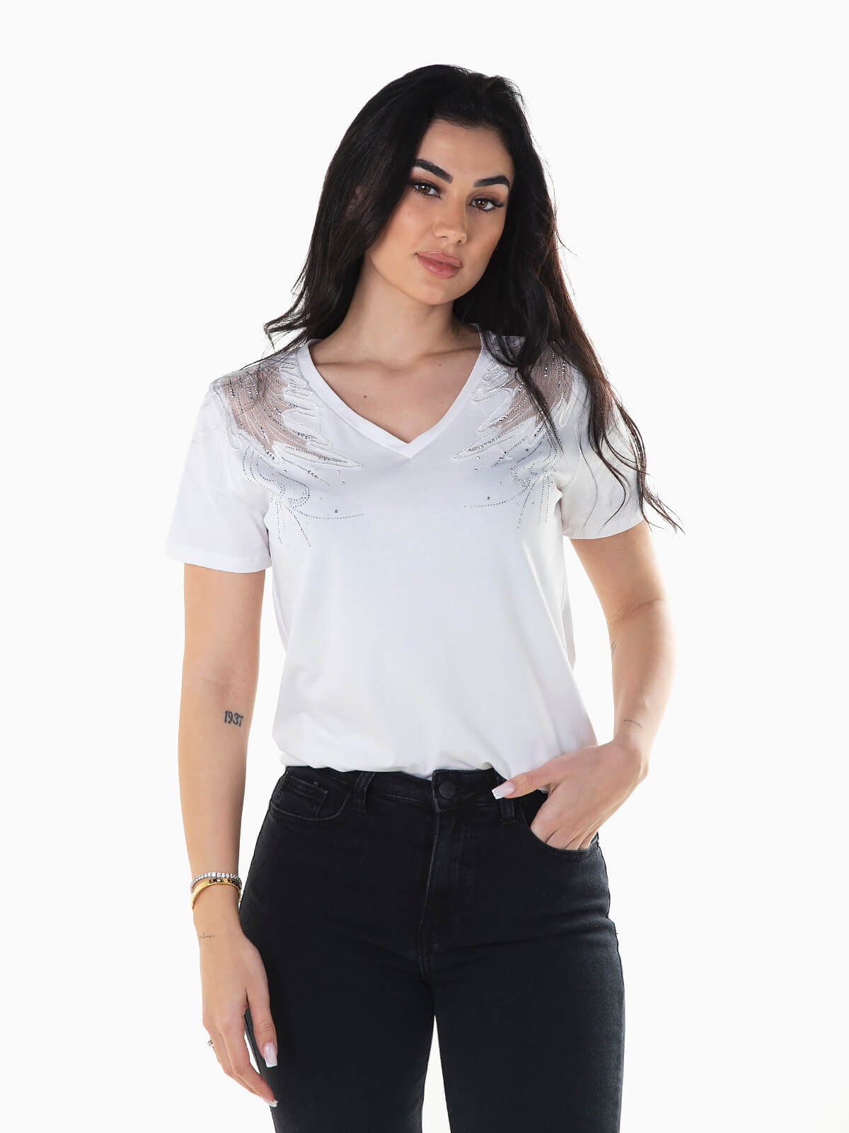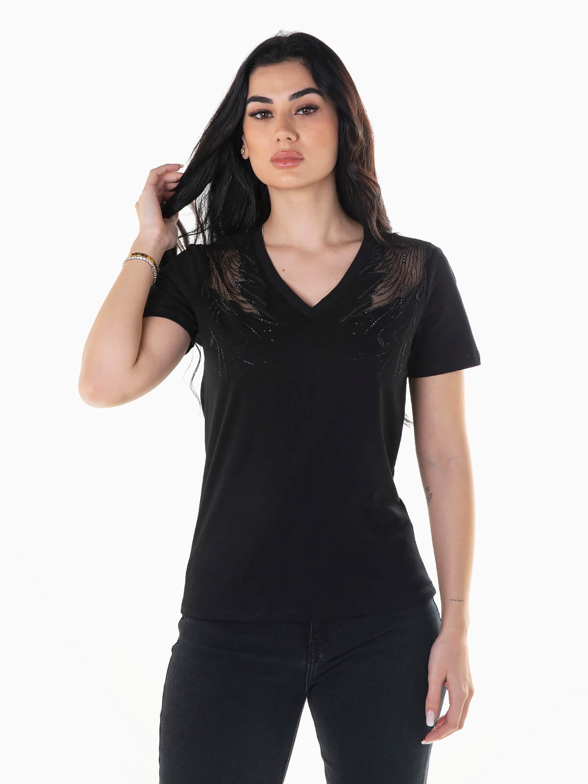 T-shirt de manga curta combinada com tule e aplicações brilhantes nos ombros. T-shirt com decote em bico.