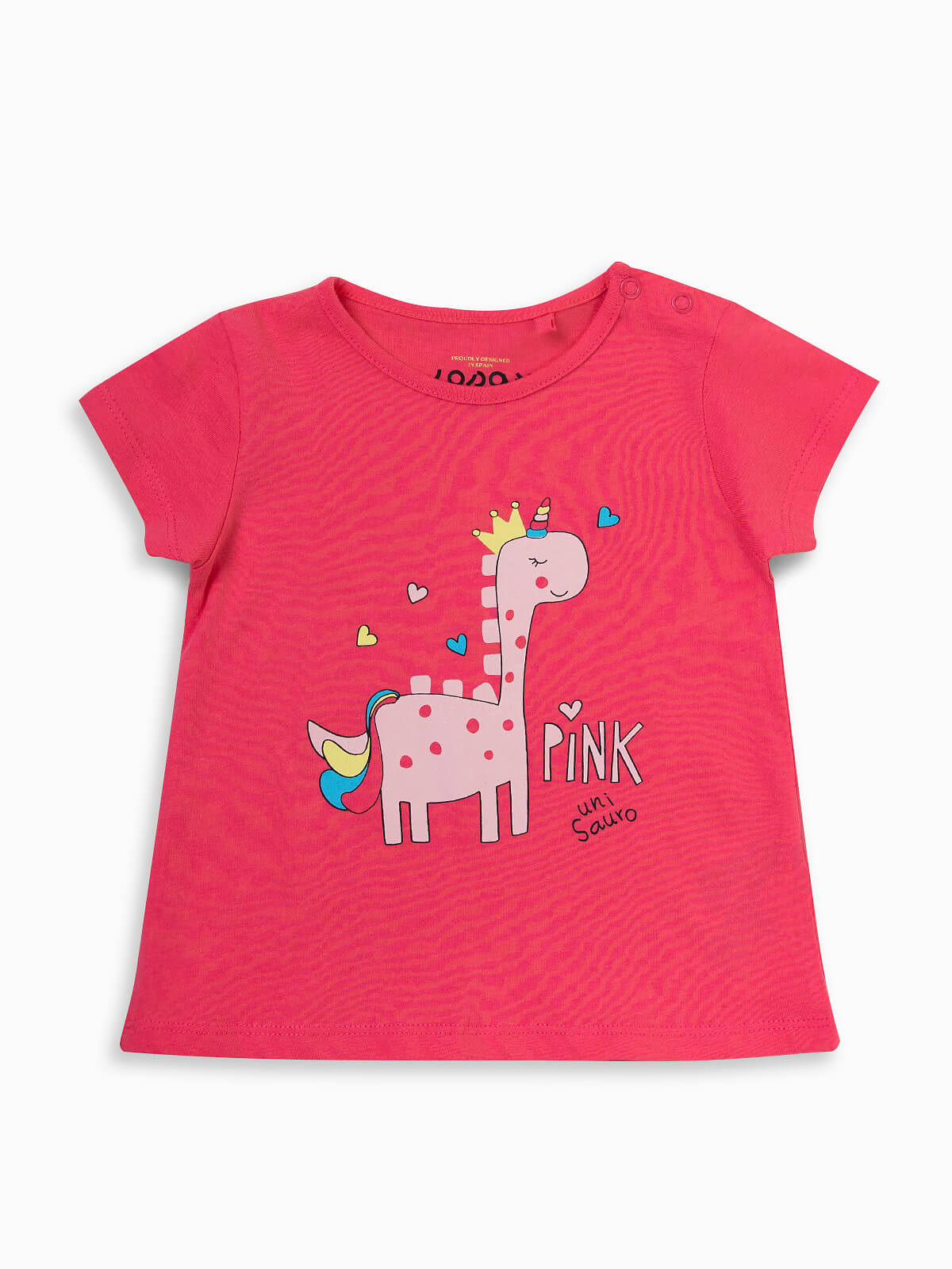 T-shirt de manga curta com estampado unicórnio. T-shirt para bebé menina com decote redondo e aperto dois botões de pressão.