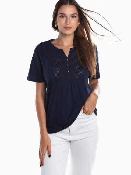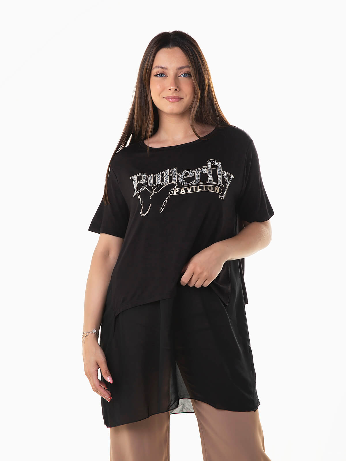 T-shirt de manga curta combinado com tule no cós e estampado brilhante no peito. T-shirt para senhora com decote redondo. Mais comprida na parte posterior.
