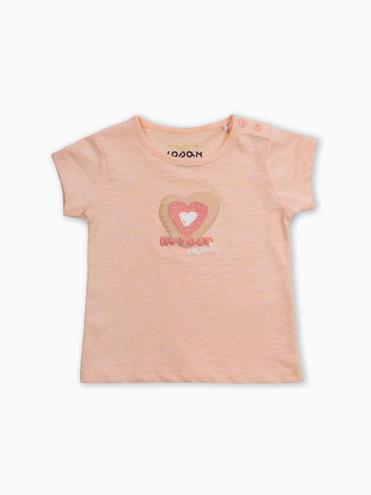 T-shirt de manga curta com coração e letras em glitter para efeito brilhante. T-shirt para bebé menina com decote redondo e aperto de dois botões.