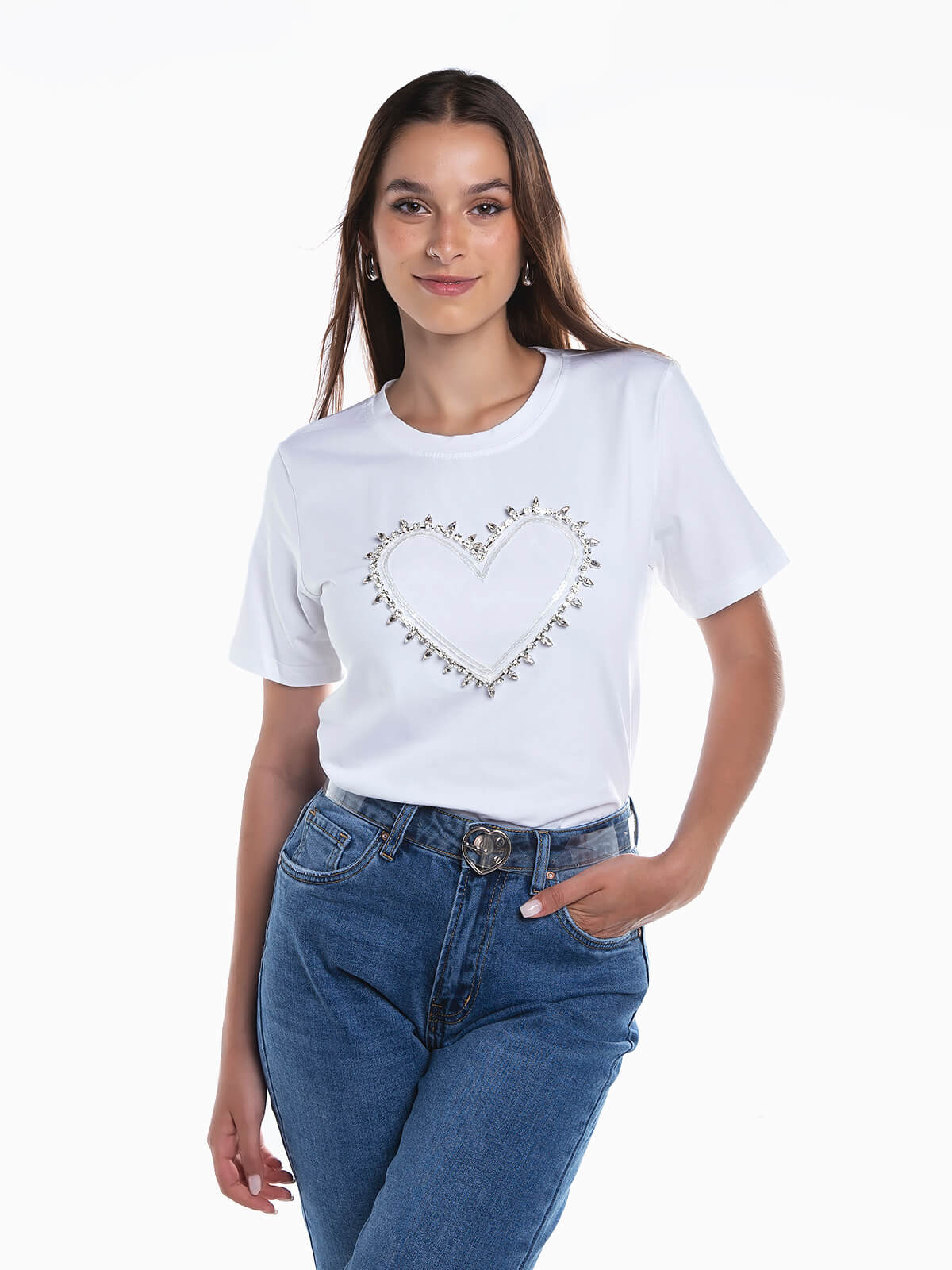 T-shirt de manga curta com coração em tule e pedras brilhantes aplicadas. T-shirt em 100% algodão com decote redondo.