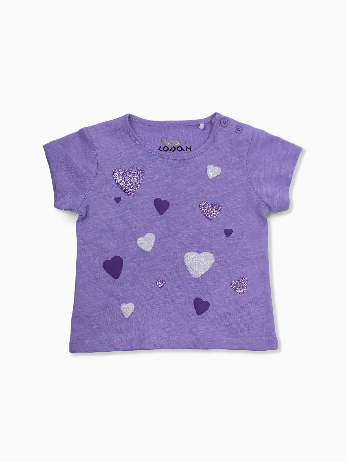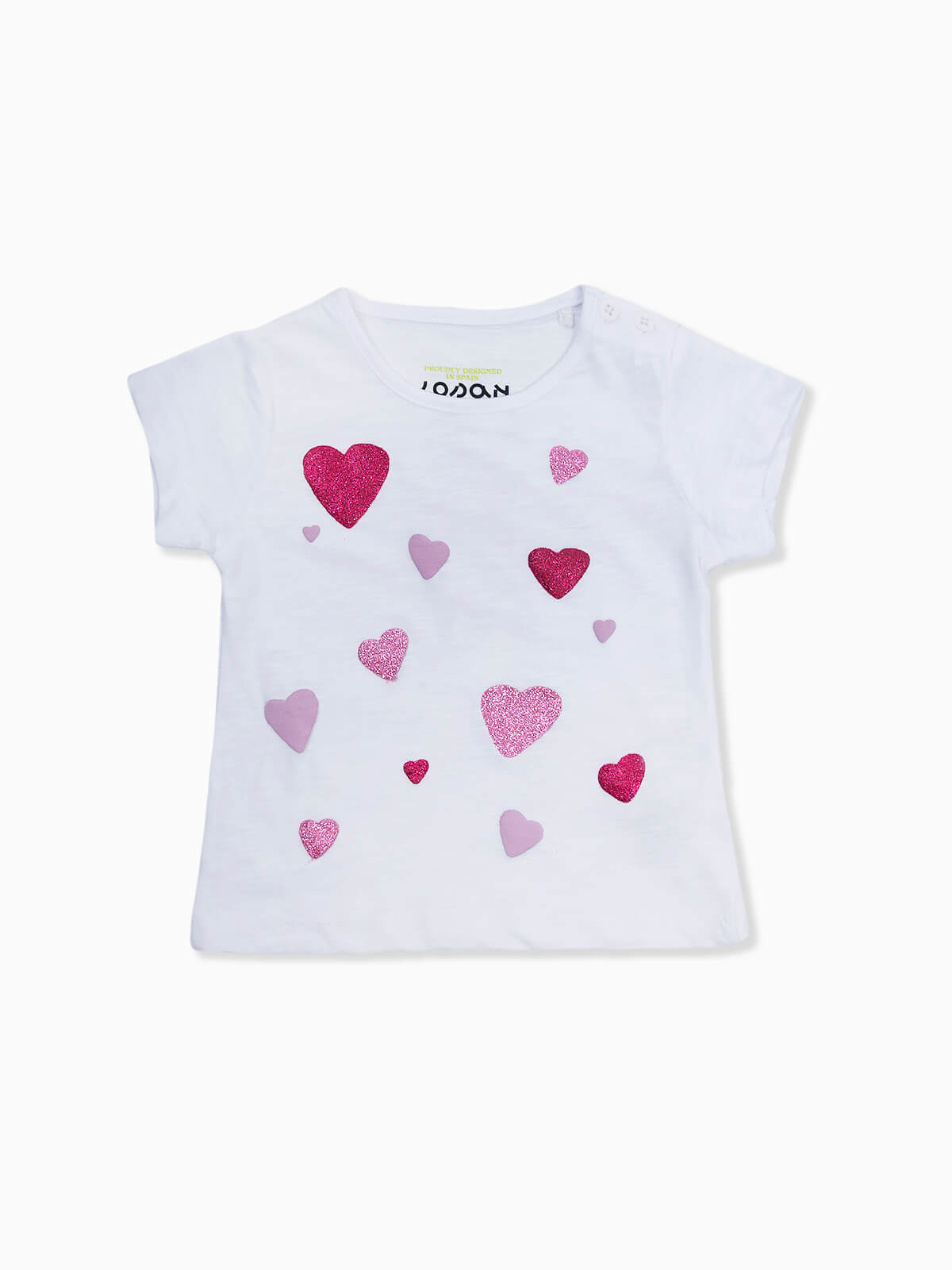 T-shirt de manga curta com corações em glitter para efeito brilhante. T-shirt para bebé menina com decote redondo e aperto de dois botões.