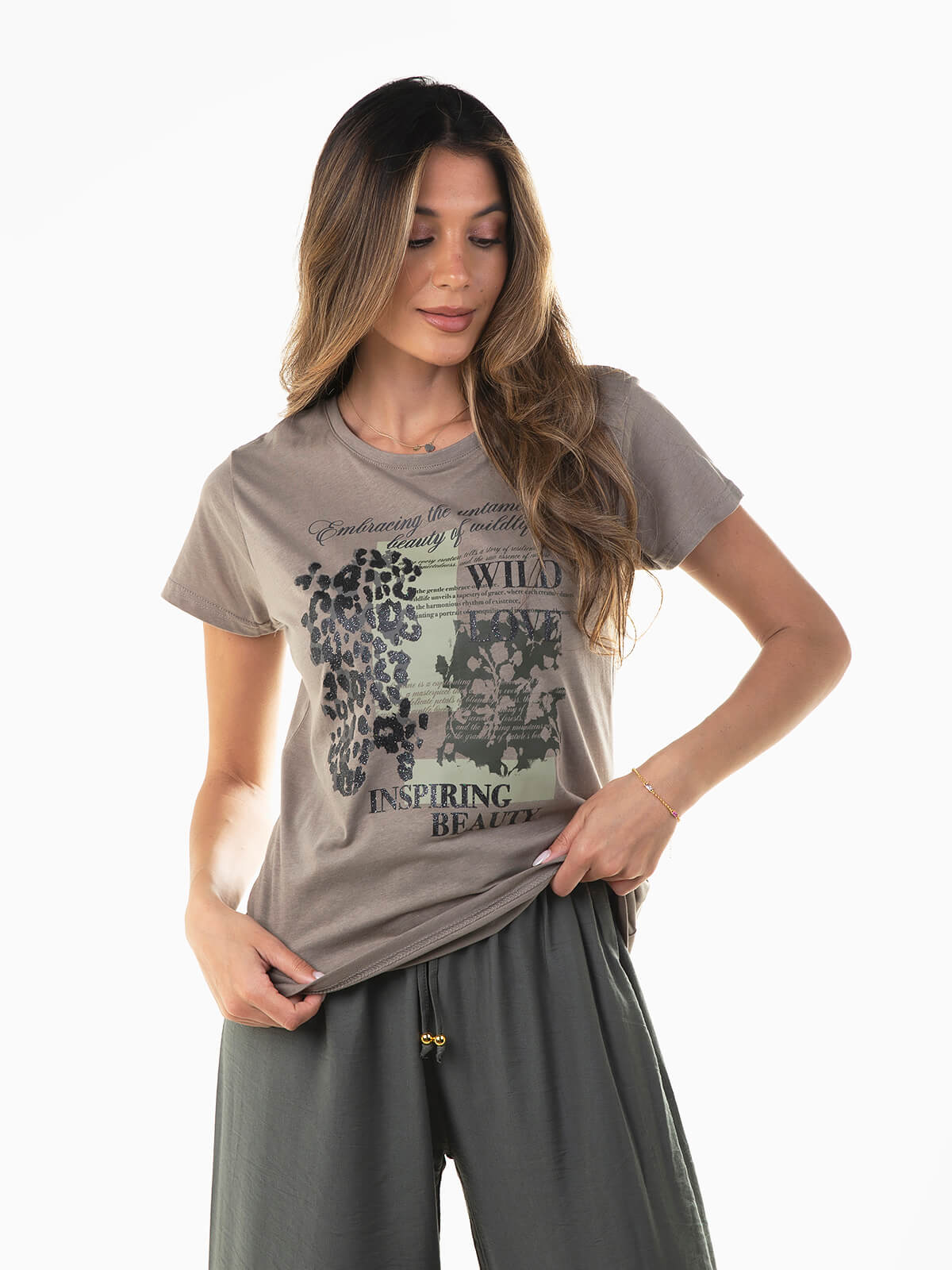T-shirt de manga curta com detalhes em animal print brilhante e letras. T-shirt para mulher com decote redondo.