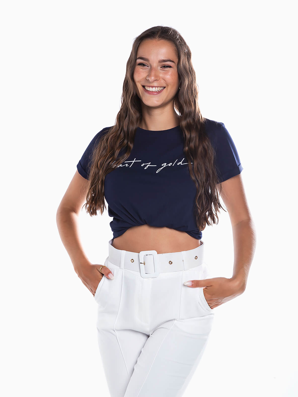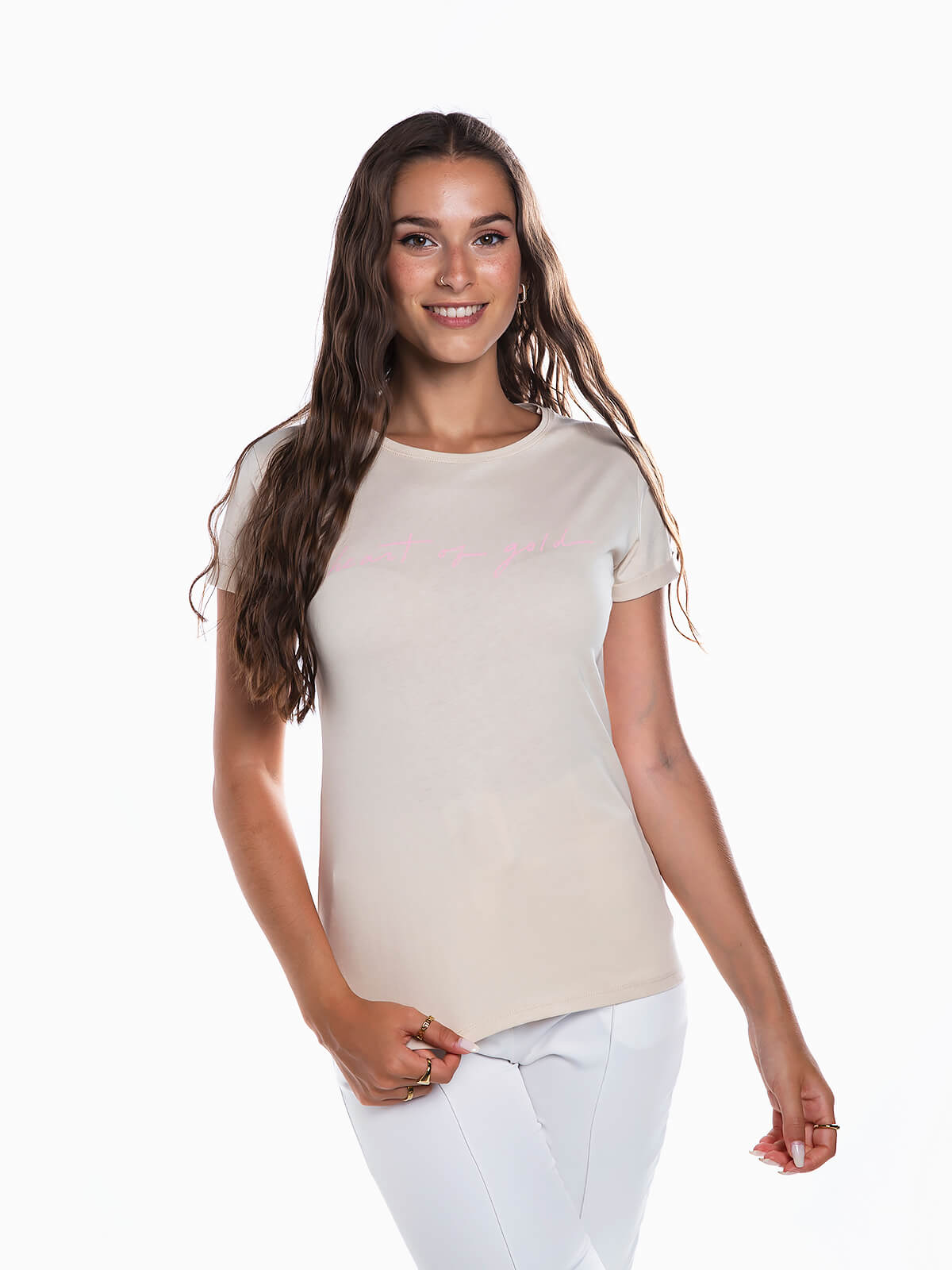 T-shirt de manga curta dobrada para senhora. T-shirt em tecido 100% algodão com estampado de letras. Gola redonda.