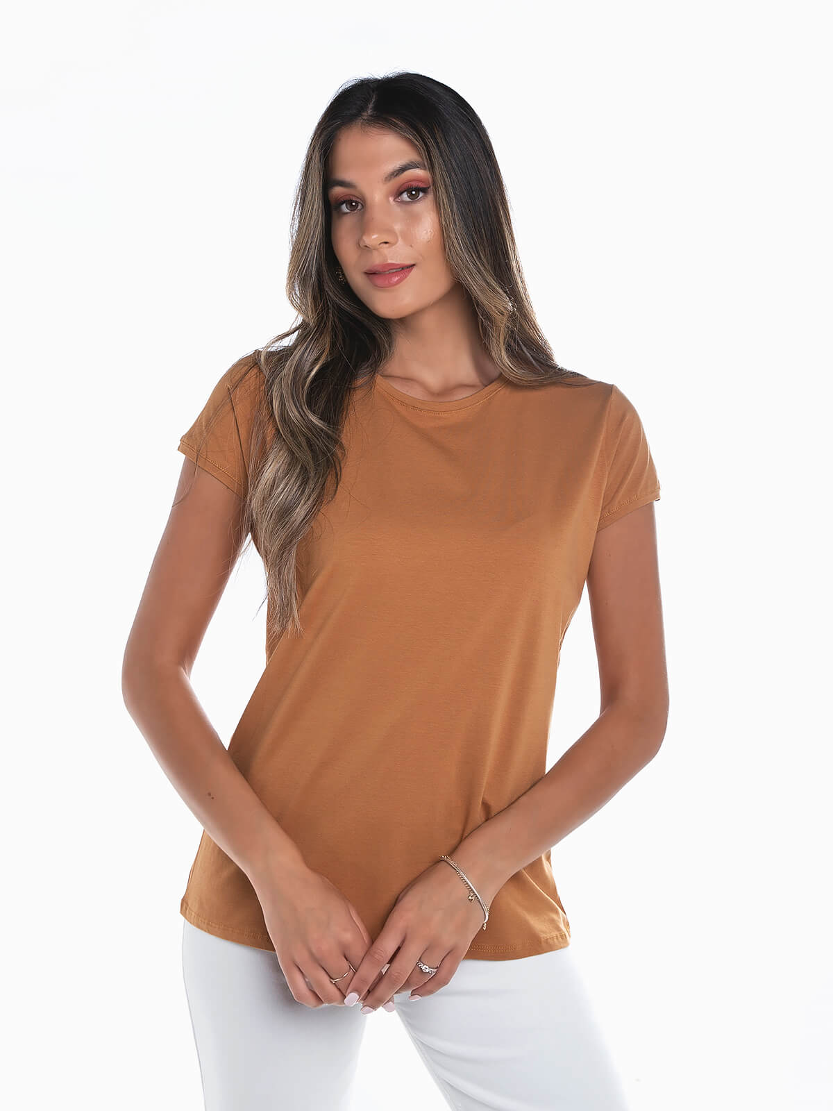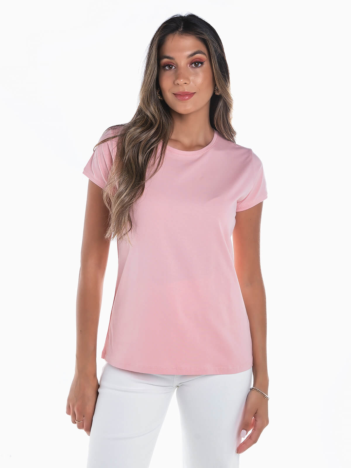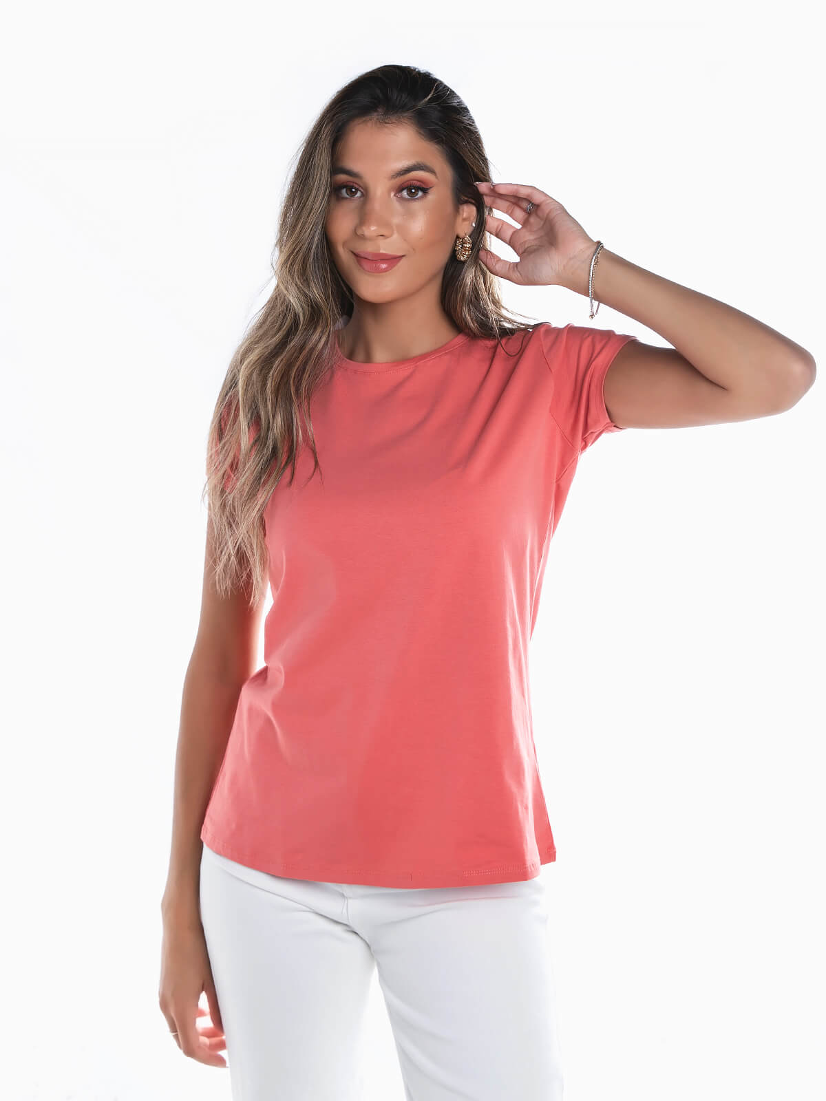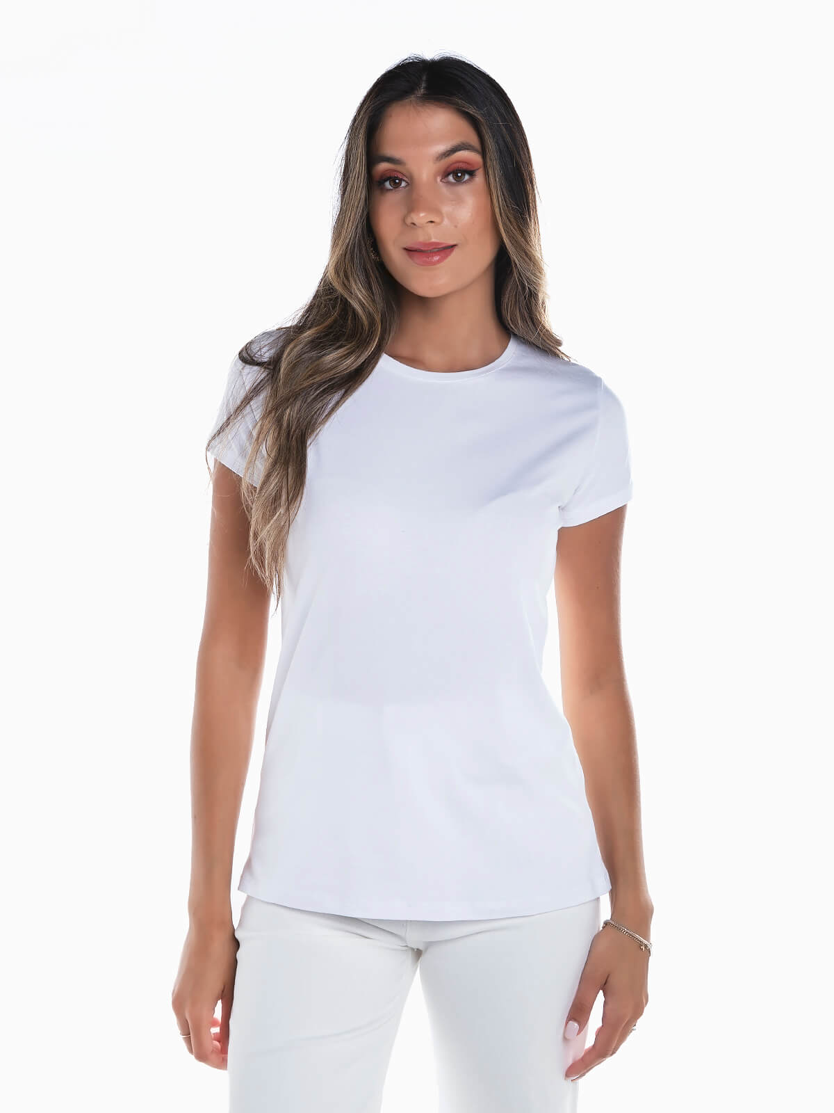T-shirt de manga curta em tecido de algodão para senhora. T-shirt básica com decote redondo.