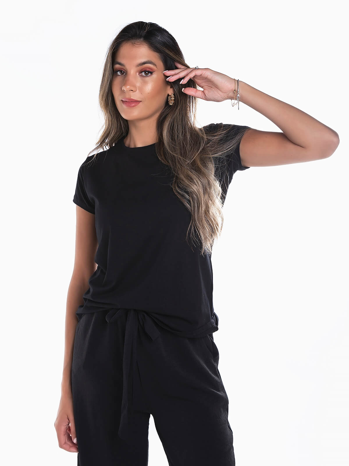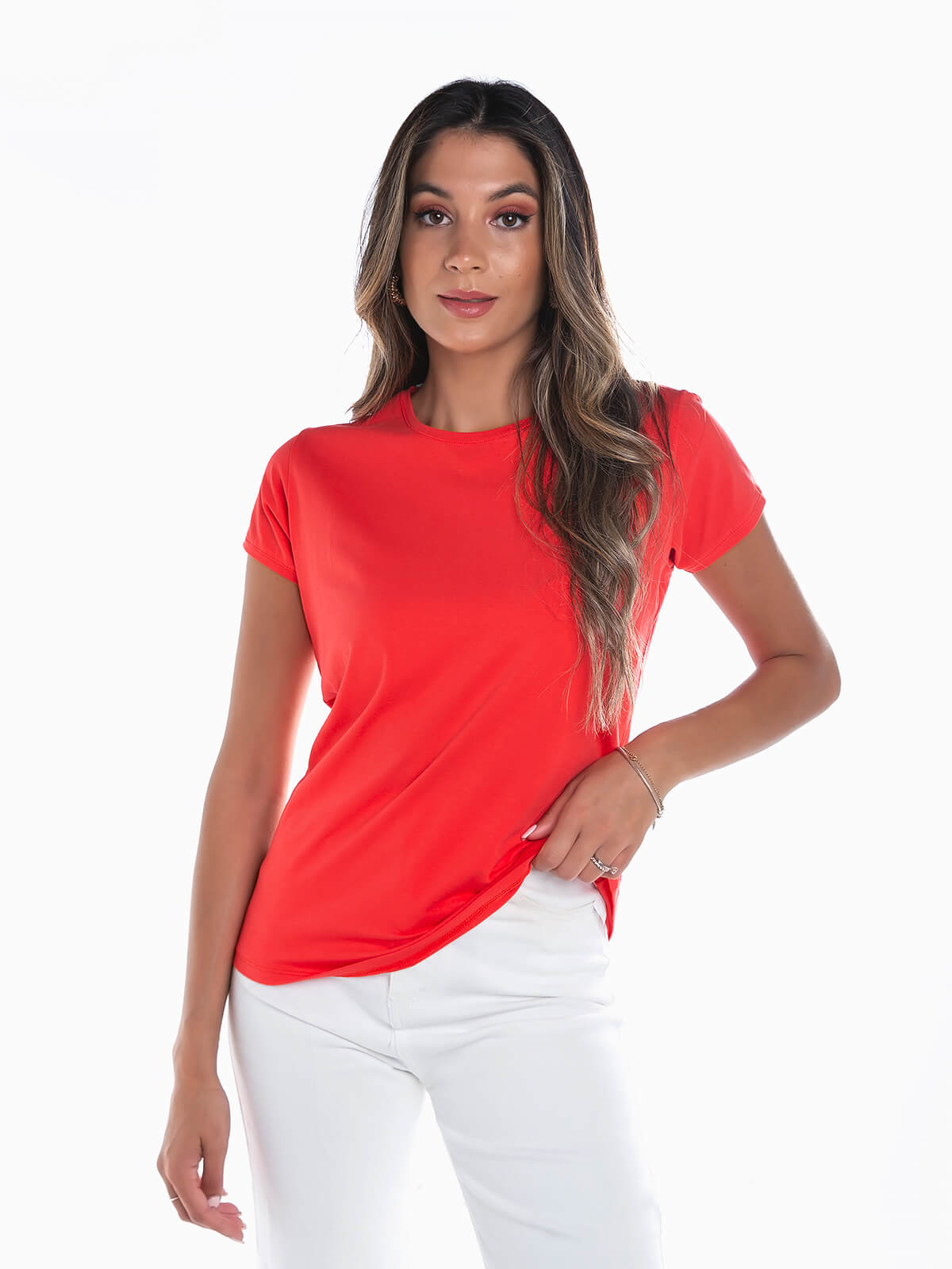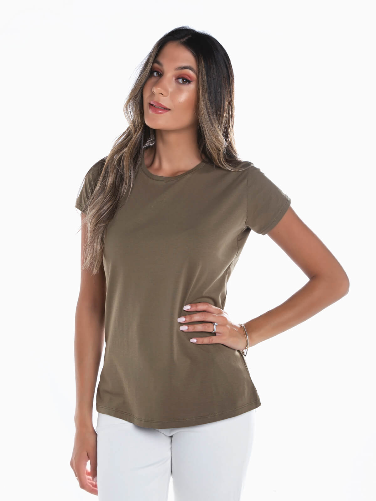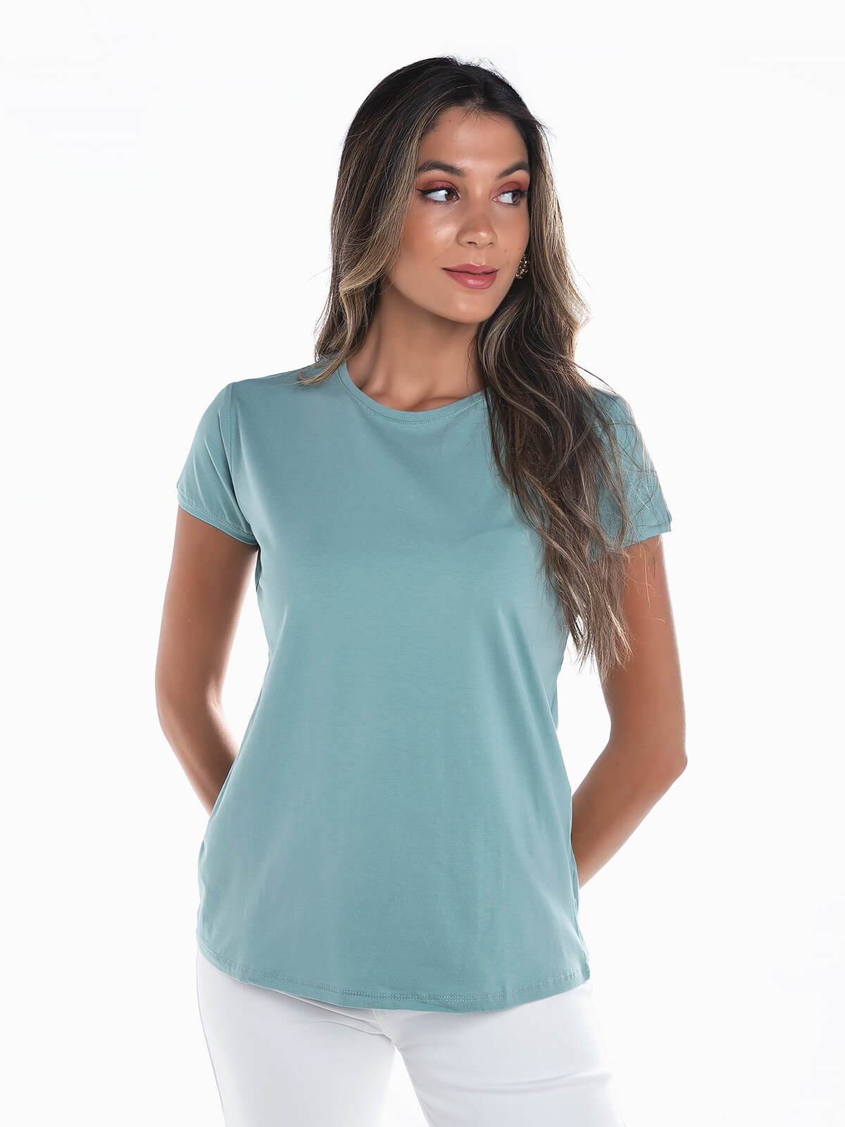T-shirt de manga curta em tecido de algodão para senhora. T-shirt básica com decote redondo.