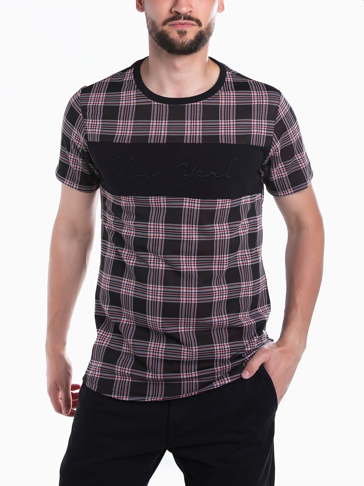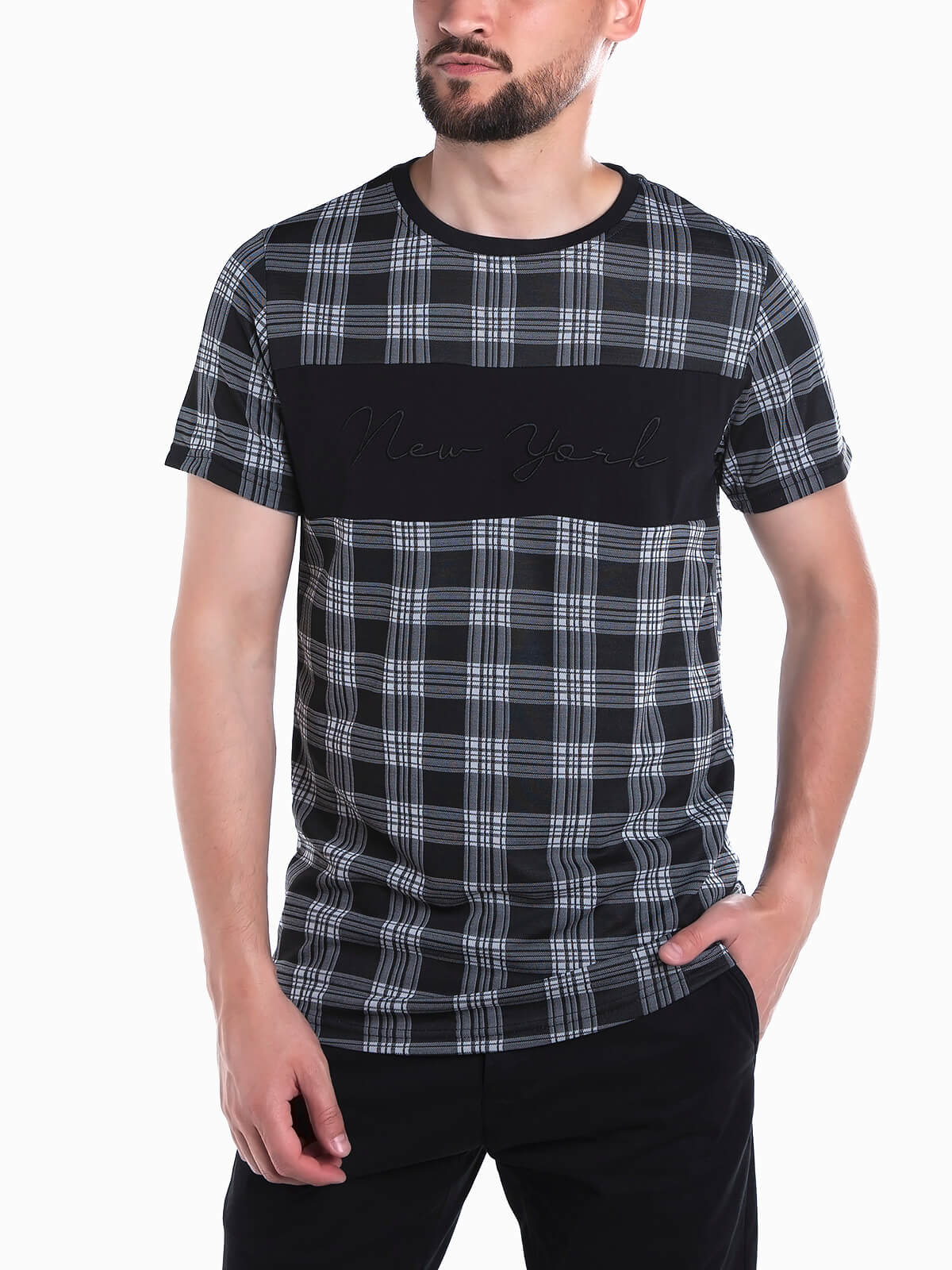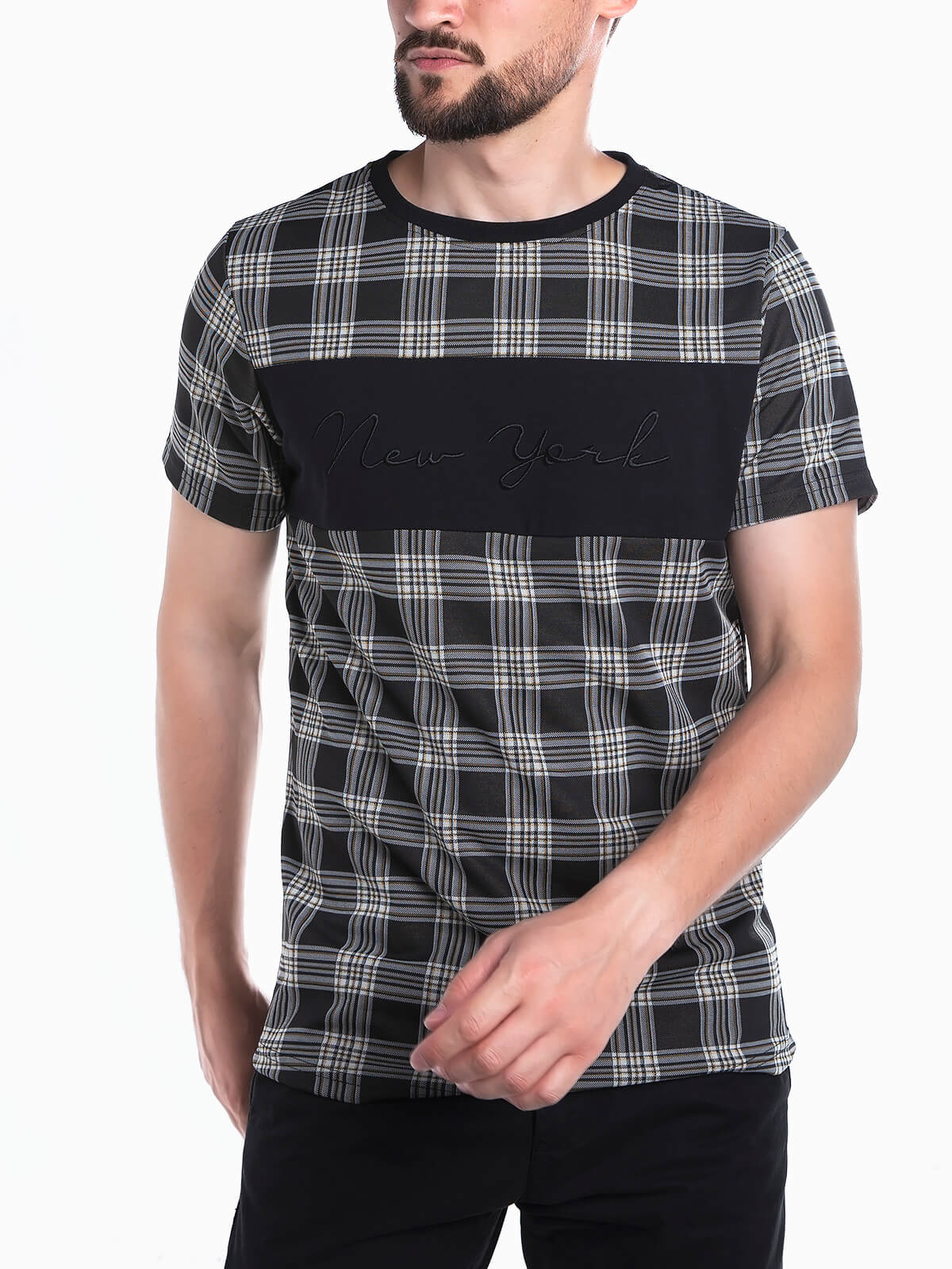 T-shirt de manga curta em xadrez e bordado de letras no peito. T-shirt com decote redondo.