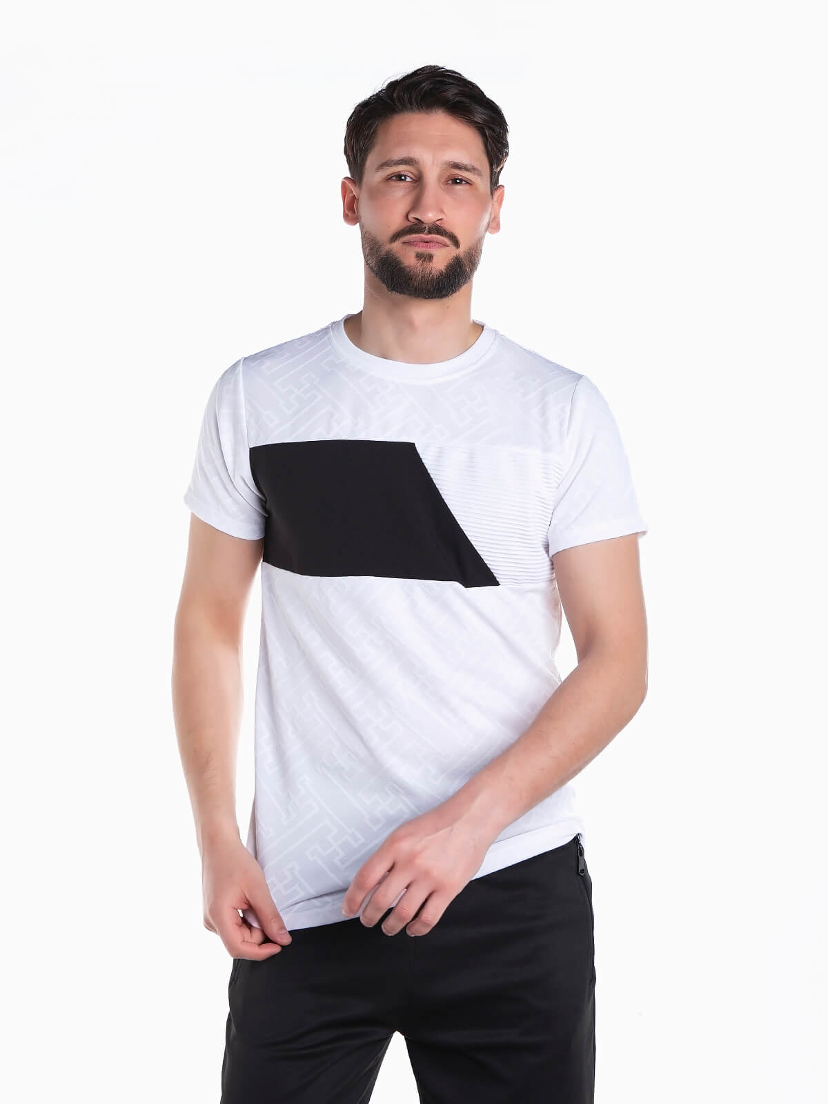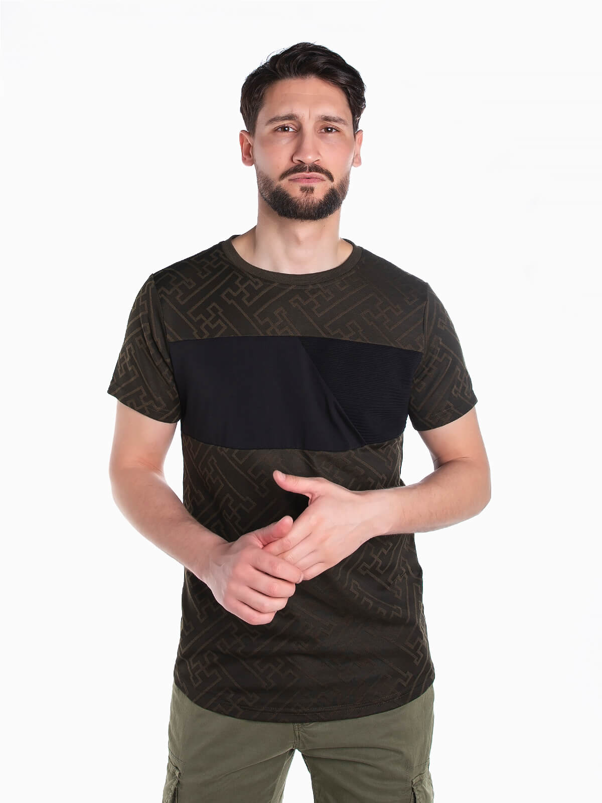 T-shirt de manga curta com encaixe de tecido canelado no peito. T-shirt com estampado em relevo e gola redonda.