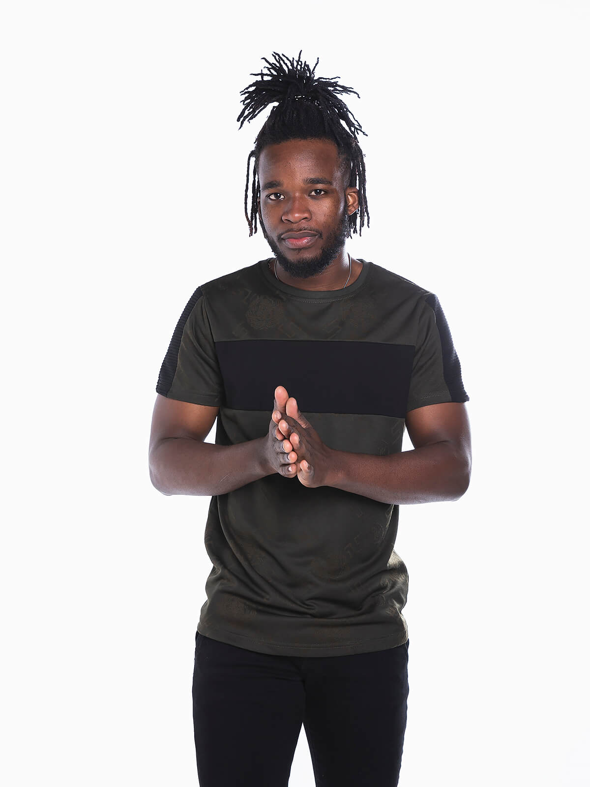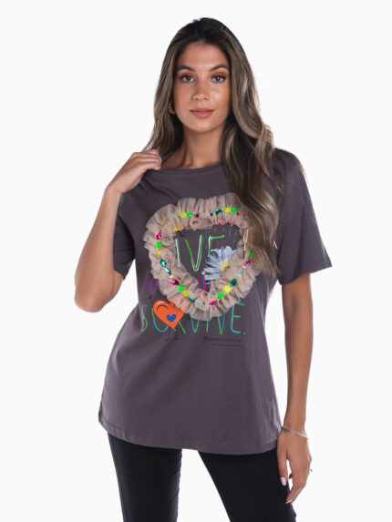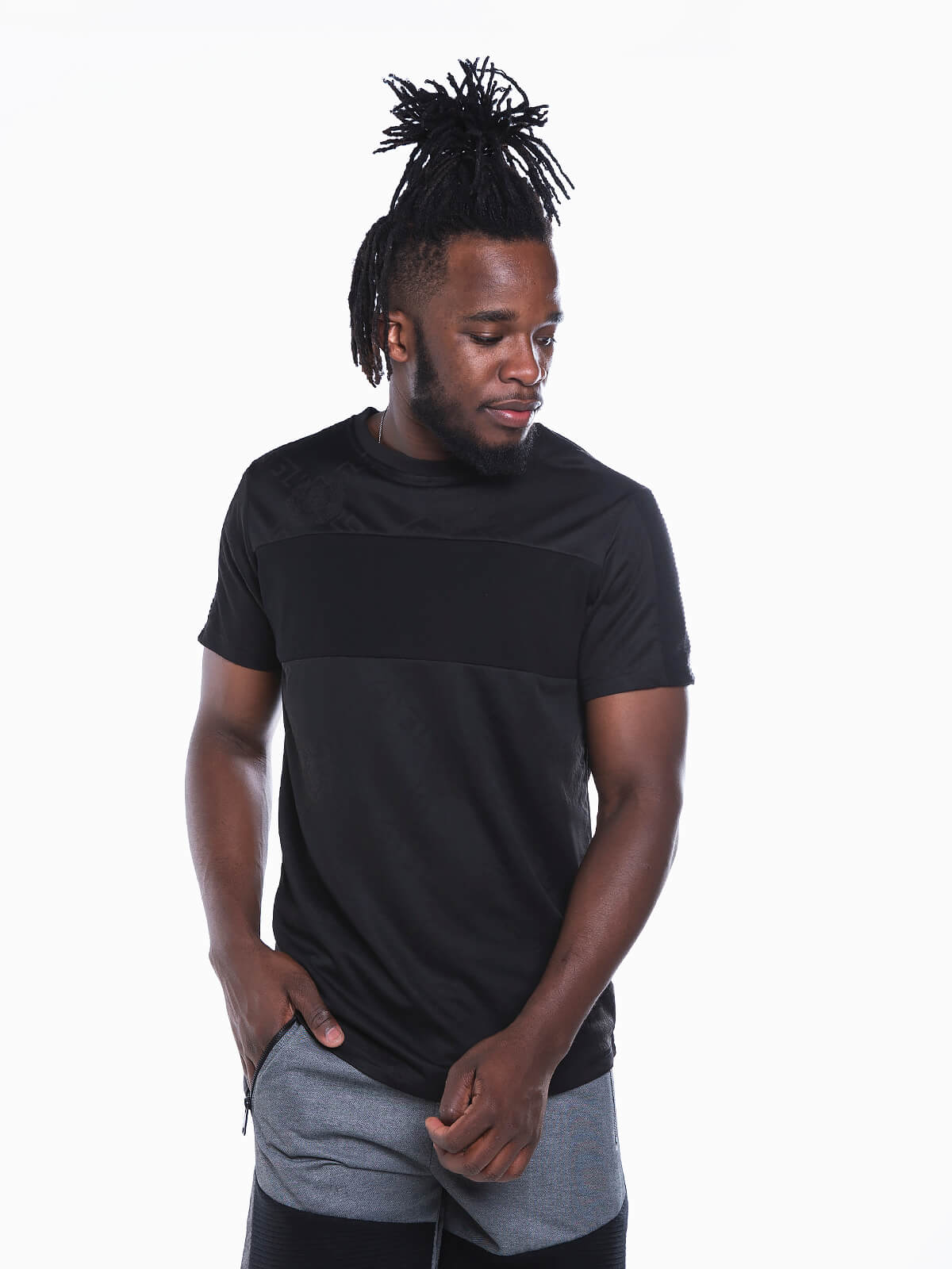 T-shirt de manga curta com encaixe de cor no peito. T-shirt com relevo e mangas com encaixe canelado. Gola redonda.