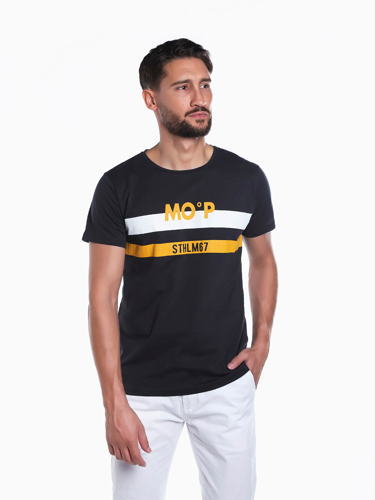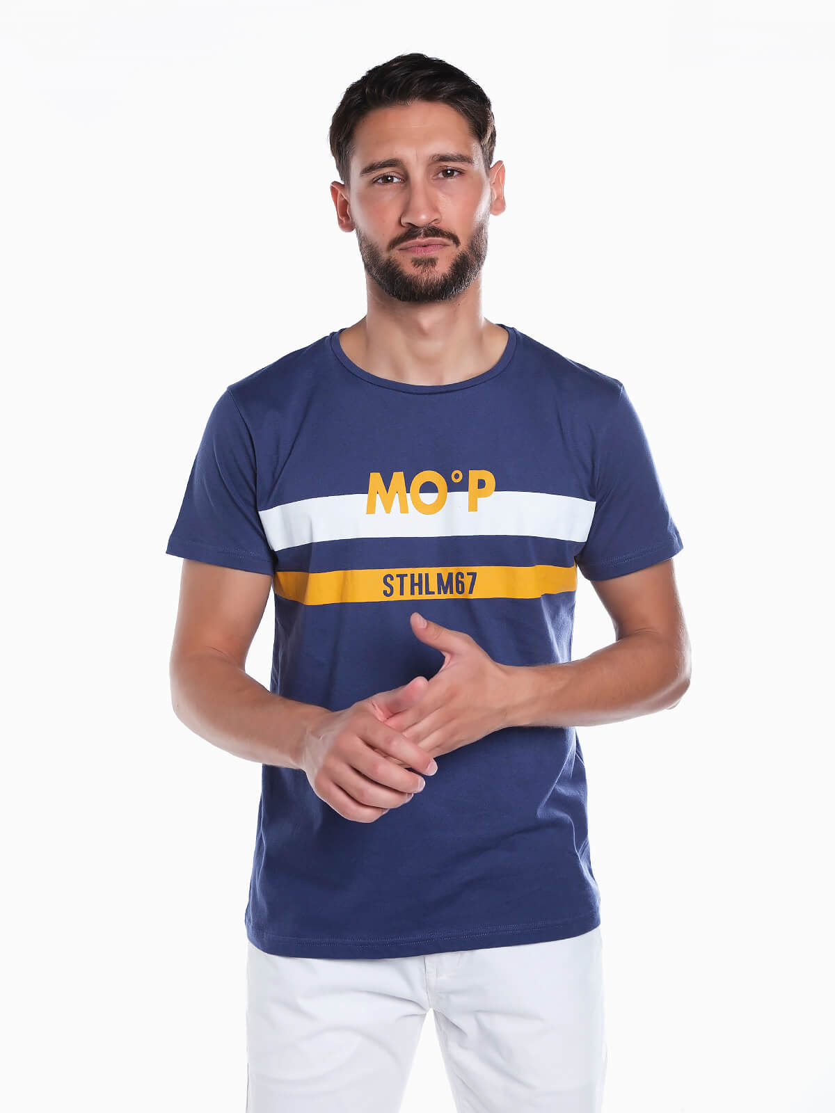 T-shirt de manga curta com encaixe de bandas de cor no peito. T-shirt em tecido 100% algodão com gola redonda.