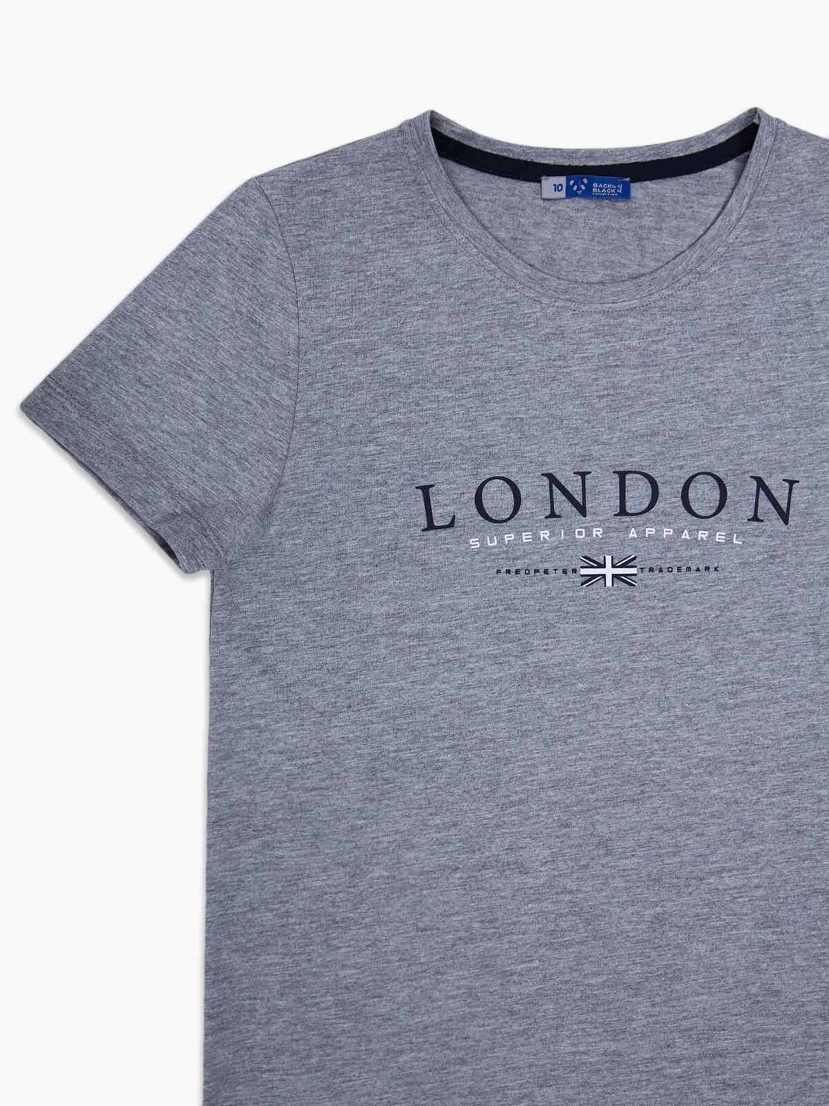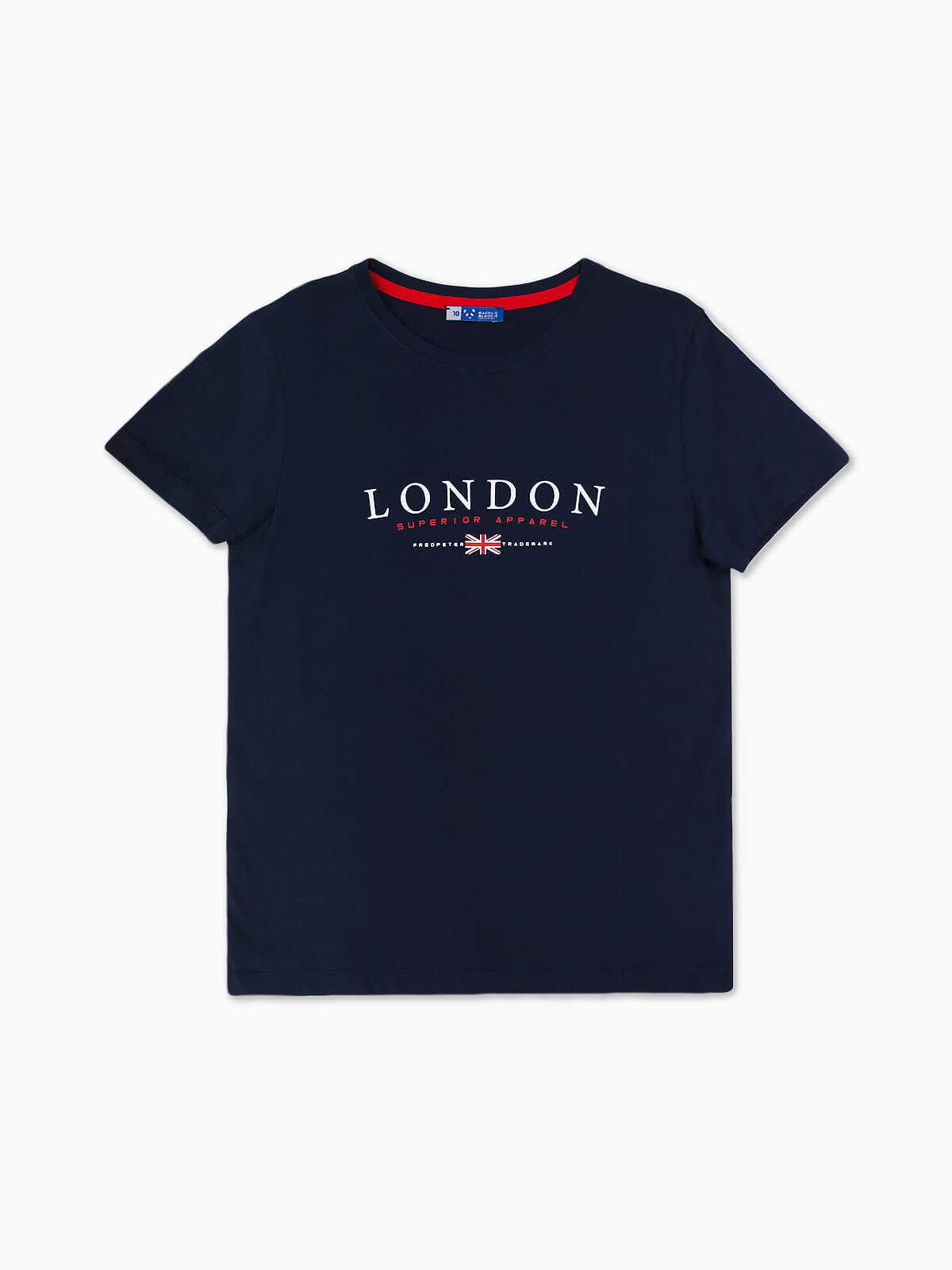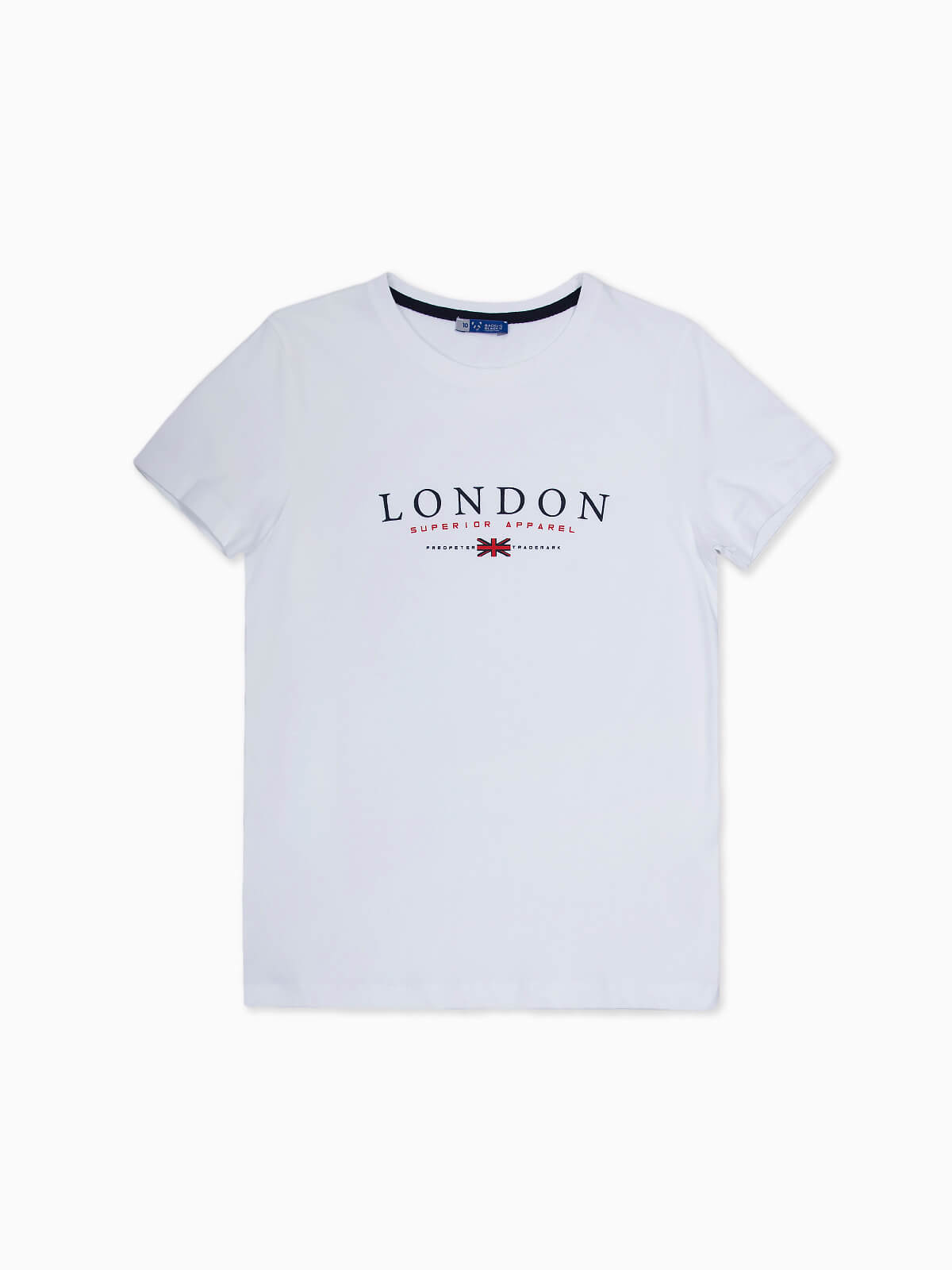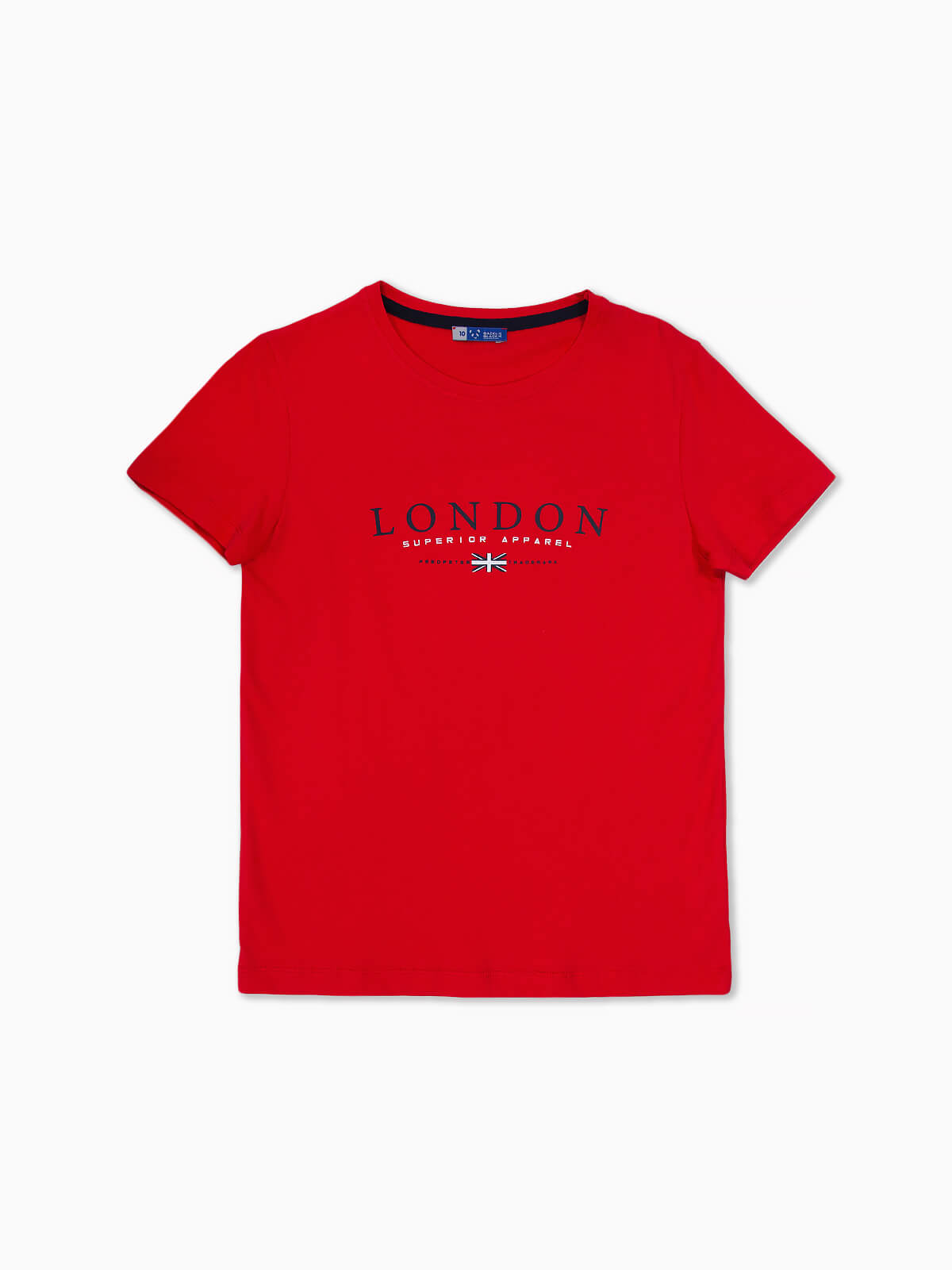 T-shirt de manga curta com estampado de letras no peito e bandeira. T-shirt para menino em 100% algodão de gola redonda.
