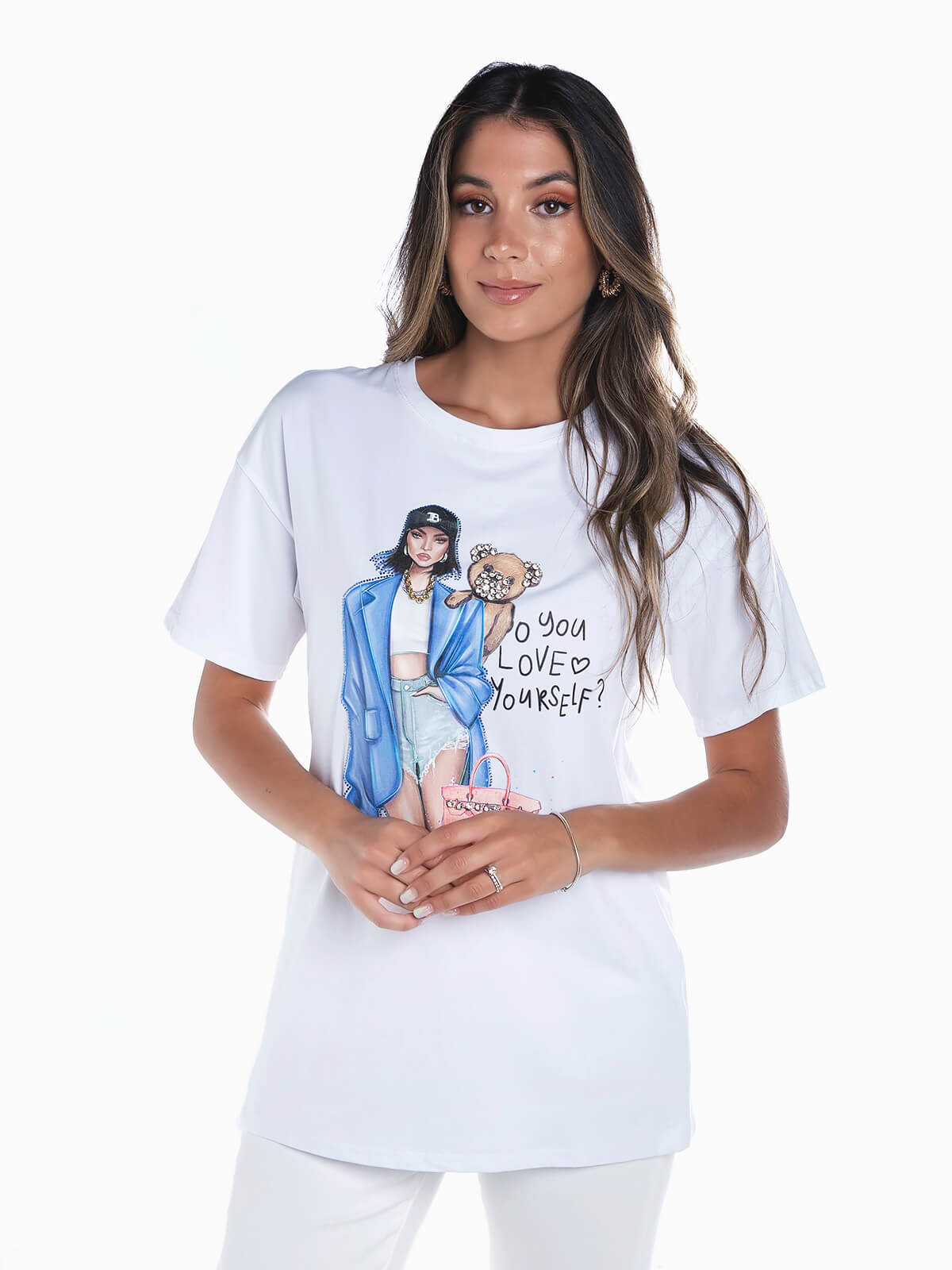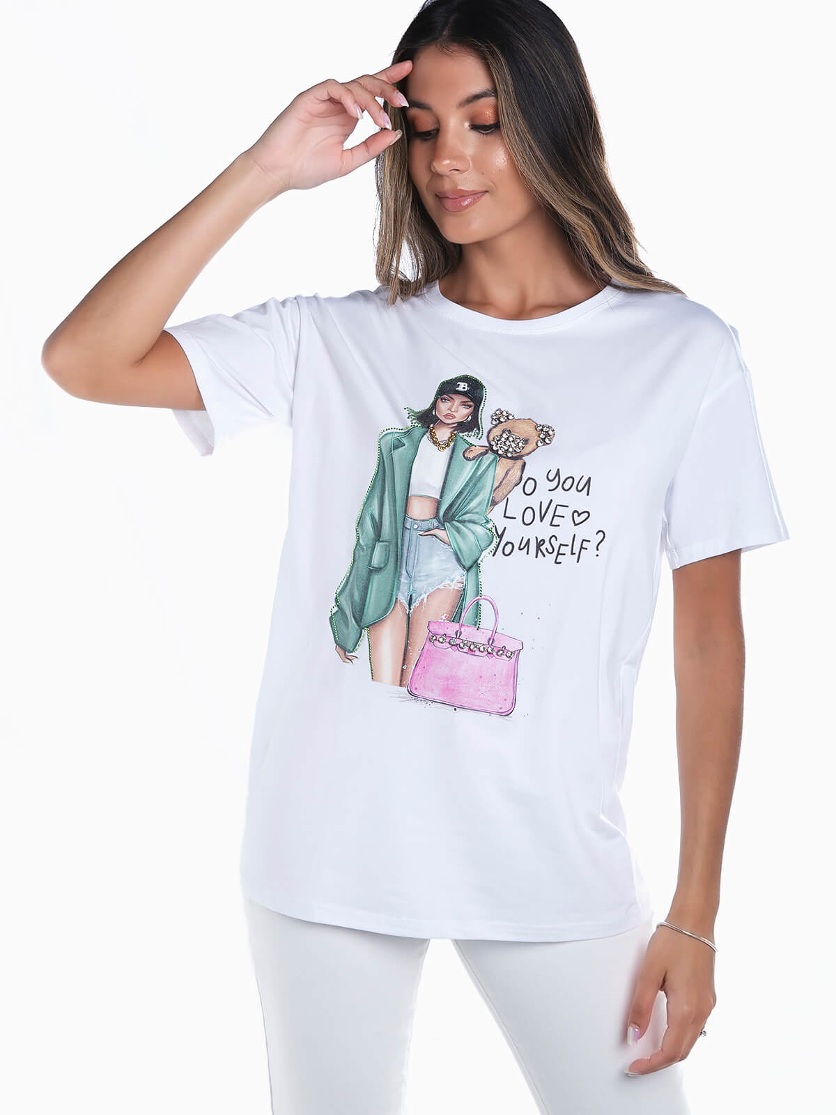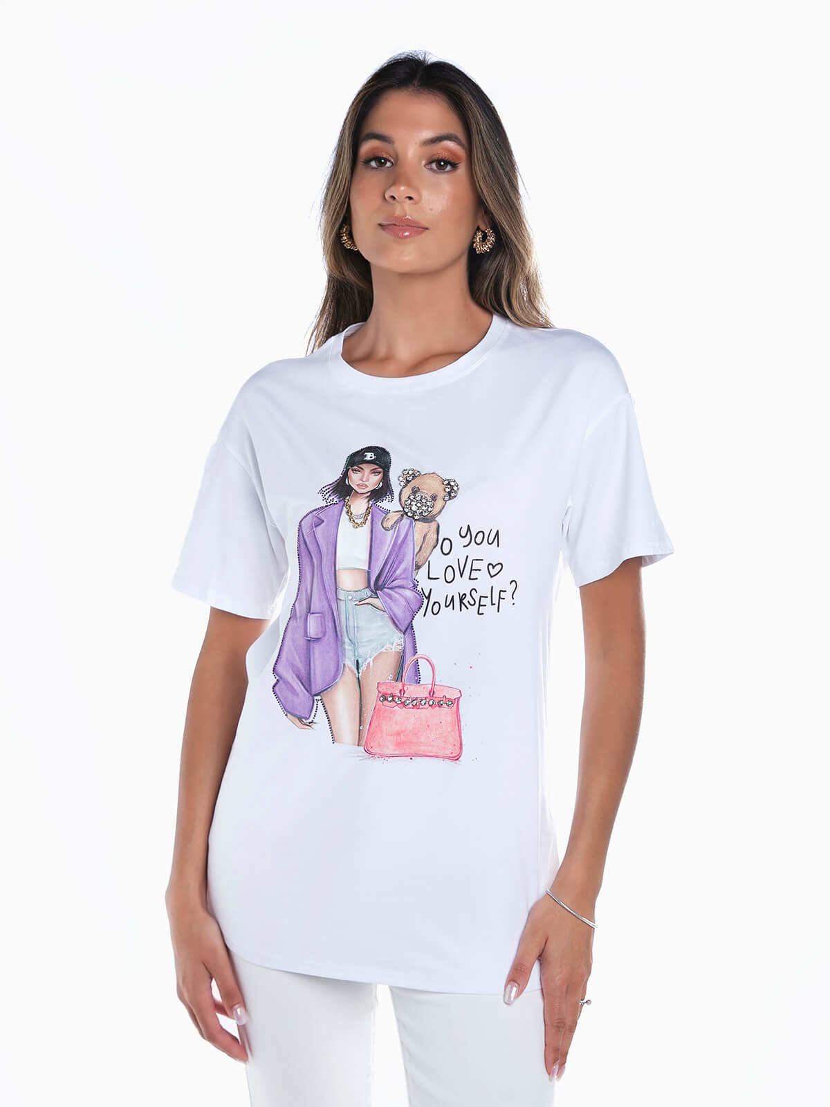 T-shirt de manga curta com estampado de imagem e pormenores brilhantes. T-shirt branca com ombros descaídos e gola redonda.