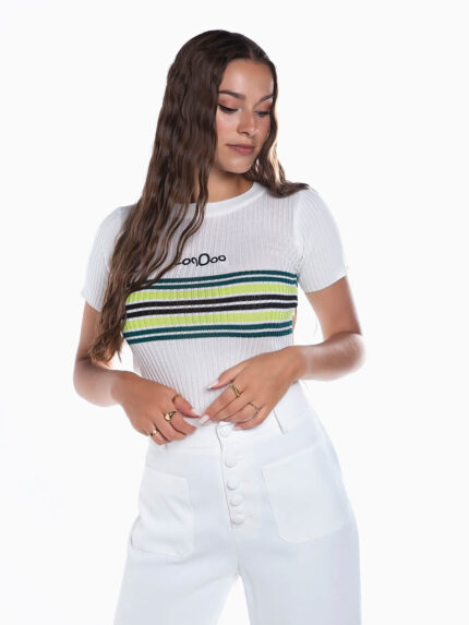 T-shirt de manga curta estampada com pérolas e missangas aplicadas. T-shirt com decote redondo.