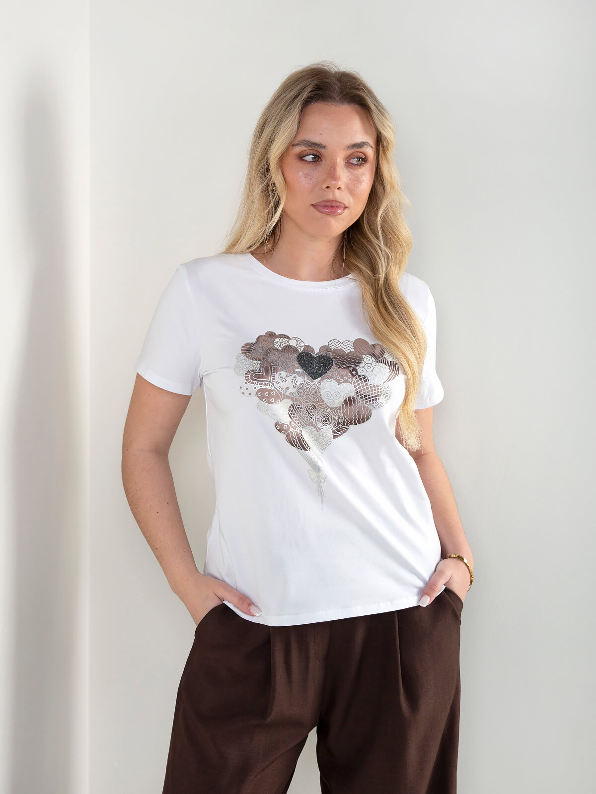 T-shirt de manga curta com estampado frontal de corações e detalhe de brilho que acrescenta um toque especial à peça. Decote redondo.