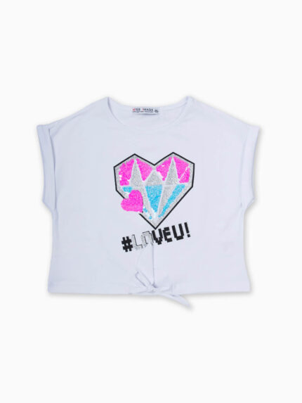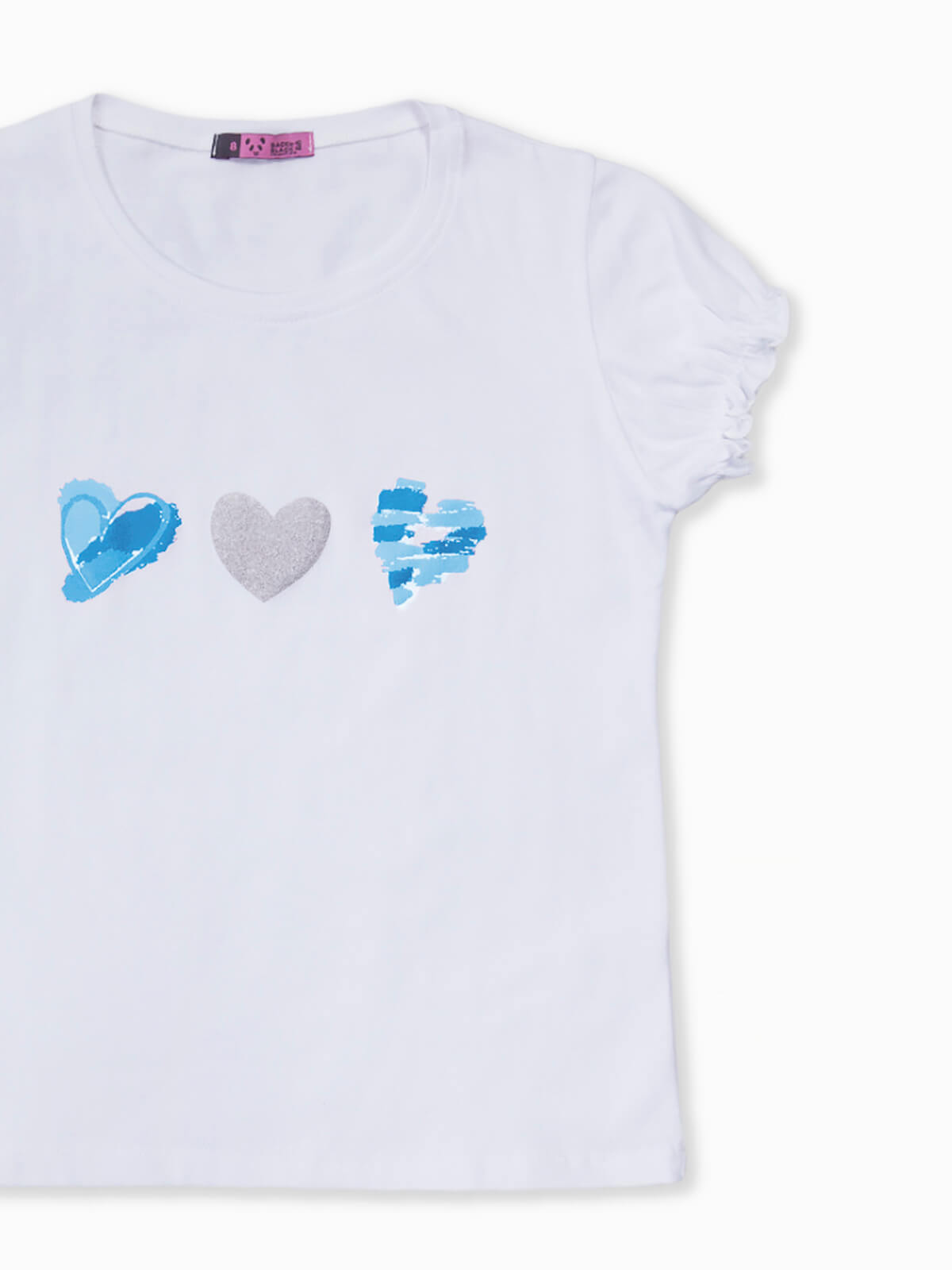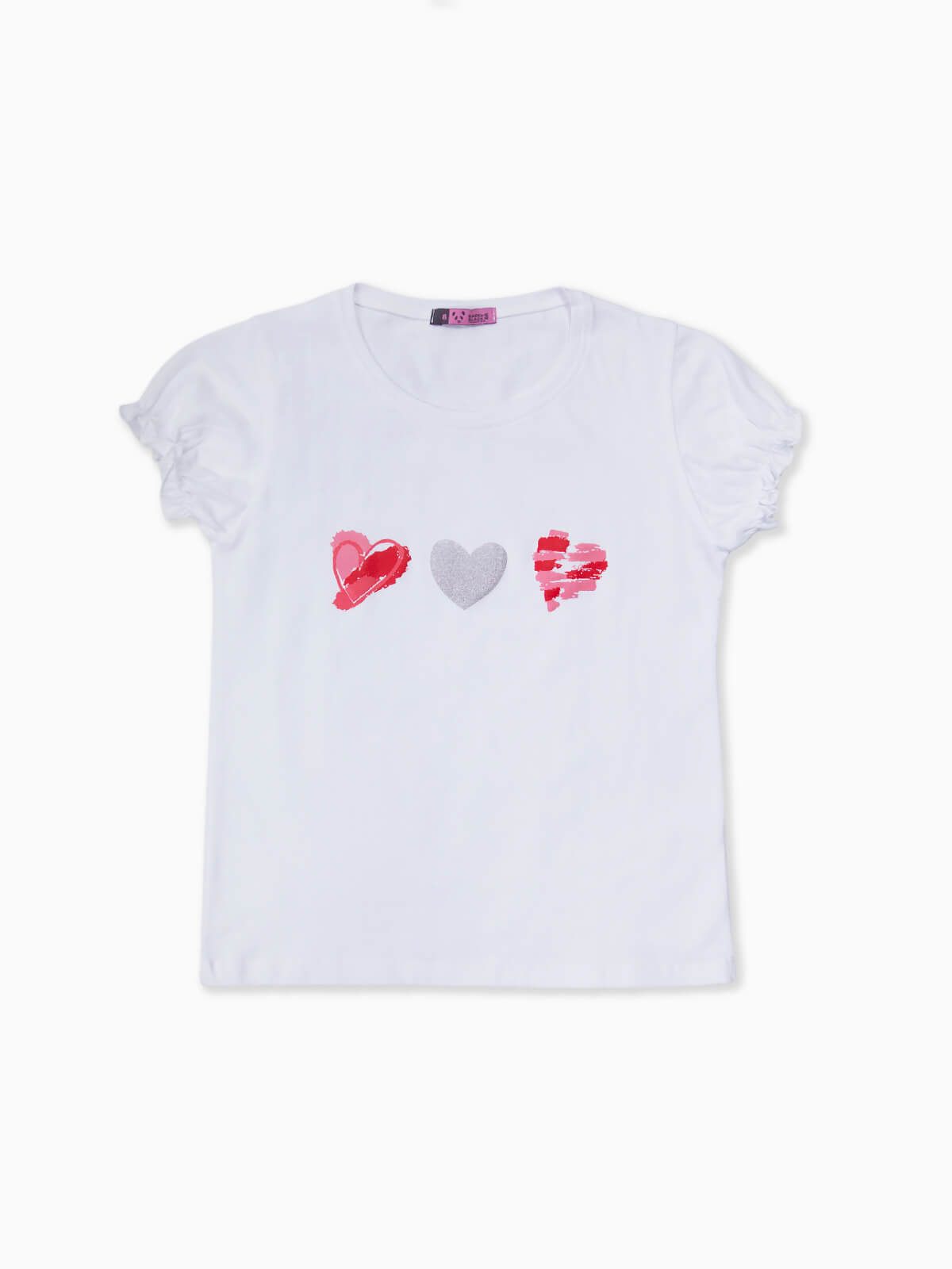 T-shirt de manga curta com estampado de corações para menina. Elástico na manga para efeito. T-shirt em algodão de gola redonda.