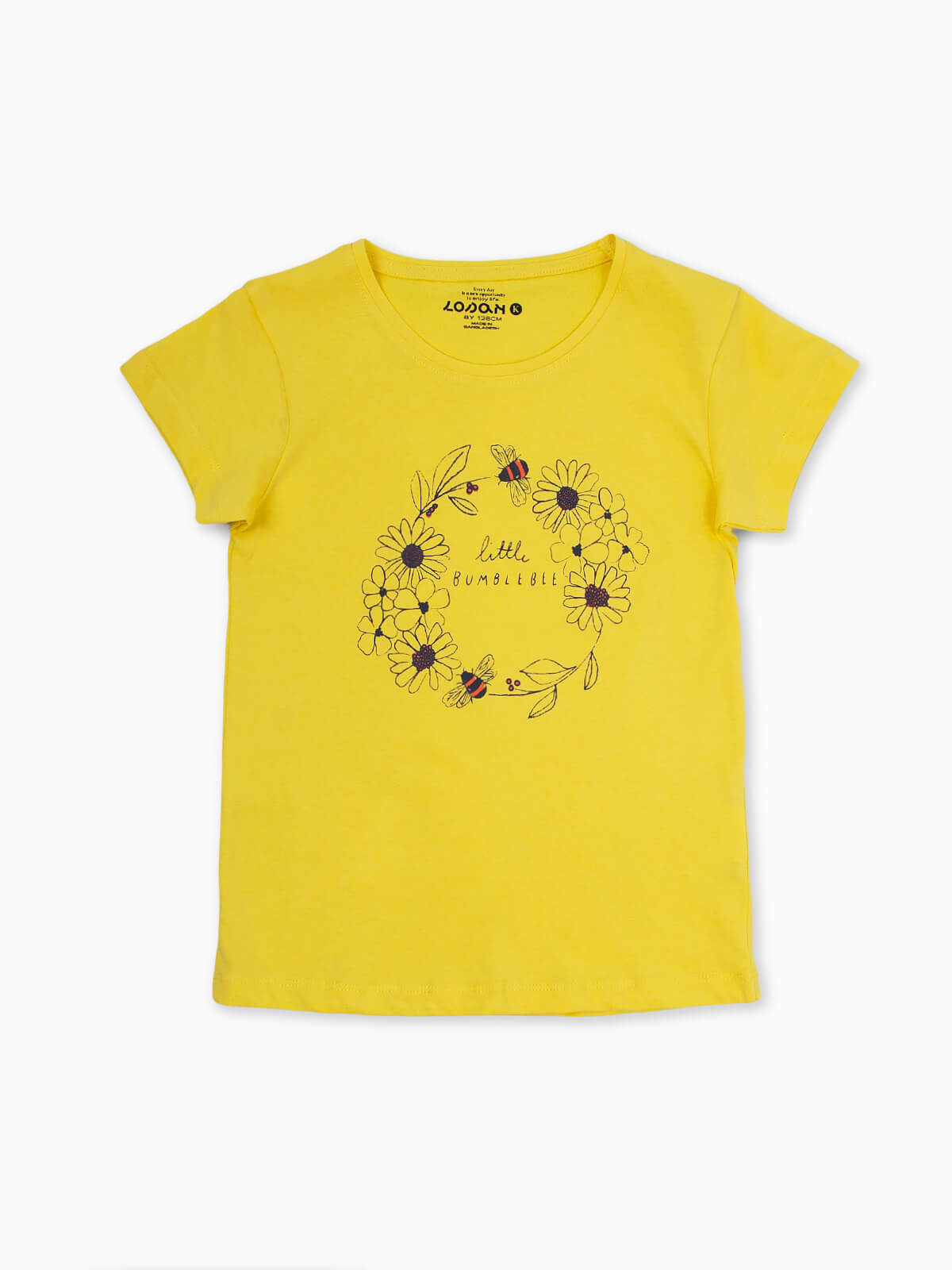 T-shirt de manga curta com estampado de flores e abelhas. T-shirt para menina em tecido 100% algodão com decote redondo.