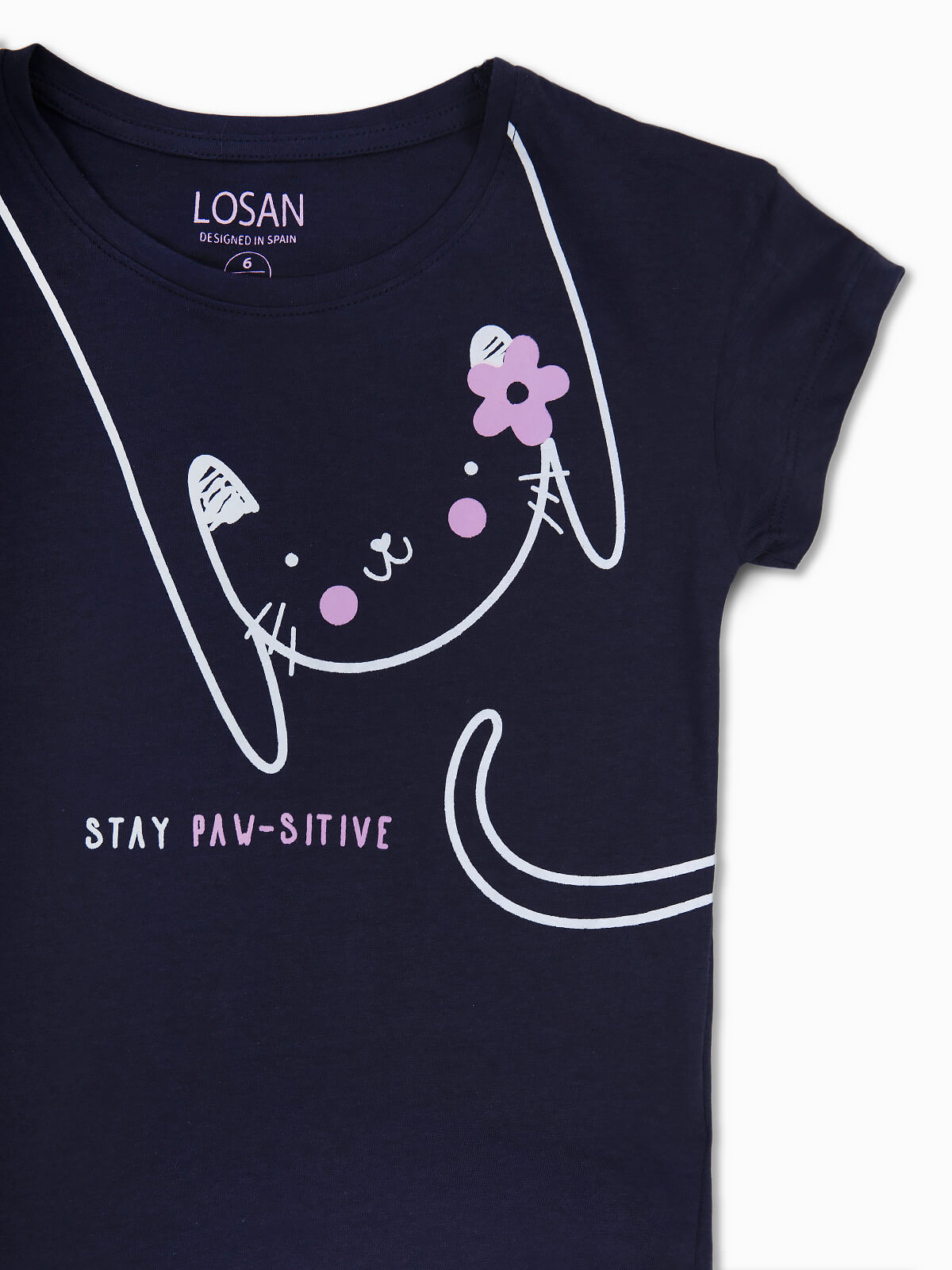 T-shirt de manga curta com estampado de gato e letras. T-shirt em 100% algodão para menina de gola redonda.