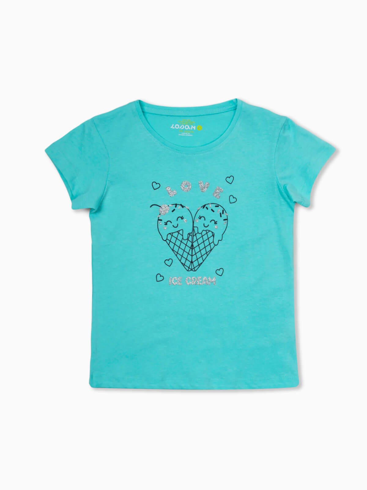 T-shirt de manga curta com estampado de gelados e pormenores brilhantes. T-shirt para menina com decote redondo.
