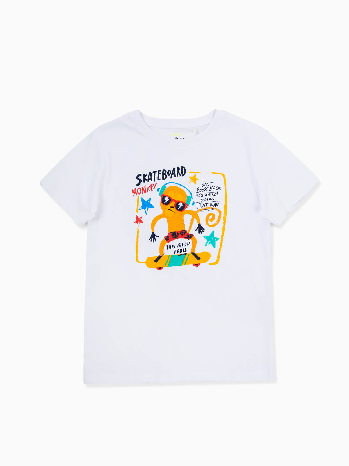 T-shirt de manga curta com estampado de macaco e skate. T-shirt para menino com gola redonda.